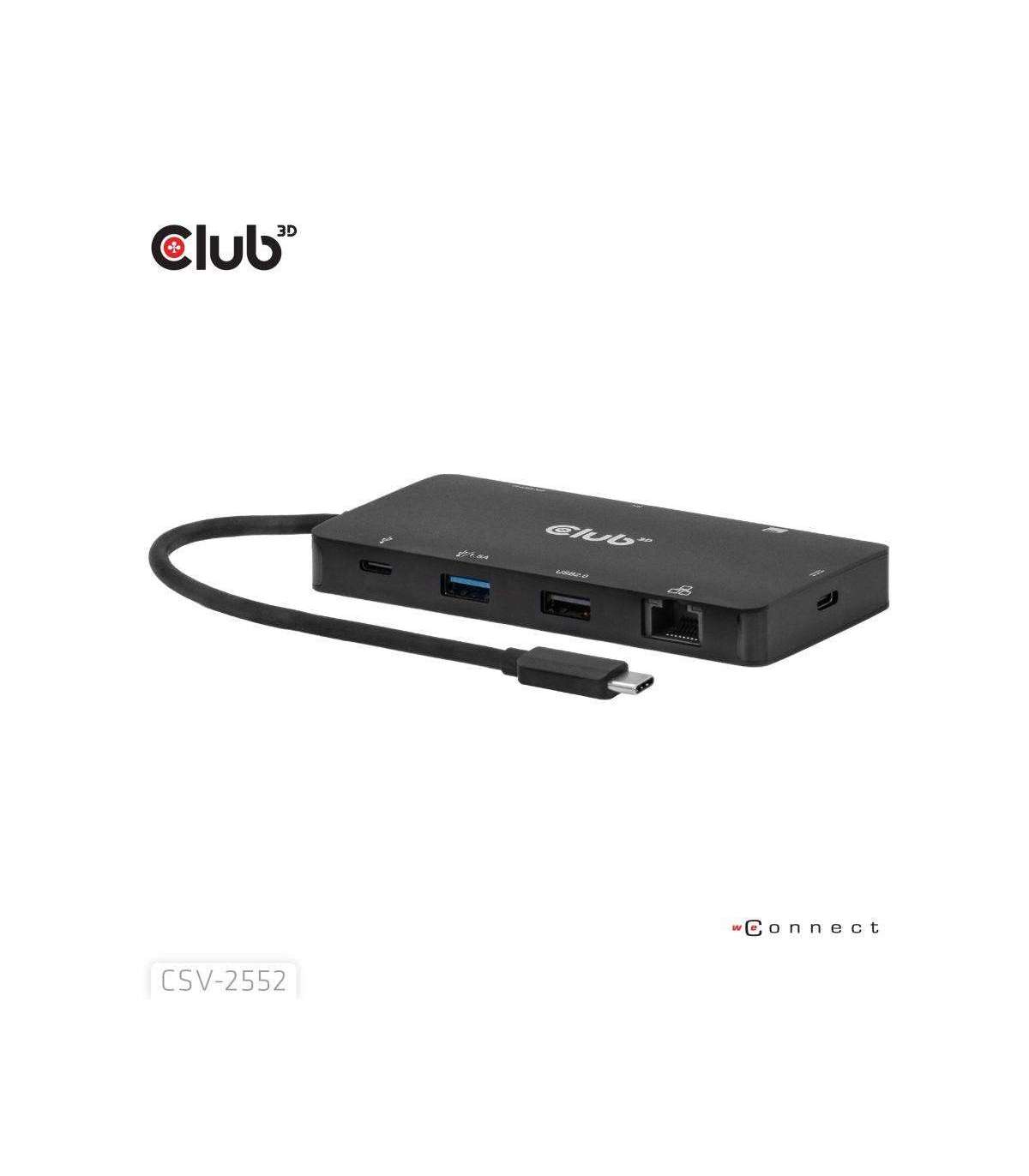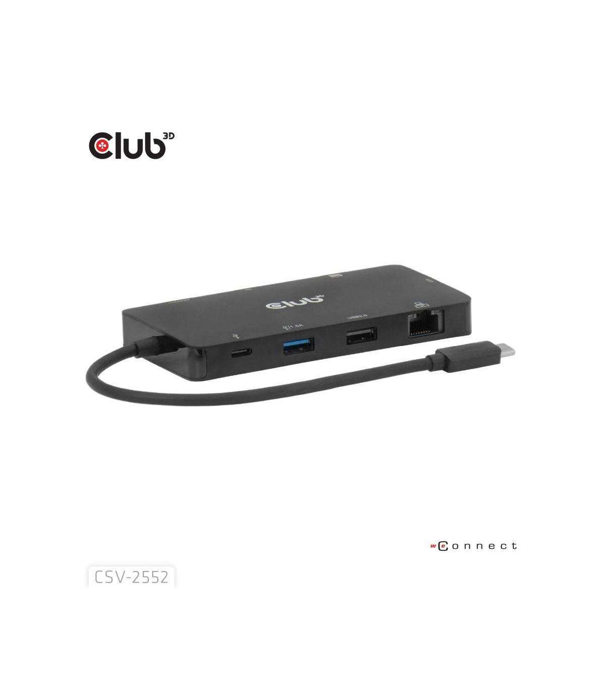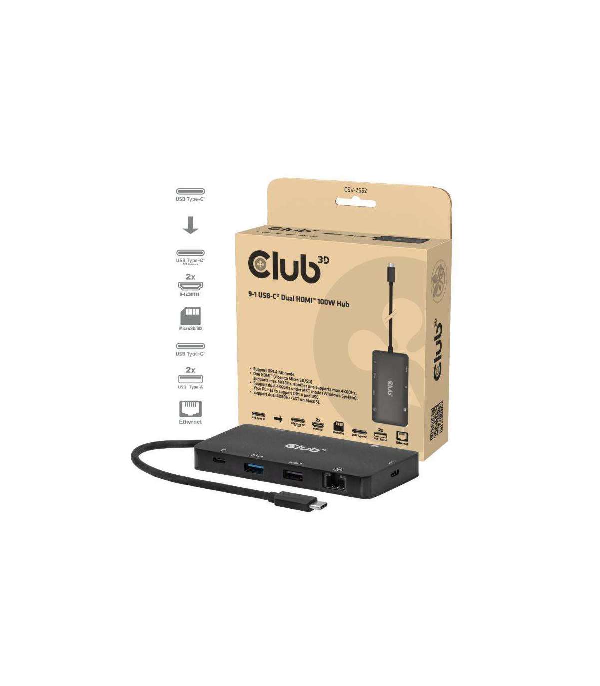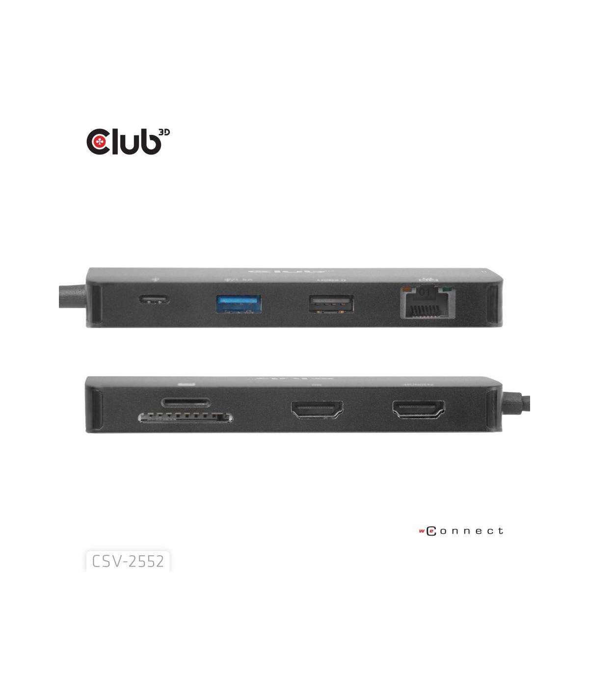 The Club 3D CSV-2552 is a USB-C® 9-1 hub with Dual HDMI™, 2x USB-A, 1x USB-C® data, RJ45, Micro SD/SD card slots and USB-C® charging female port, providing an ideal solution for extending the port of USB-C® or Thunderbolt host (PC/Laptop/Mobile phone, etc.), especially for those host with a single USB-C® port.