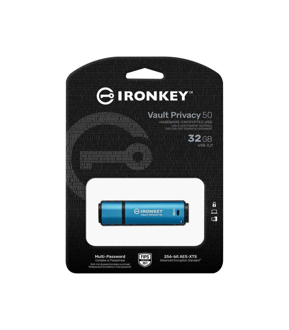 Kingston IronKey™ Vault Privacy 50 series are premium USB drives that provide business-grade security with FIPS 197 certified AES 256-bit hardware-encryption in XTS mode, including safeguards against BadUSB with digitally-signed firmware and against Brute Force password attacks. VP50 series is also TAA compliant. Because it is encrypted storage under the user’s physical control, VP50 series are superior to using the internet and Cloud services to safeguard data.