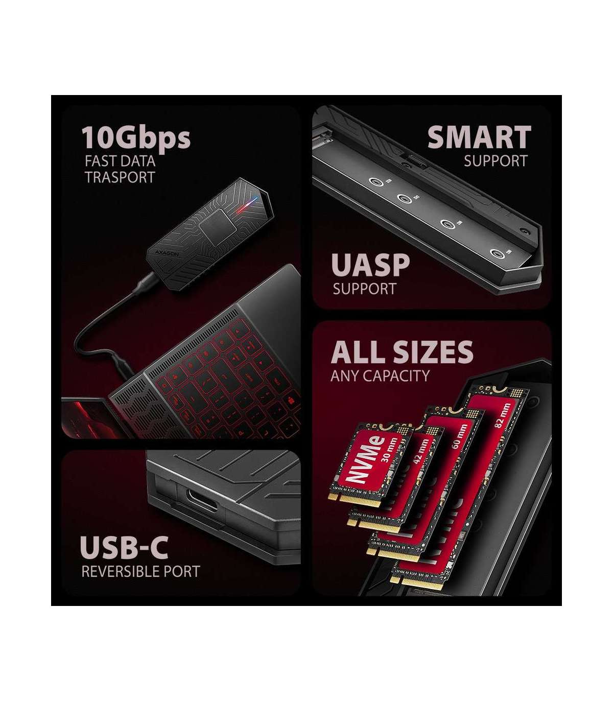 - USB-C 10Gbps - M.2 NVMe and SATA SSD GAME M.2 box