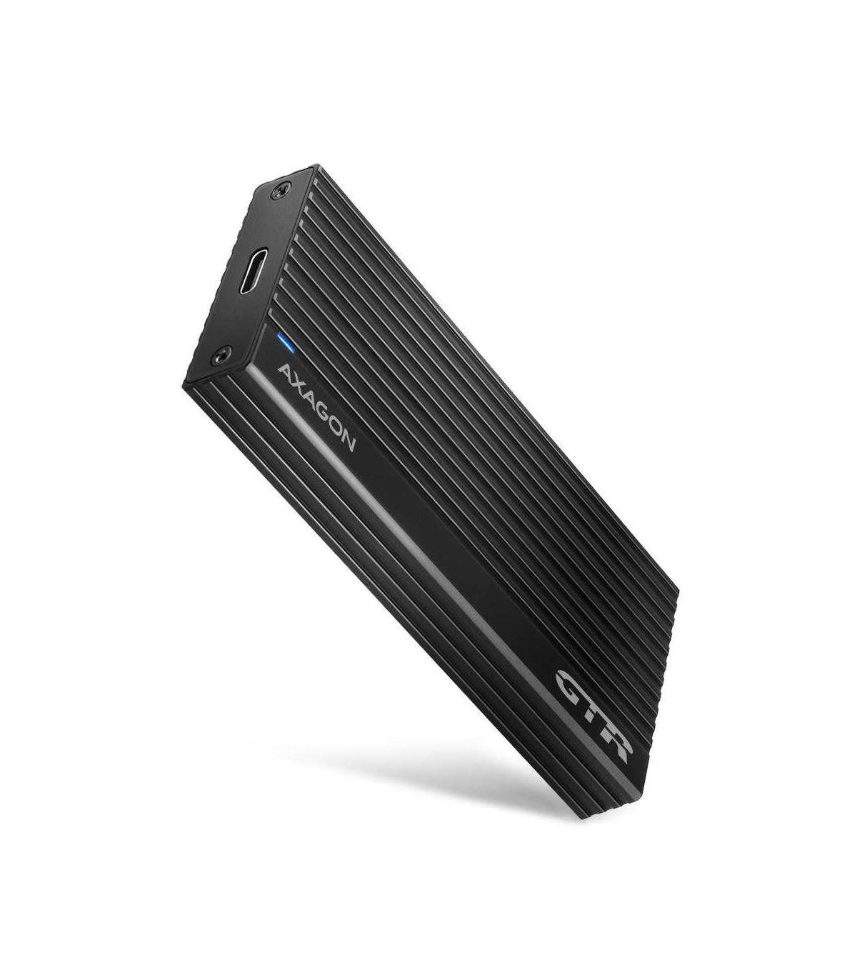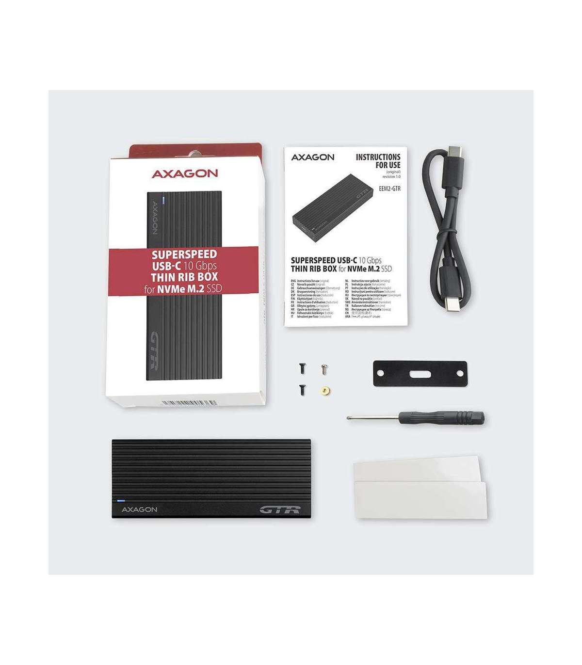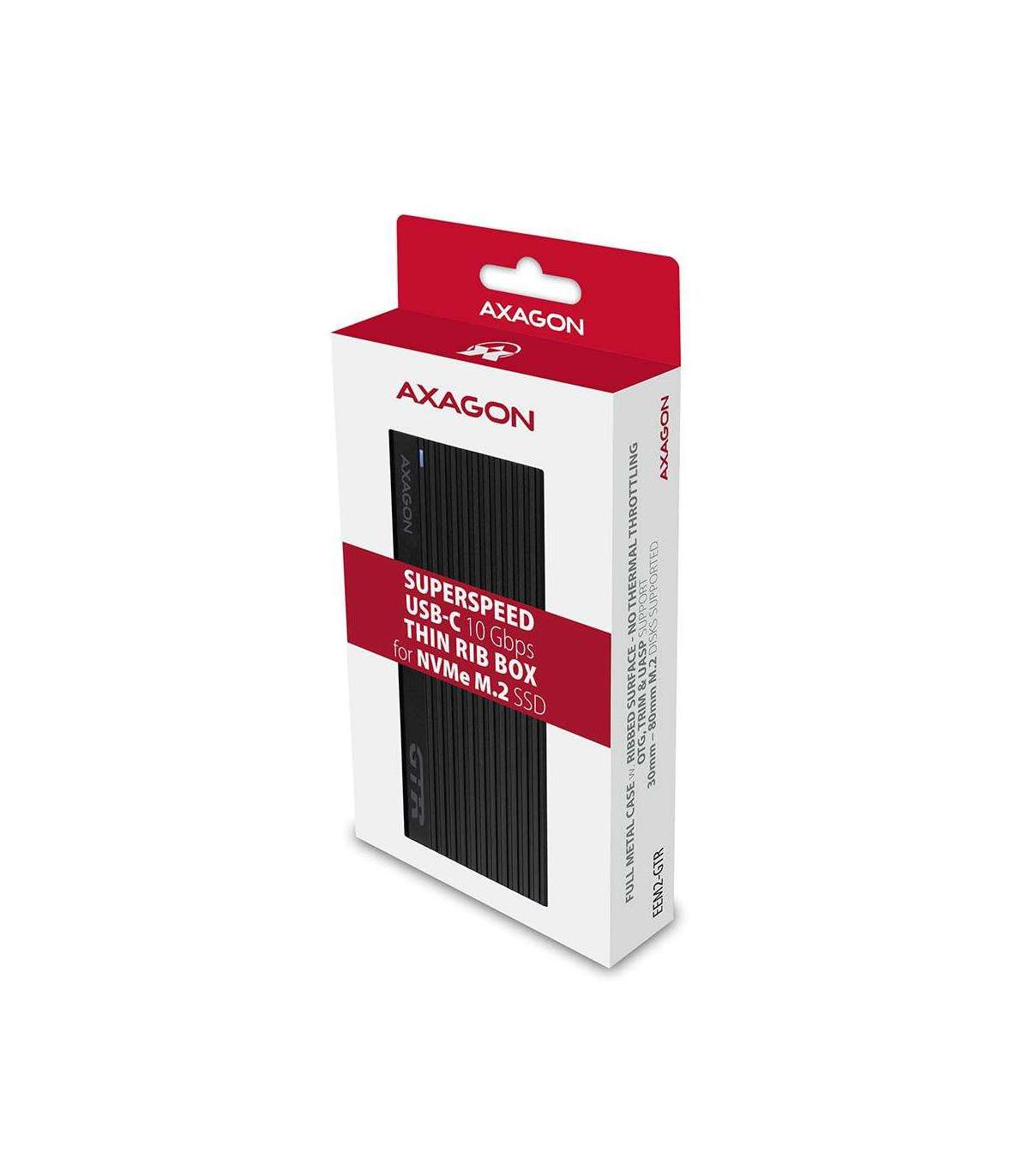 Superfast external AXAGON EEM2-GTR THIN RIB box with USB 3.2 Gen 2 interface is designed for NVMe (PCI-Express) M.2 SSD disks. The double-sided USB-C connector on the box together with the supplied USB-C -> USB-C cable enables a reliable connection to a computer.