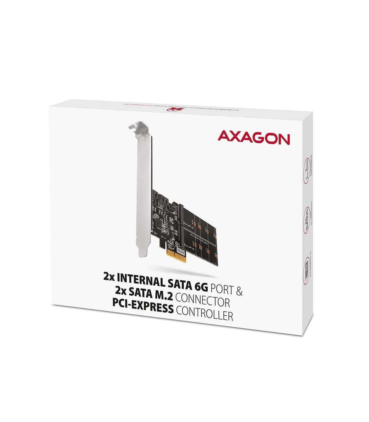 The AXAGON PCES-SA4M2 PCI-Express controller extends your desktop PC with two SATA III ports and two slots for SATA M.2 disks with a transmission rate up to 6Gb/s. The combination of a two-port SATA III controller and two SATA M.2 slots makes the card a very useful device for expanding your computer. You can easily connect up to four disks, such as two 3.5" disks or optical drives and two SATA M.2 disks.