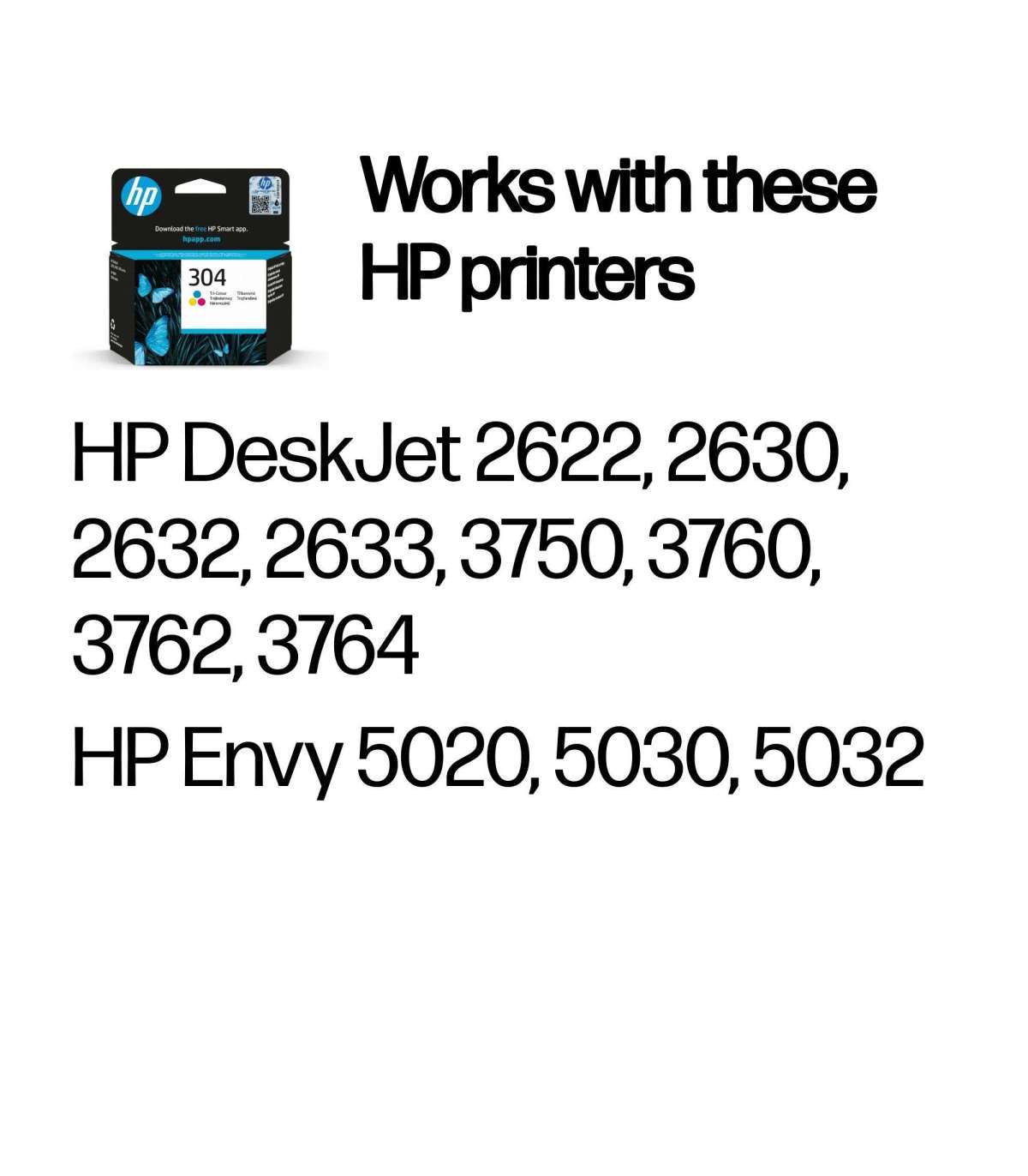 - HP 304 ink cartridges work with: HP DeskJet 2622, 2630, 2632, 2633, 2634, 3750, 3760, 3762, 3764 HP Envy 5020, 5030, 5032