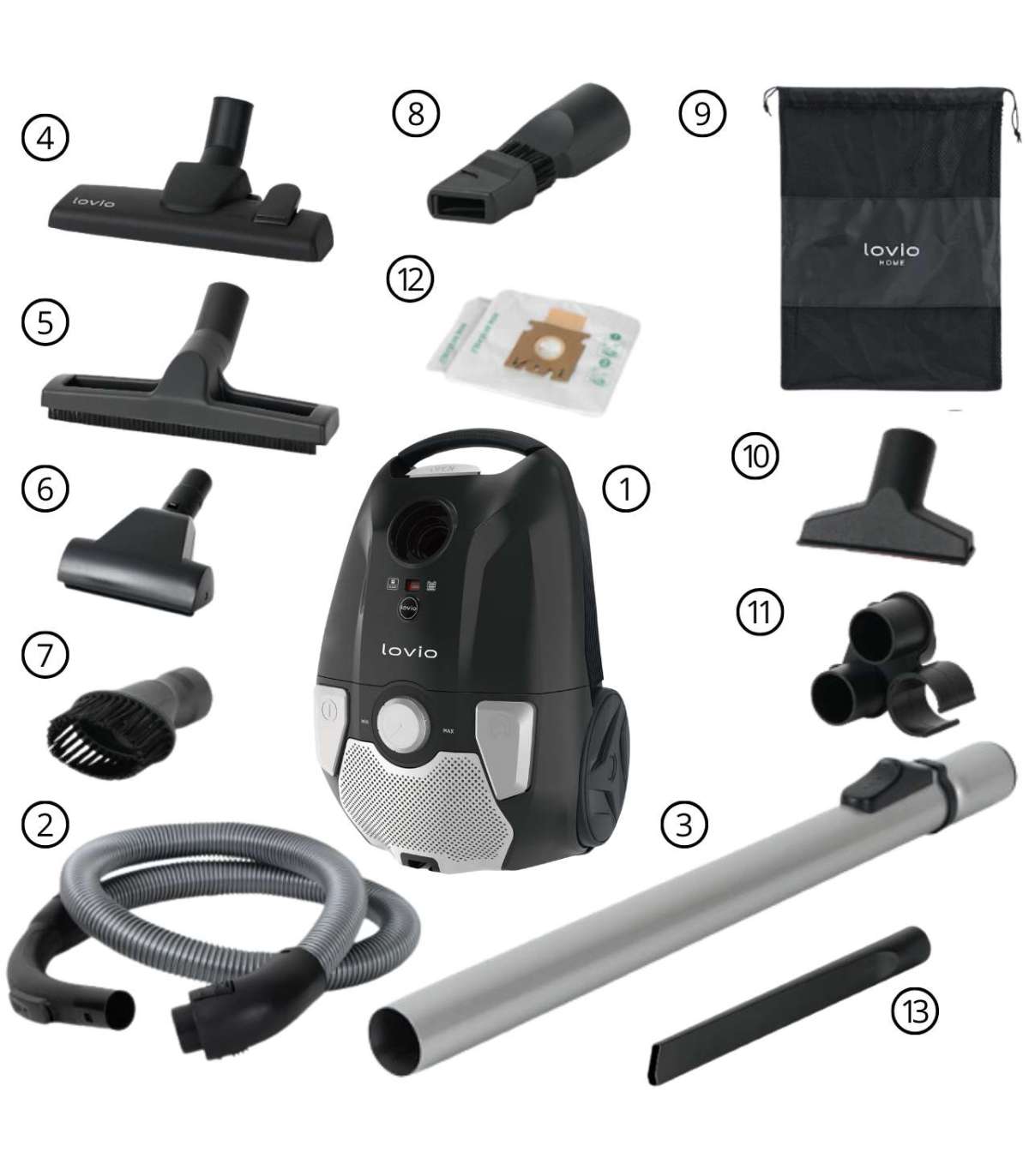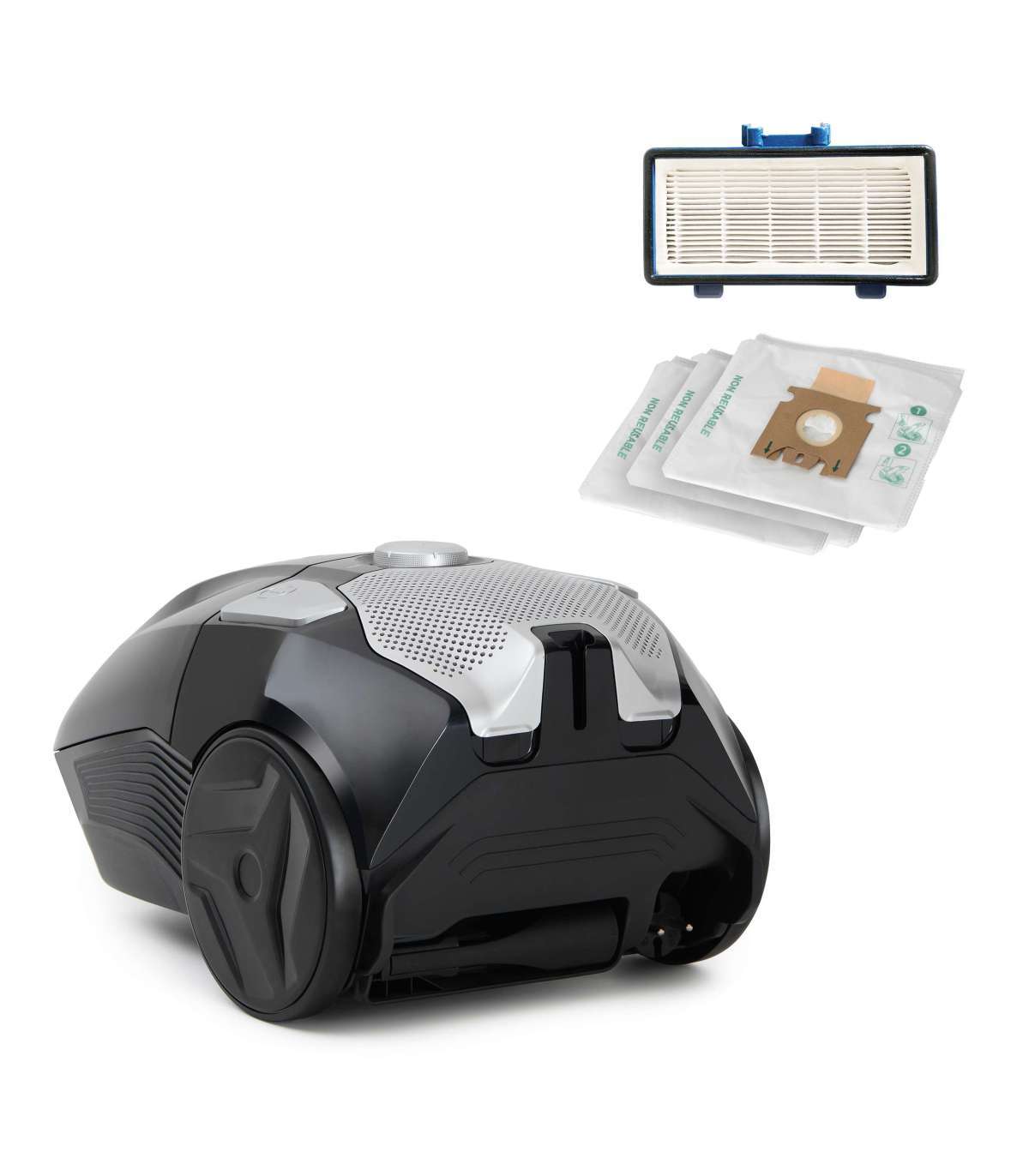 Kaasas varustus: 3 HEPA kotti, kroomitud teleskooptoru, suur universaalne hari, mini turbohari, ümmarguste harjastega hari, 2-in-1 lõheotsik, pika lõheotsik, parketihari, väike otsik, filtrikomplekt, kinnitusklamber