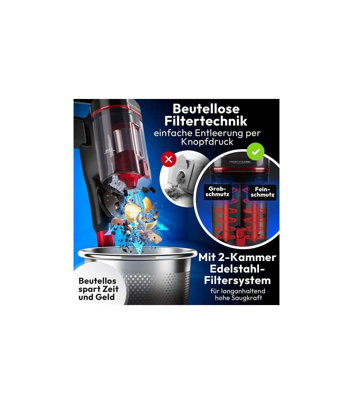 2 imemiskambriga roostevabast terastest filtritega süsteem tagab stabiilselt kõrge imemisvõimsuse ja ei vaja tolmukotti. Tühjendamine toimub vaid ühe nupuvajutusega.