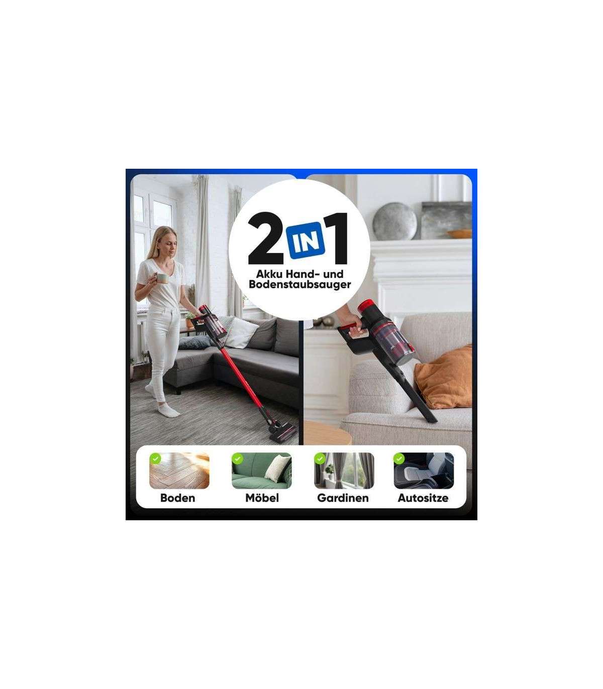 Funktsioon 2-in-1 võimaldab seda kasutada põranda- ja käsitolmuimejana, mis sobib ideaalselt mööbli, polstri, kardinate või turvatoolide jaoks.