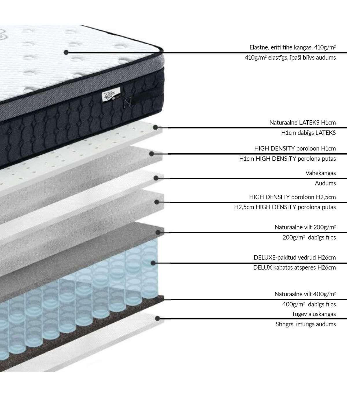 Vedrumadrats HARMONY DELUX 160x200cm. PERFECT SLEEP BY HOME4YOU. Jäigema vedrustusega ja naturaalse lateksi kihiga kvaliteetne vedrumadrats on kõrgusega 30cm. Madratsil on pakitud deluxe-pocket vedrustus (2,3mm/jäik). Hele stretch-kangast madratsikate on nahasõbralikust ja pehmest puuvilla-polüestrist (kangakaal 410g/m2). Madratsis on pealmiseks kihiks naturaalne lateks, mis on pehme, elastne, õhku läbilaskev ning reguleerib ise oma niiskussisaldust. Lisaks on madratsis kaks erinevat kvaliteetset poroloonikihti, mis tagavad lihaste ja luustiku maksimaalse lõdvestuse. Kangas, vilt ja vatiin vastavad rahvusvahelisele Öko-Tex 100 standardile. Madrats on pakitud rulli, et seda oleks lihtsam transportida. Madrats vajab oma esialgse kuju taastamiseks kuni 2 tundi aega. Eemaldage ettevaatlikult kilepakend ja asetage madrats voodi peale. Toote mõõdud on 160x200xH30cm.