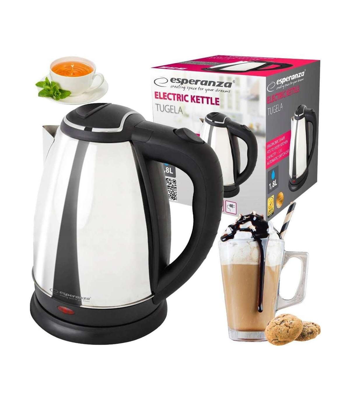 Moodne ja elegantne roostevabast terasest kroomitud korpusega juhtmeta veekeetja Esperanza EKK104S.