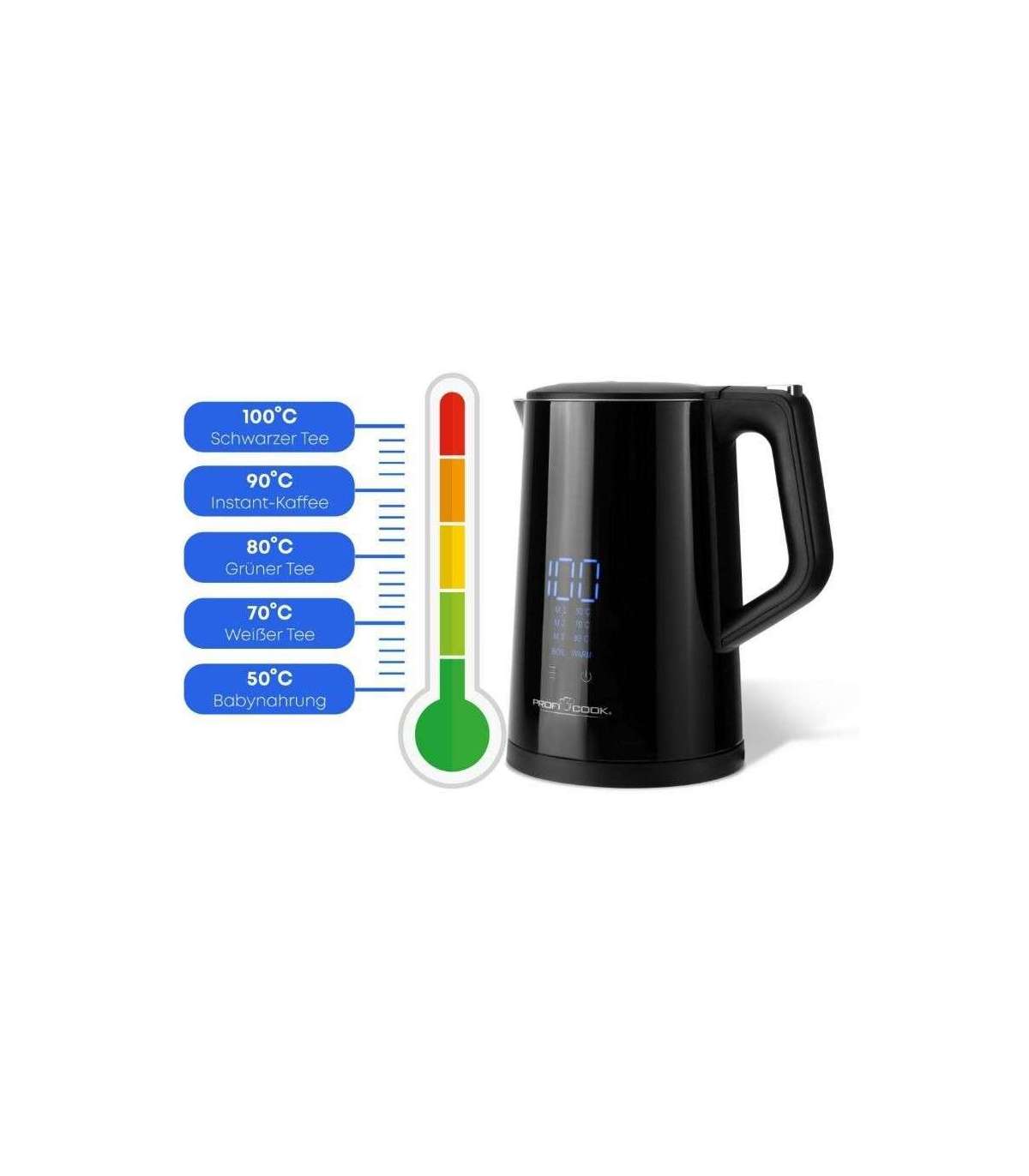 Tänu elektroonilisele temperatuuri seadistusele vahemikus 50°C kuni 100°C saab lihtsasti valida individuaalseid temperatuuritasemeid 50°C, 70°C, 80°C ja 100°C.