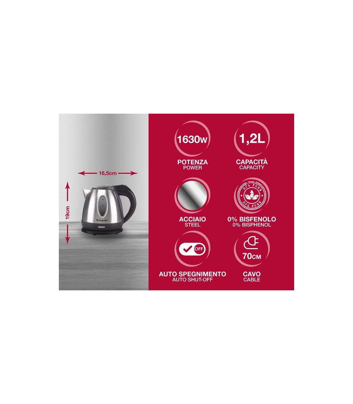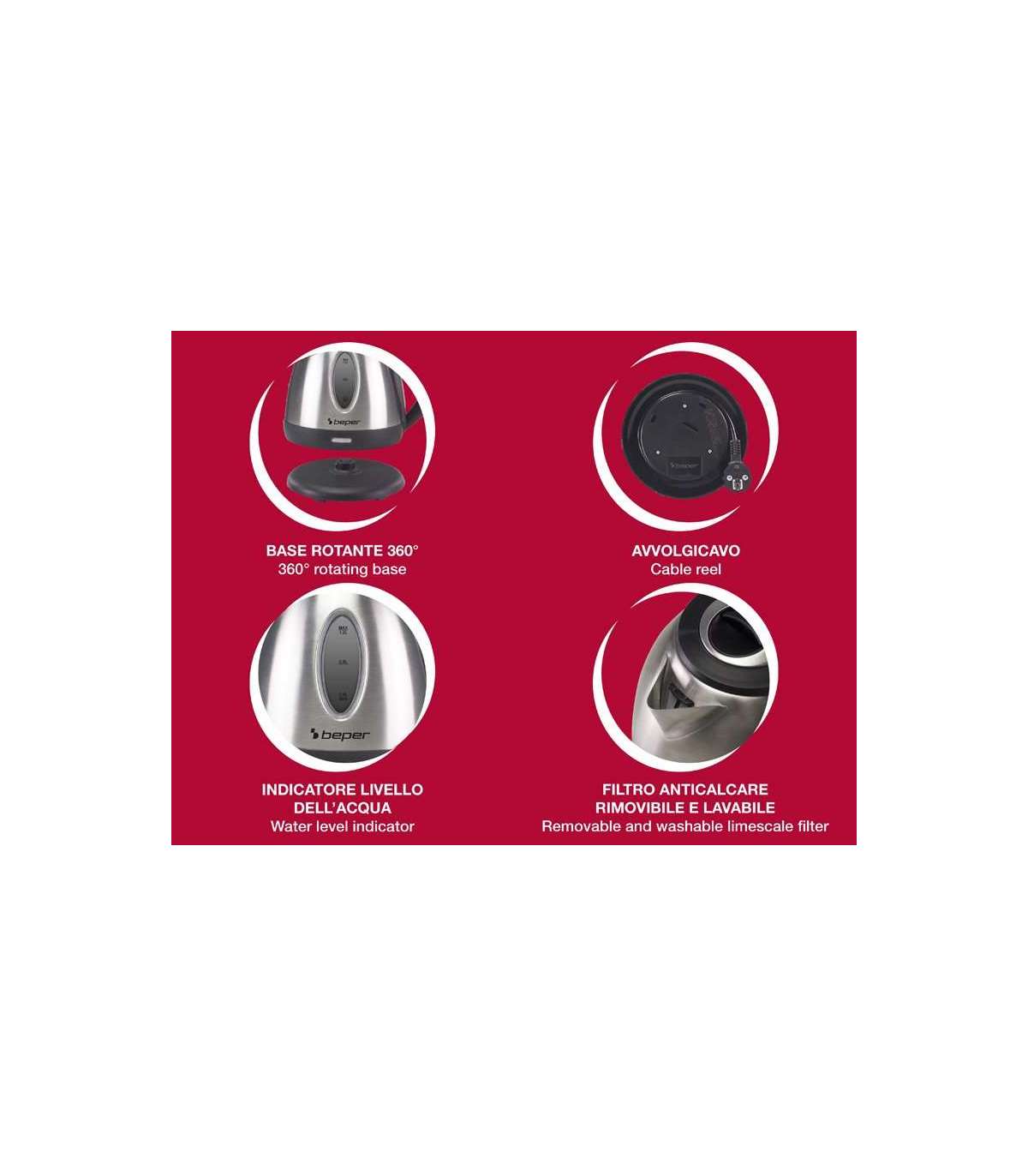 Juhtmeta veekeetja mugavaks laua ääres serveerimiseks. 1,2-liitrine teraskarahvin veetaseme indikaatoriga. Peidetud kütteelemendid ja terasest kütteplaat. Varustatud operatsioonivalgusti, eemaldatava ja pestava katlakivivastase filtriga. Automaatne väljalülitus, kui temperatuur on saavutatud, ja automaatne väljalülitus vedelike puudumisel. 360 kraadi pöörlev alus koos kaablikerijaga. Kaitse ülekuumenemise eest. BPA vaba.