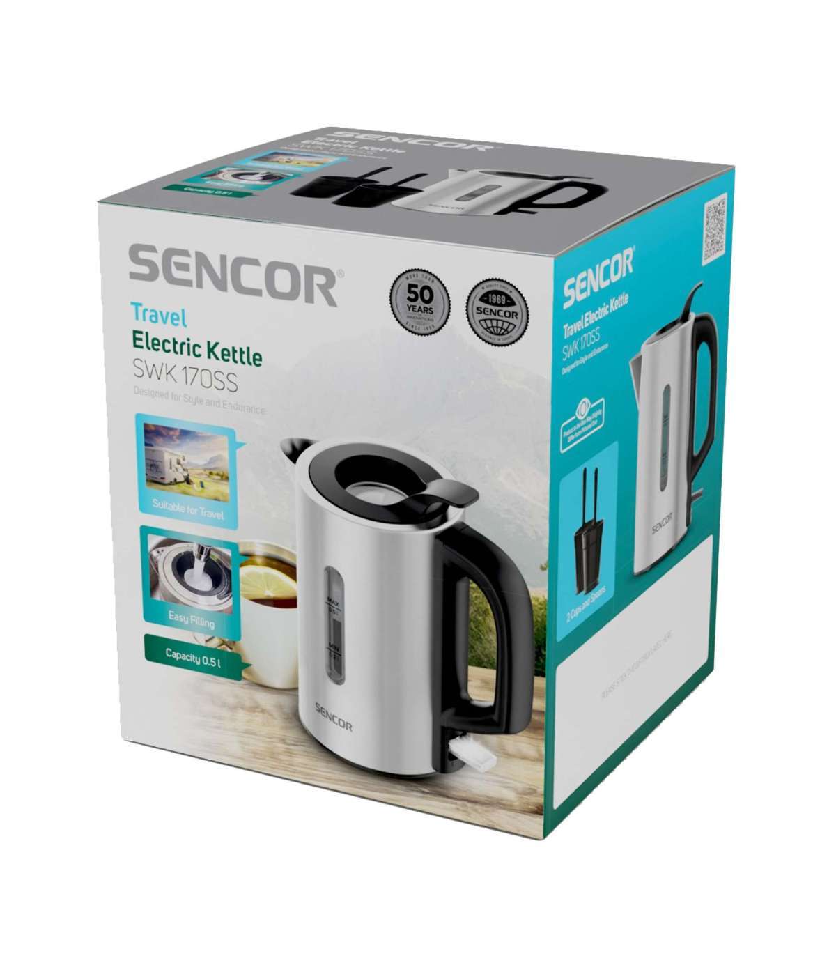 Väike ja kompaktne veekeetja Sencor SWK170SS sobib ideaalselt reisimiseks, haagissuvilasse, jahti või lihtsalt väikeses köögis ruumi kokkuhoiuks. Veekeetja mahutavus on 0,5 liitrit vett ja see on valmistatud kvaliteetsest roostevabast terasest. 1100 W peidetud küttekeha tagab kiire kuuma vee valmistamise. Veega täitmine on lihtne praktilise kaane kaudu, mida ei pea avama ega maha võtma. Veetaset saab kontrollida veekeetja küljel oleva läbipaistva akna kaudu.