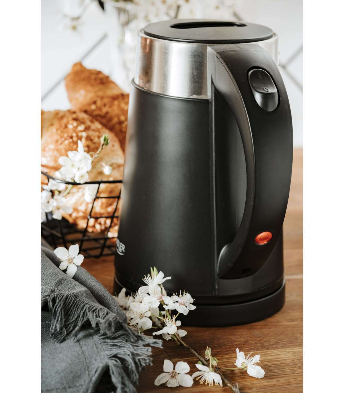 Double-wall housing. High grade flat stainless steel heating element. Automatic protection against boiled without water. Control lamp. Double housing kettle: stainless steel (inside), plastic (outside)
