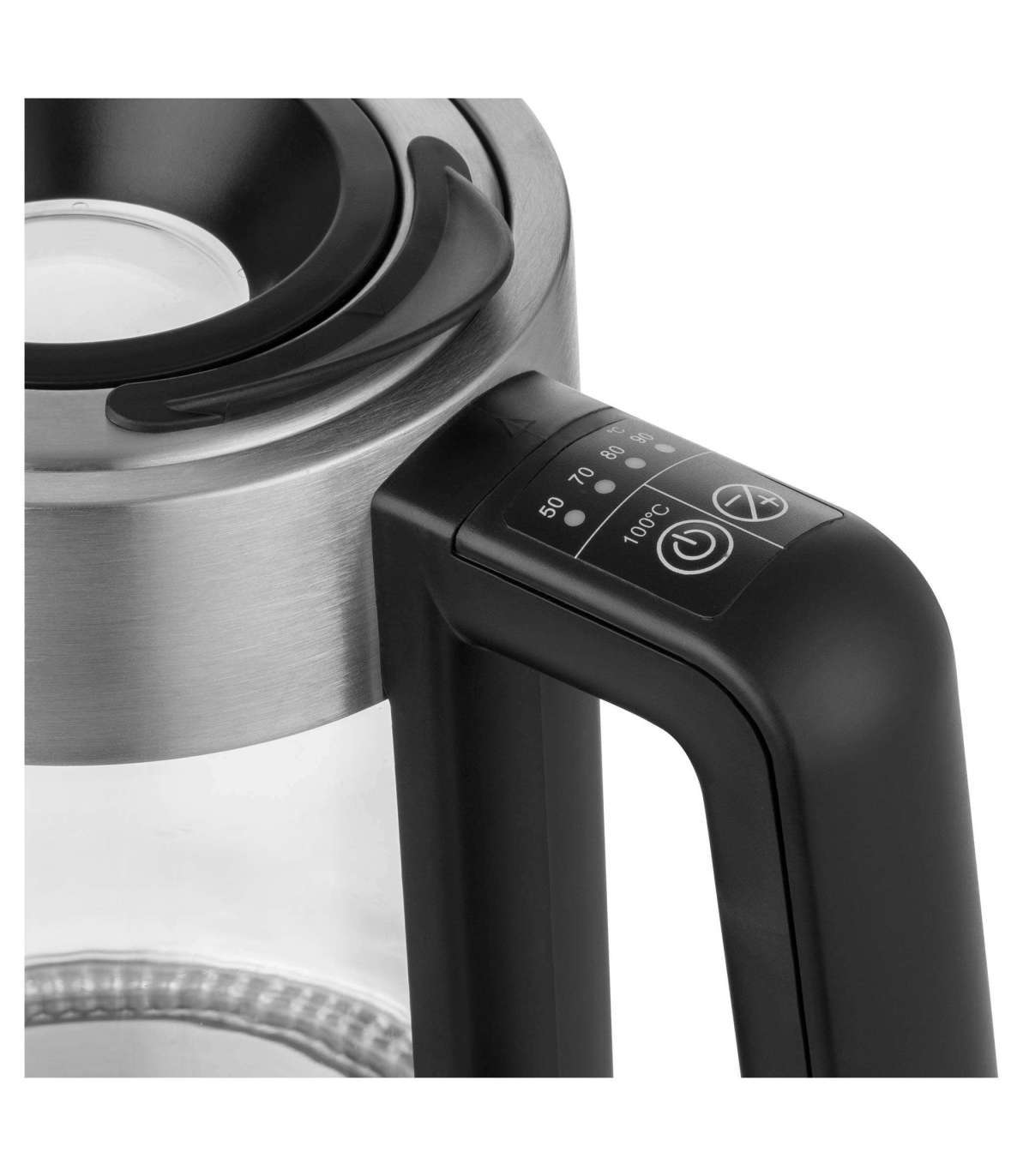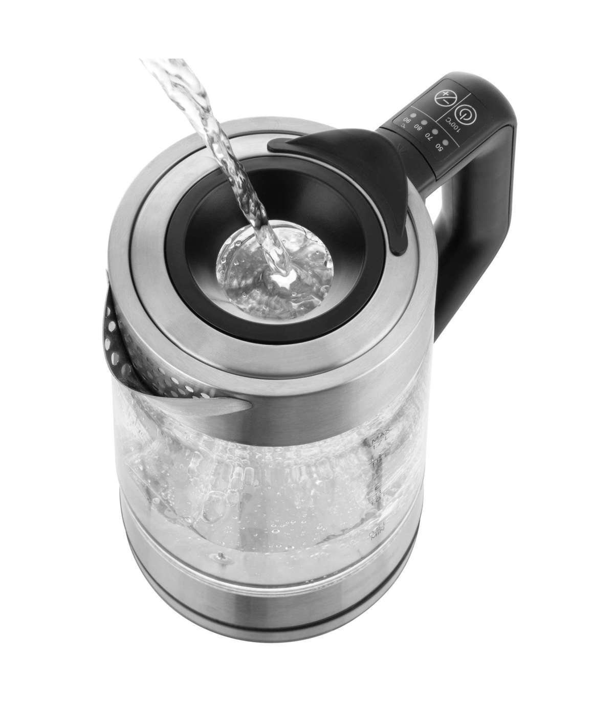 Elegantse klaas + roostevaba teras disainiga veekeetja koos LED värvide põhjal eristatava temperatuurivalikutega.
