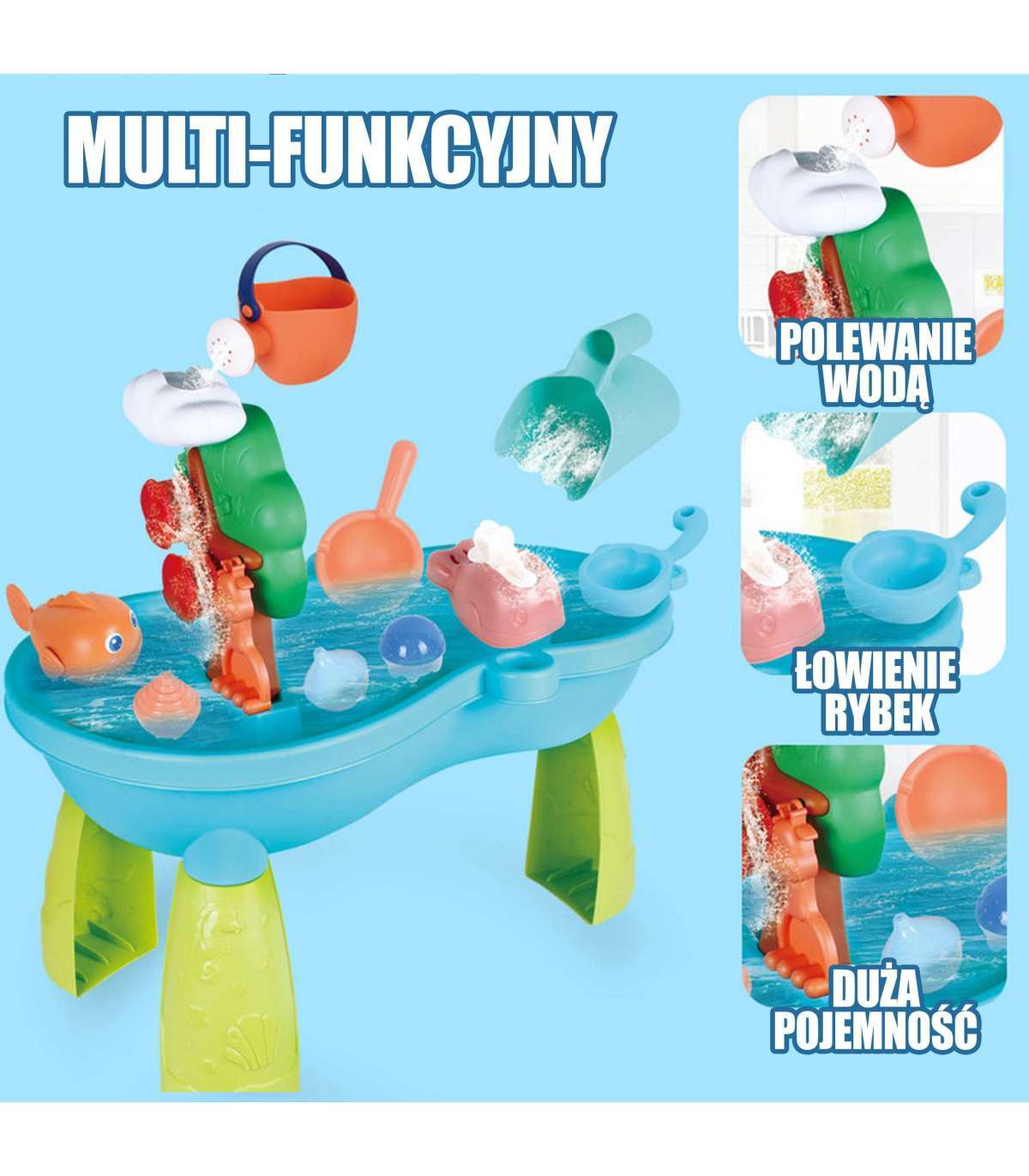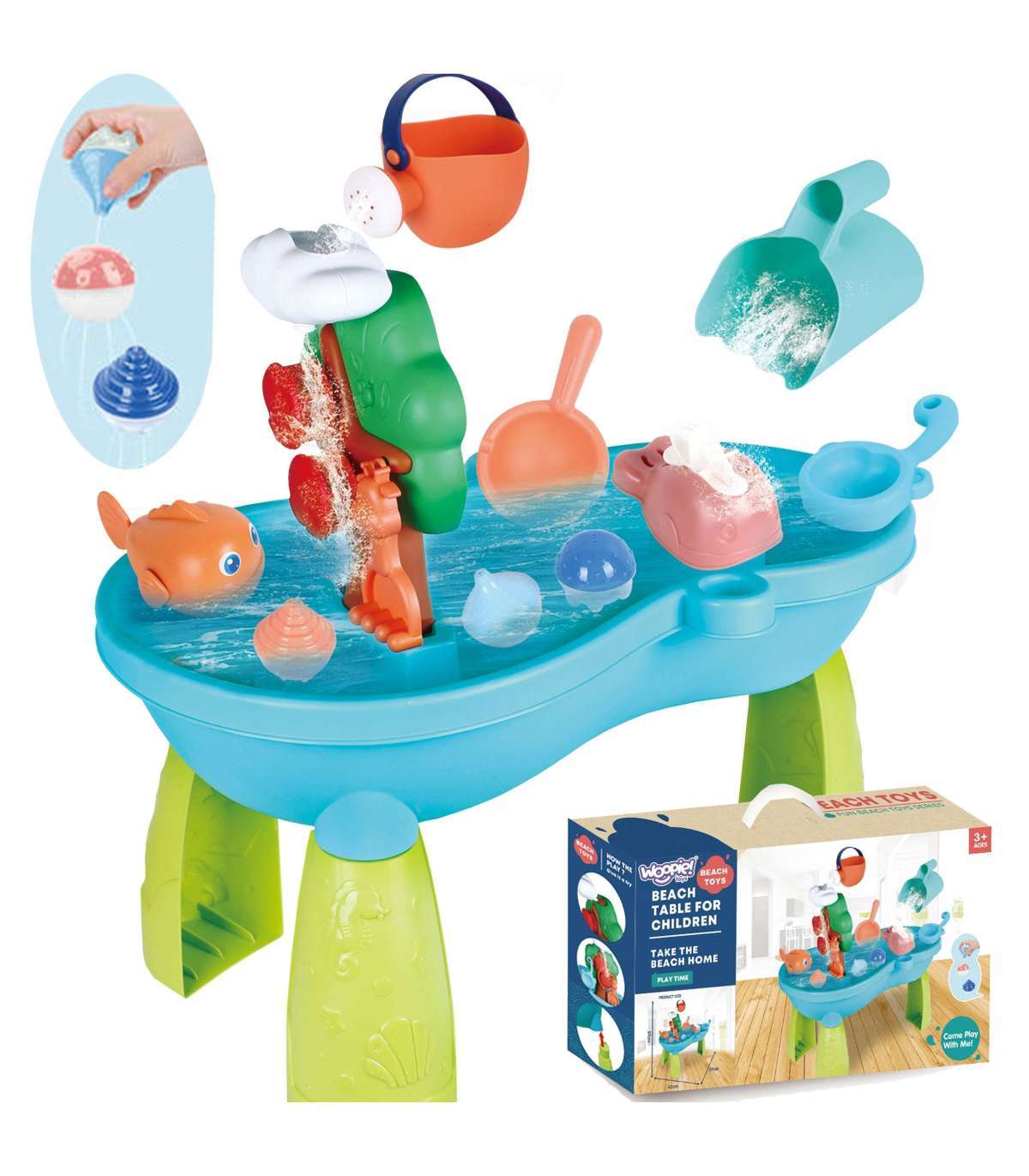 2-ühes veelaud WOOPIE kaubamärgist liivakast on ideaalne mänguasi vee ja liivaga mängimiseks. Komplekt sisaldab tarvikuid nagu: kalad, kastekann, ämbrit, ujuvaid mänguasju ja palju muud. Laudal on vesiratas, mis pöörleb, kui sellele valatakse vett. Komplekt on mõeldud mängimiseks nii toas kui ka õues.