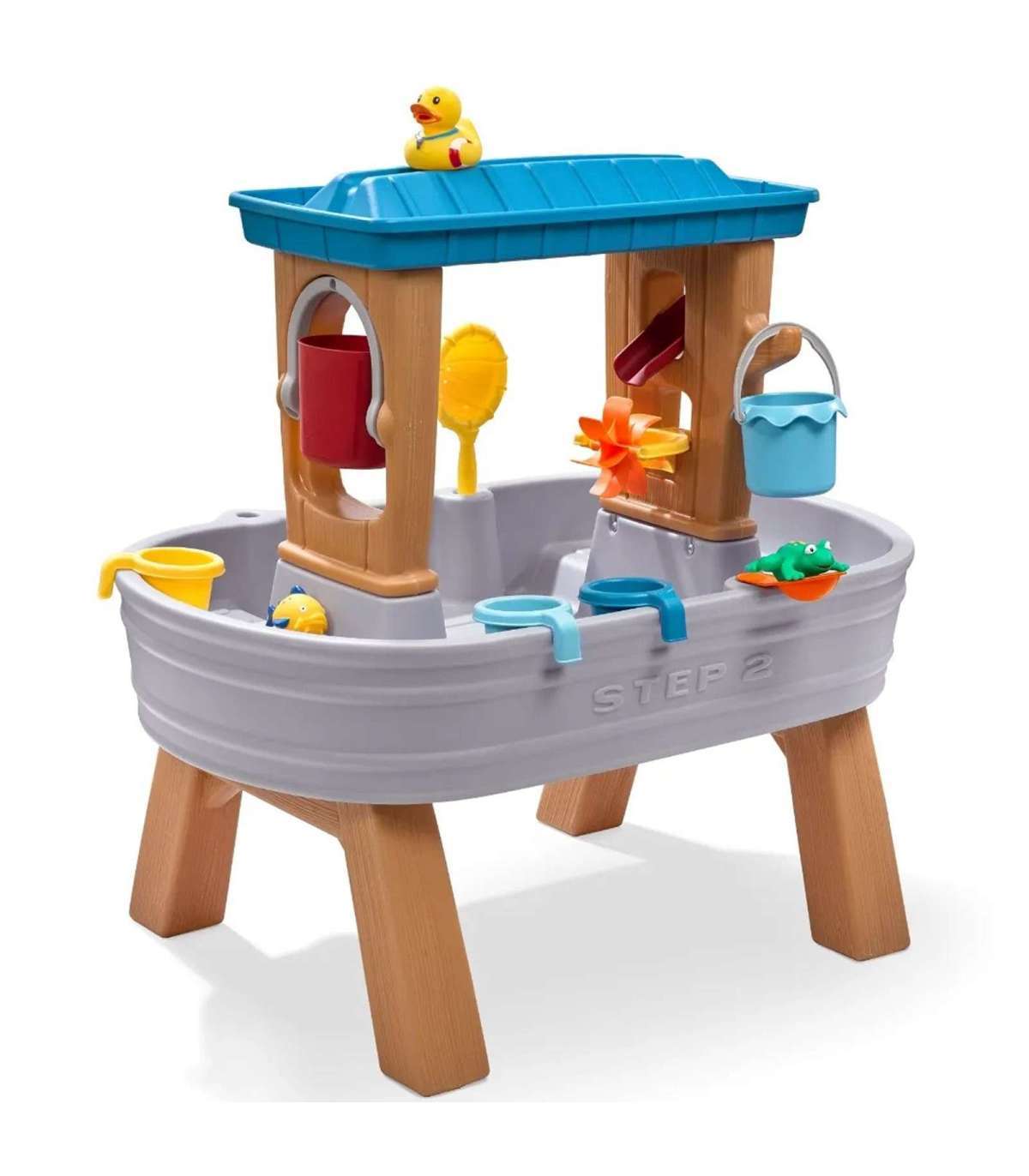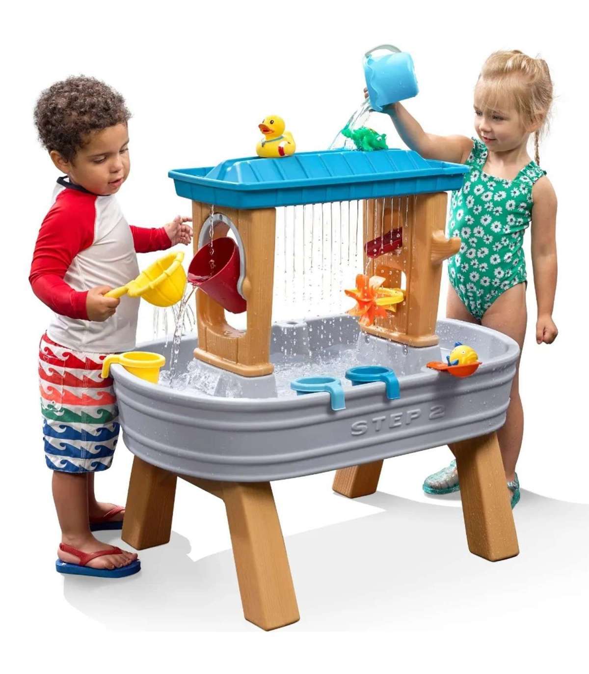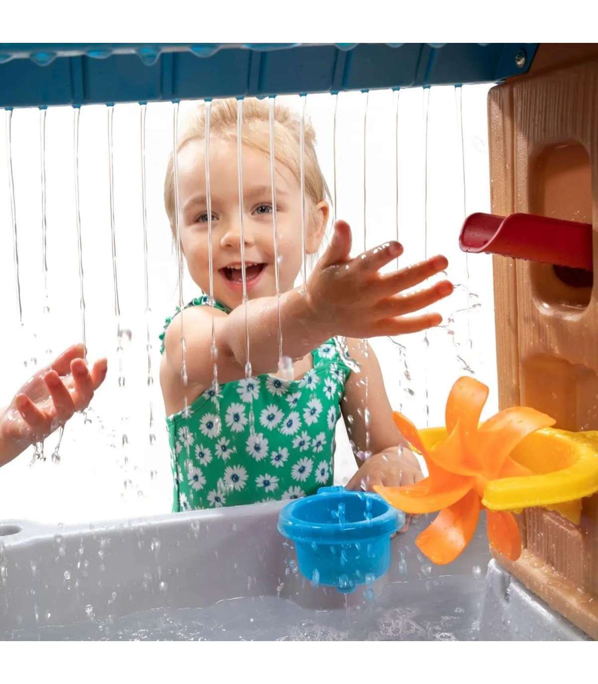 Mitmekülgne veemäng algab armsa laste veelaudiga. Lase endal nautida veepealset mängu. Kahekordne alus loob realistliku vihmaefekti — lihtsalt vala vesi ja mäng algab! Ülemine alus tekitab realistliku vihmaefekti. Ühest küljest voolab vesi ka ämbrisse, mis täitudes pöörleb ja kallab vee välja, teiselt poolt on kraav, mis juhib vee otse pöörleva tuulelipu peale. Komplektis on ka tõstetavad loomad, ämbrihoidik ja sõel. Kõik langeb kõige all asuvasse basseini.