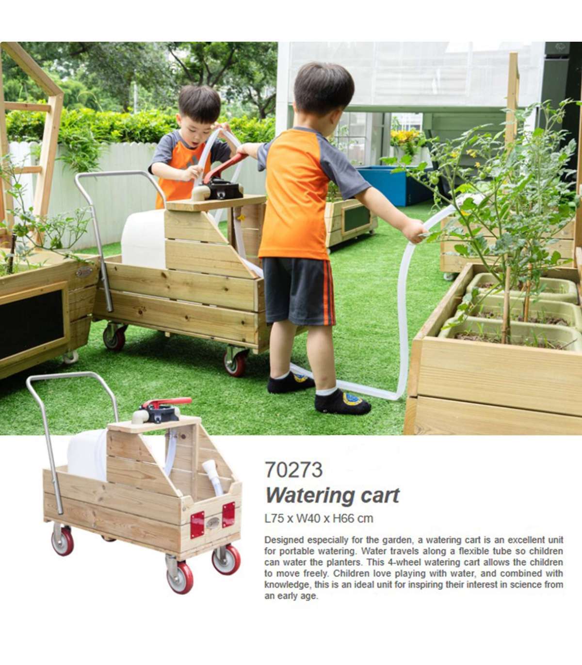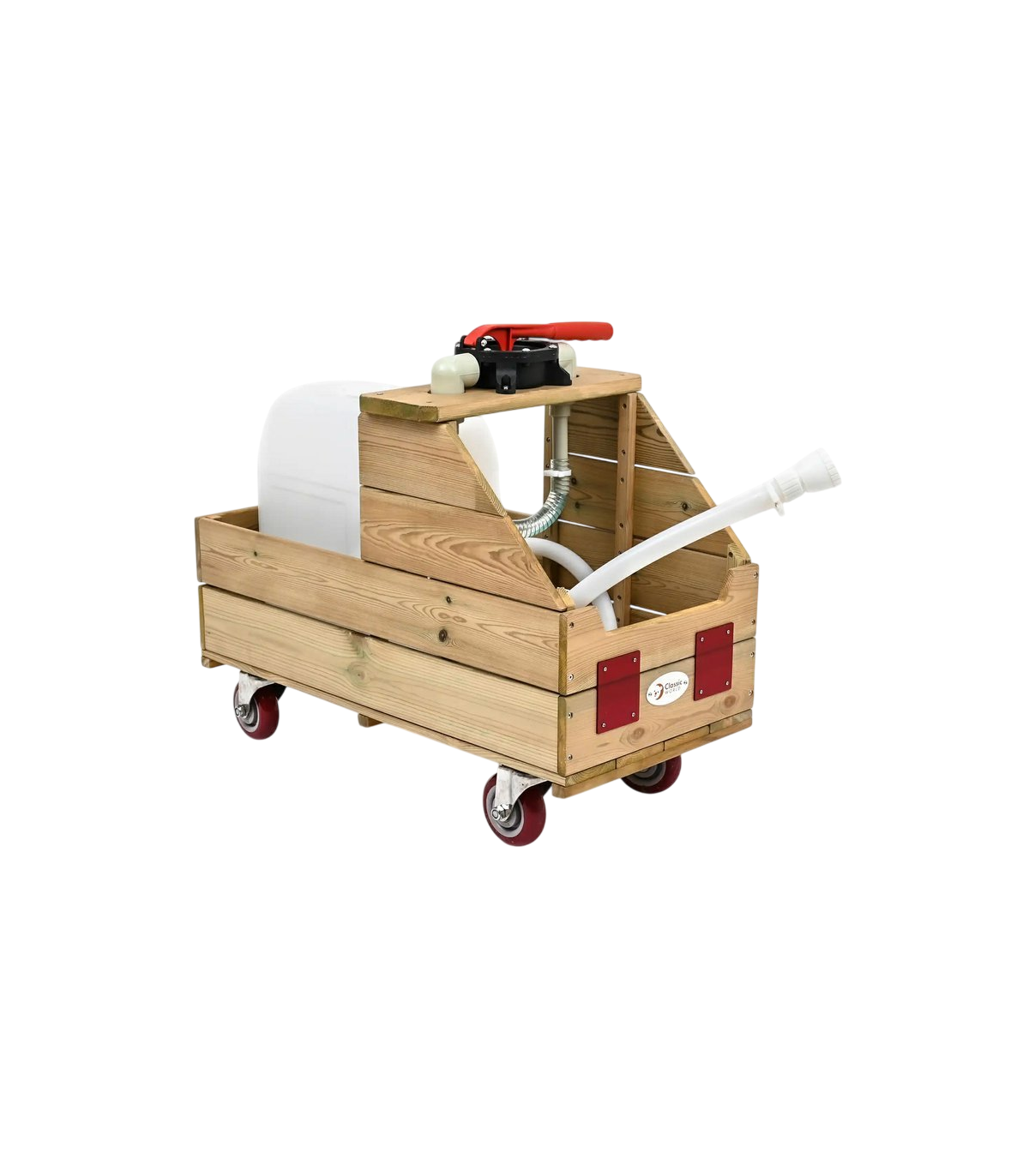 Puidust veevanker tuntud brändilt CLASSIC WORLD EDU on loodud lastele, kes õpivad aias tegutsema — vanker on suurepärane vahend kaasaskantavaks kastmiseks. Vesi voolab läbi paindliku toru, mistõttu saavad lapsed taimi hõlpsasti kasta. Lapsed armastavad vee mängimist, ning loodusteaduste õppimise ja vastutustunde arendamisega kaasneb huvitav ja arendav mäng.