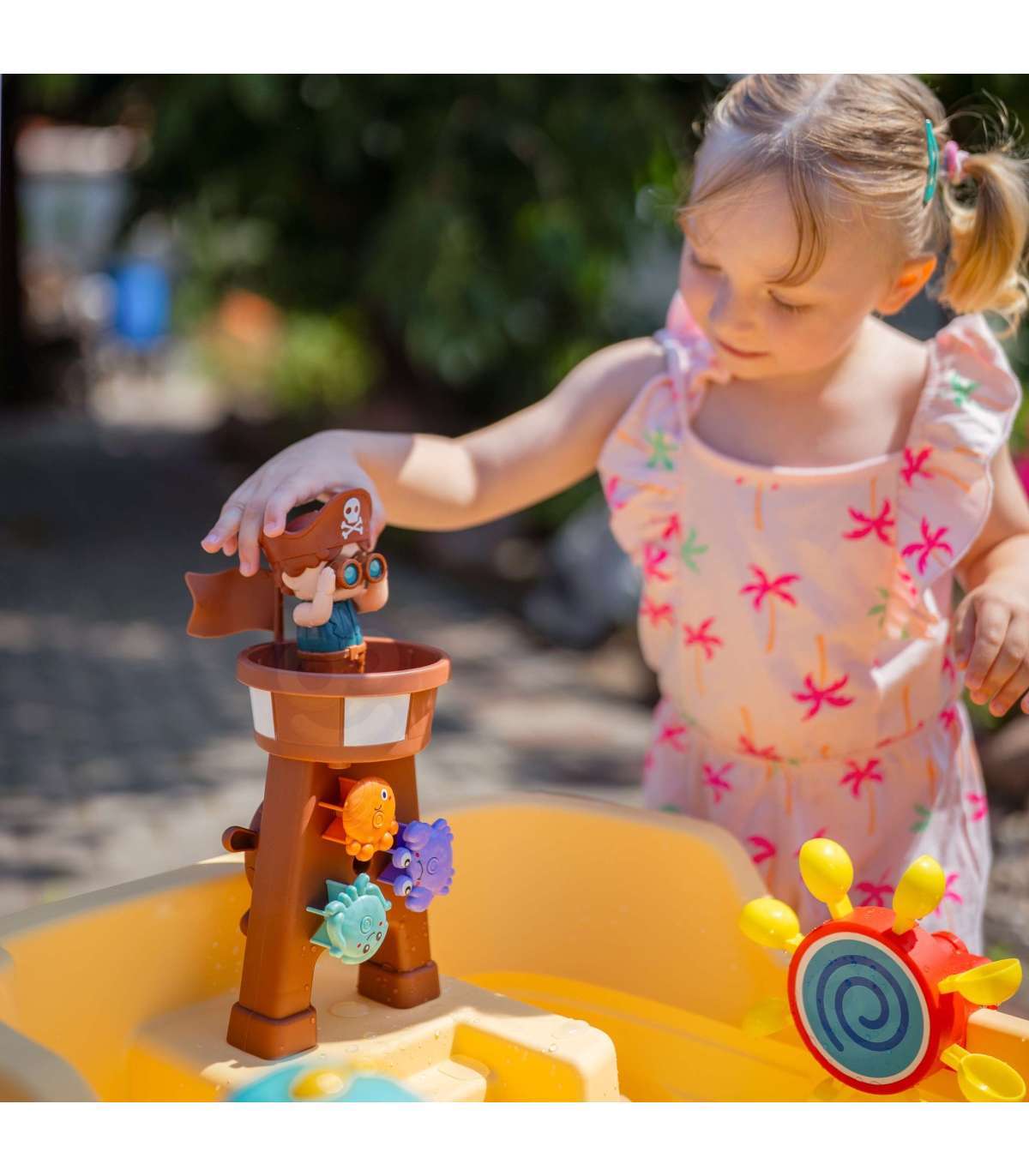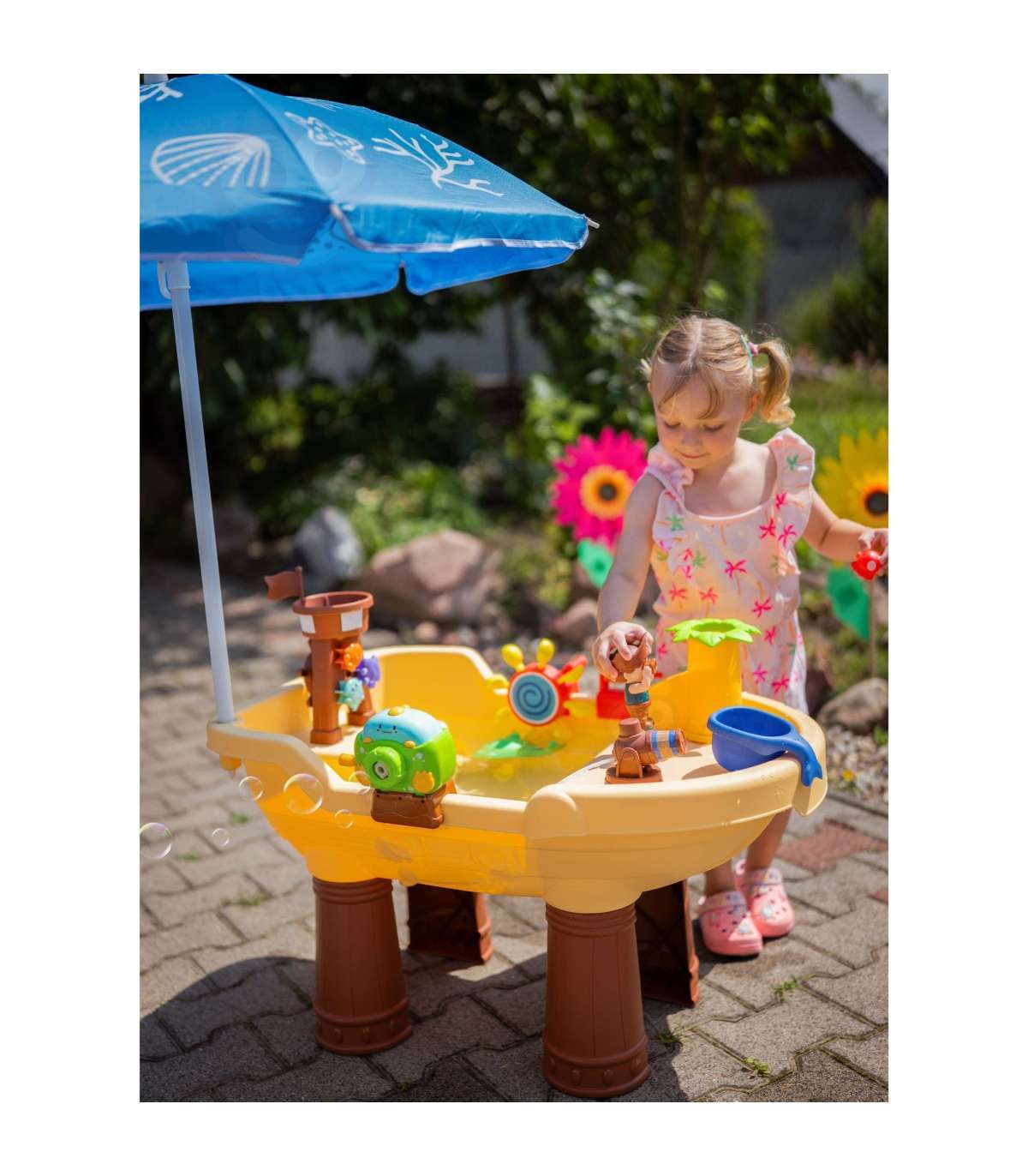 Piraadipaadi veelaud markilt Woopie on erakordne mänguasi, mis viib lapsed piraadilugude maailma ja pakub tunde loomingulist mängu õues. Tänu rikkalikule komplektile värvilisi aksessuaare, liikuvatele elementidele ja piraaditornile saavad väikesed eksperimenteerida veega, mängida mullidega, keerutada veerattaga ja avastada rohkelt mänguvõimalusi. Kaasasolev päikesevari võimaldab mugavat mängu ka kõige kuumematel päevadel. Lihtne, tugev konstruktsioon ja suur suurus muudavad laua mugavaks ja atraktiivseks ka mitme lapse jaoks korraga.
