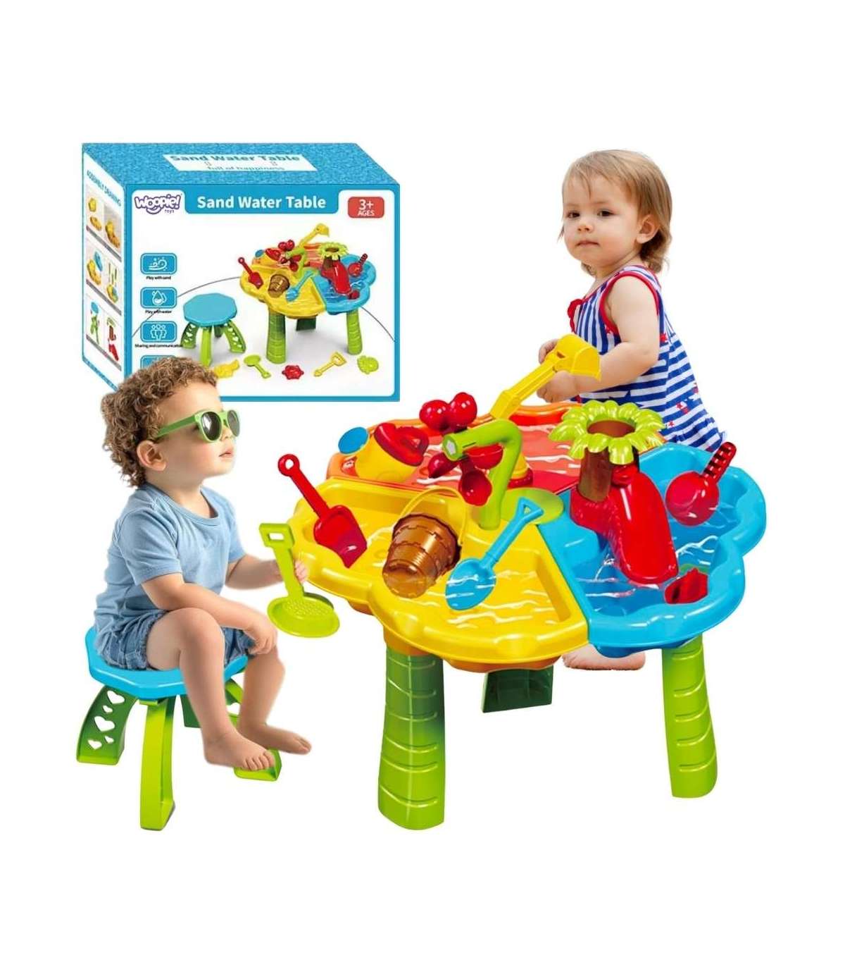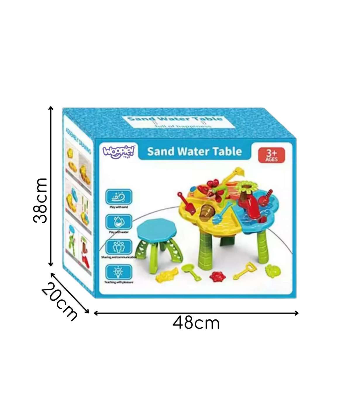 2-ühes veelaud koos tooliga kaubamärgilt Woopie on mitmekülgne komplekt vee- ja liivamängudeks, mis on loodud väikeste avastajate vajadusi silmas pidades. Sobib ideaalselt nii koju, rõdule, terrassile, aeda kui ka rannale. Mänguasi arendab loovust, kujutlusvõimet ja peenmotoorikat, pakkudes tunde rõõmu ja õppimist. Tänu rikkalikule varustusele ja tugevale ehitusele sobib see värvikas komplekt nii aeda kui ka lapse tuppa. Valmistatud ohutust, vastupidavast ja kergesti puhastatavast plastikust, ilma teravate servadeta, mis teeb selle väikeste jaoks täiesti ohutuks. Kolmeosaline konstruktsioon lauast võimaldab lastel korraga katsetada erinevate tekstuuride ja materjalidega – liiv, vesi ja komplekti aksessuaarid. Iga komplekti element on disainitud laste kujutlusvõime ergutamiseks – komplektis on mini-ekskavaator, künnis-tilk, veetuulekell, liivavormid, paat, labidad ja palju muid värvikaid aksessuaare. Tänu sellele saab laps mängida stseene, luua liivakuju, valada vett, ehitada ja katsetada – õppides mängu kaudu. Komplektis on ka värvikas ja ergonoomiline tool, mis tagab mugavuse mängu ajal. Kogu komplekt on lihtne kokku ja lahti panna, mis teeb sellest suurepärase lahenduse nii igapäevaseks kasutamiseks kui ka reisimiseks. Mänguasja kokkupanekuks tööriistu ei vajata – kõik ühendub intuitiivselt ja stabiilselt. Laud ei ole ainult mängimiseks, vaid ka õppimiseks – see toetab motoorse arengu, silma-käe koordinatsiooni, peenmotoorikat, loogilist mõtlemist ning suhtlemis- ja sotsiaalseid oskusi, eriti mängides eakaaslastega. See on ideaalne mänguasi ühiste rõõmsate hetkede jaoks, mis samaaegselt arendavad ja õpetavad.