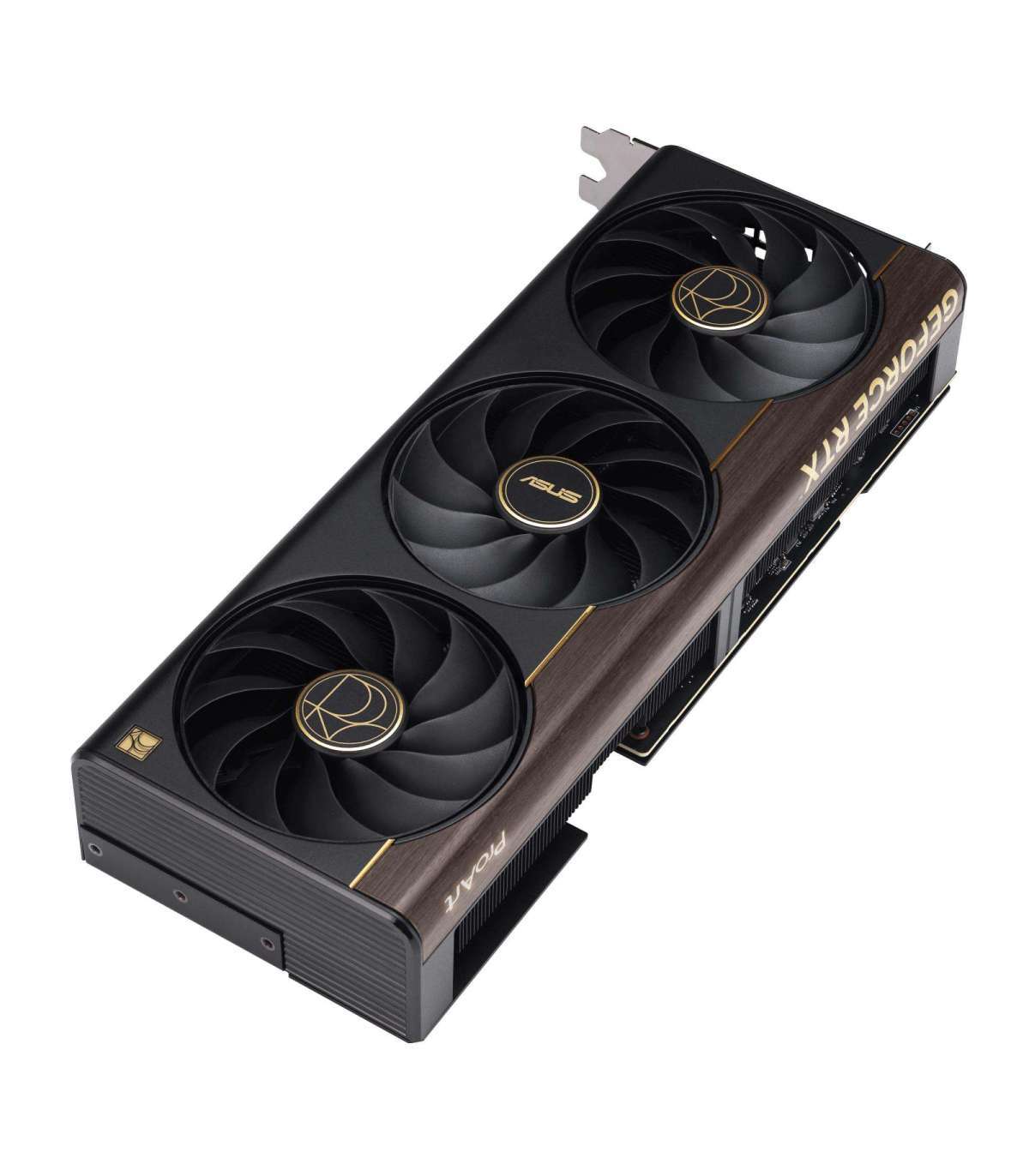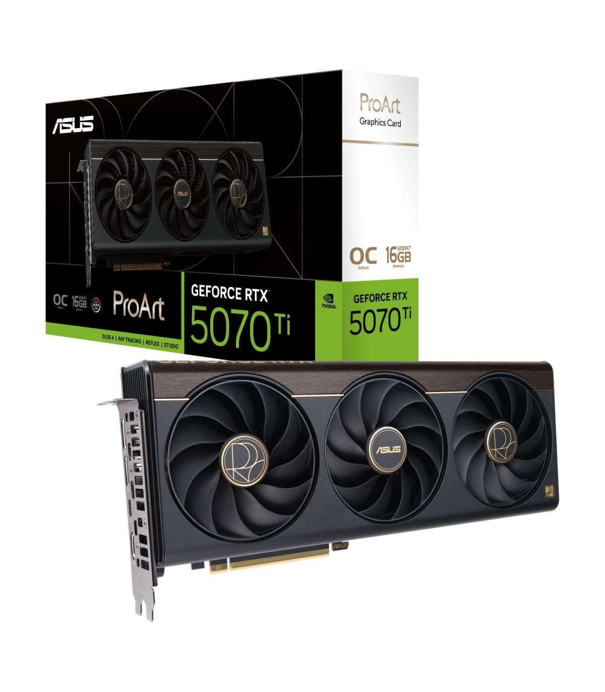 The ProArt GeForce RTX™ 5070 Ti combines a compact 2.5-slot design with potent cooling – three Axial-tech fans, a vapor chamber, and a phase-change GPU thermal pad – to deliver GeForce RTX 50 Series performance to both full-scale towers and space-saving SFF builds. A USB Type-C® port enhances versatility for content creation workflows, while a wood-patterned laminate trim and low-key Aura-lit logo help deliver a refined aesthetic.
