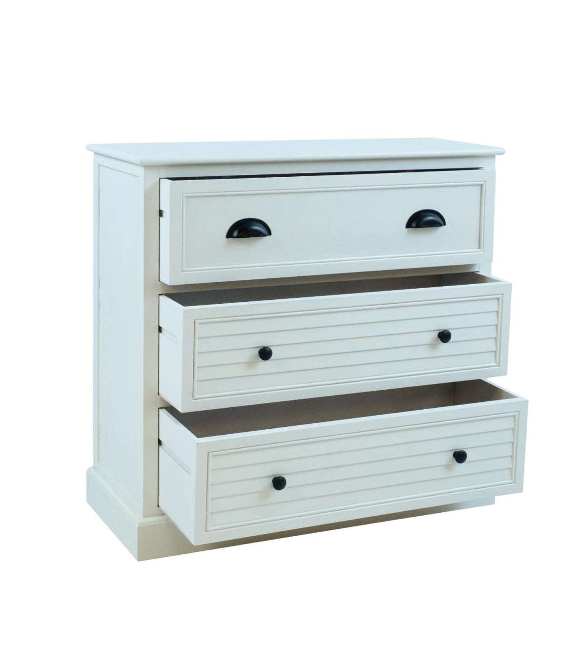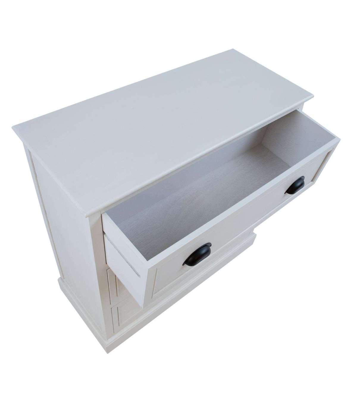 Kummuti põhikonstruktsioon ja sokkel on valmistatud männipuidust. Pealmine lauaplaat, sahtlid ja paneelid on värvitud MDF. Kummut on viimistletud valge värviga. Metallist käepidemetega sahtlid on ilma siinideta.