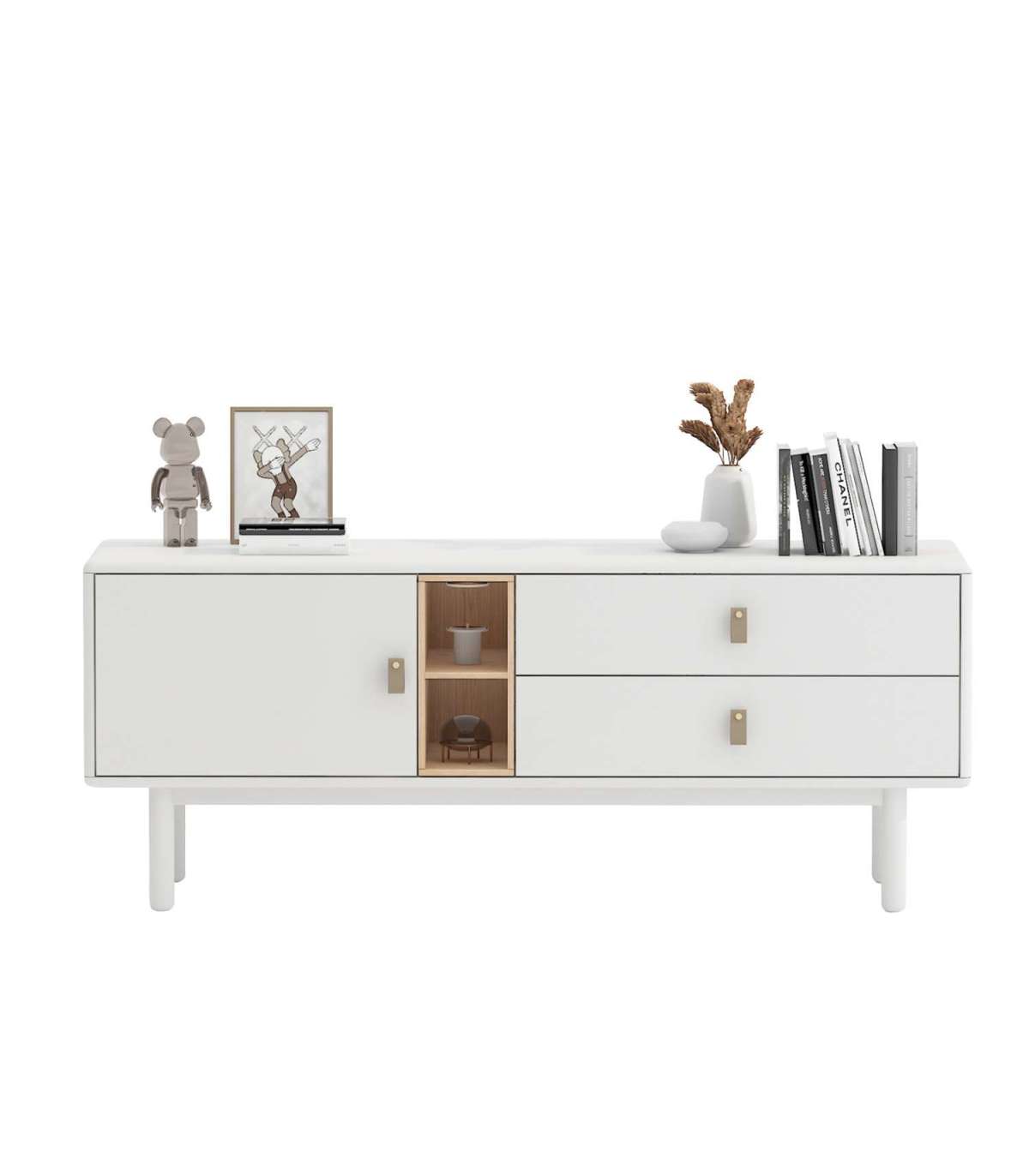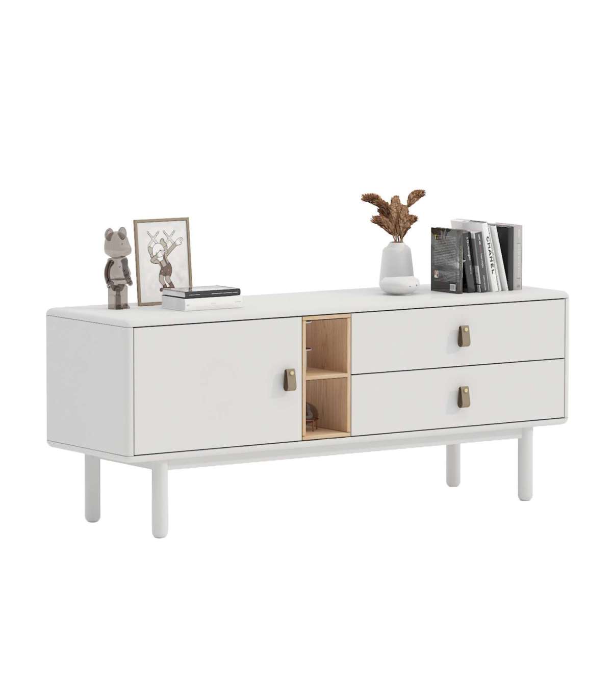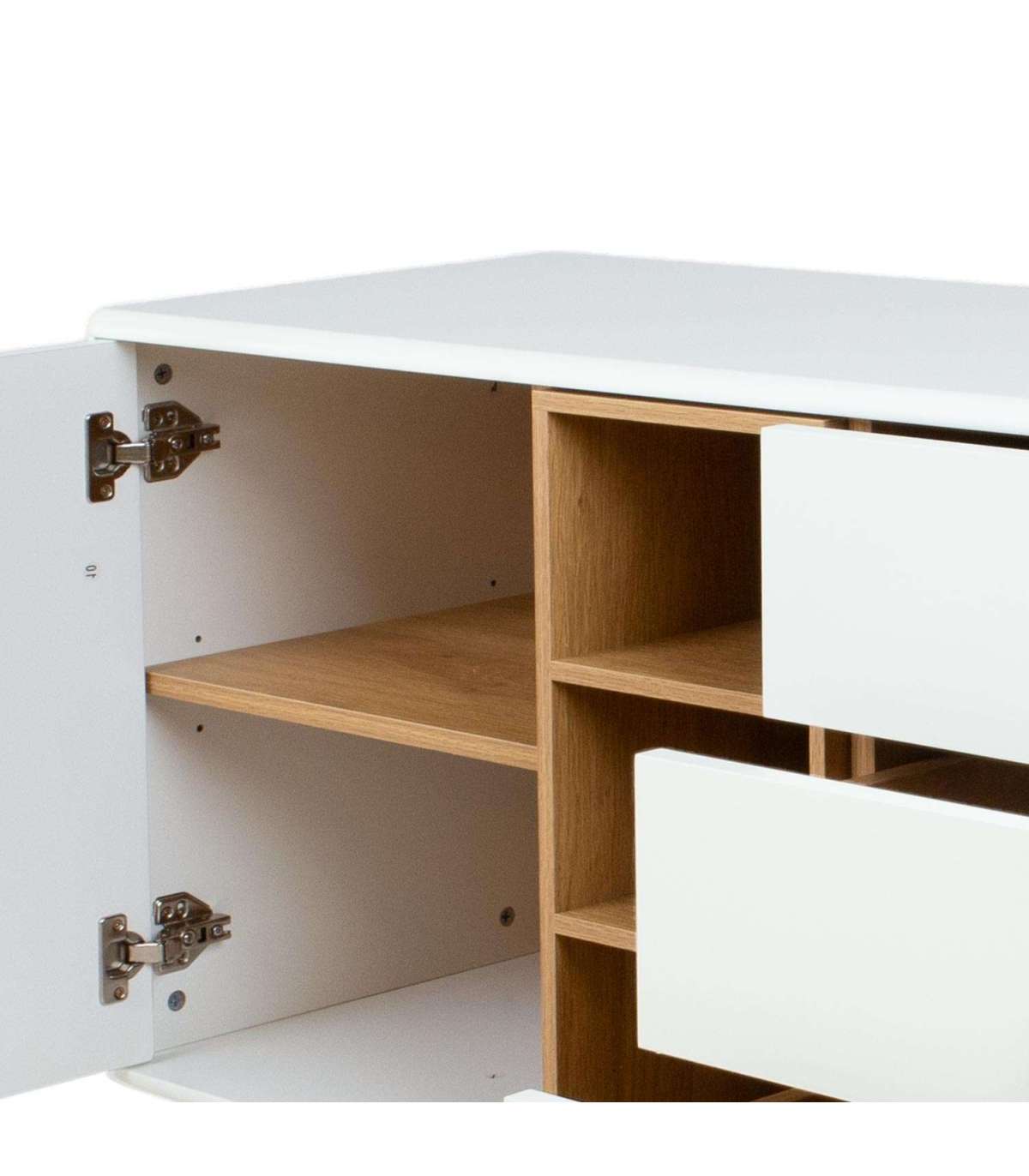 Kummut IRIS 2-sahtli ja uksega 140x40xH55cm, valge. Kummut on valmistatud 18mm MDF plaadist. Jalad ja alusraam on valmistatud täispuidust. Kummut on viimistletud vastupidava polüuretaanvärviga. Sahtlitel on nahast käepidemed. Avatud vaheriiul on vooderdatud heleda puiduvärvi plaadiga. Kummutil on ümarad välisservad.