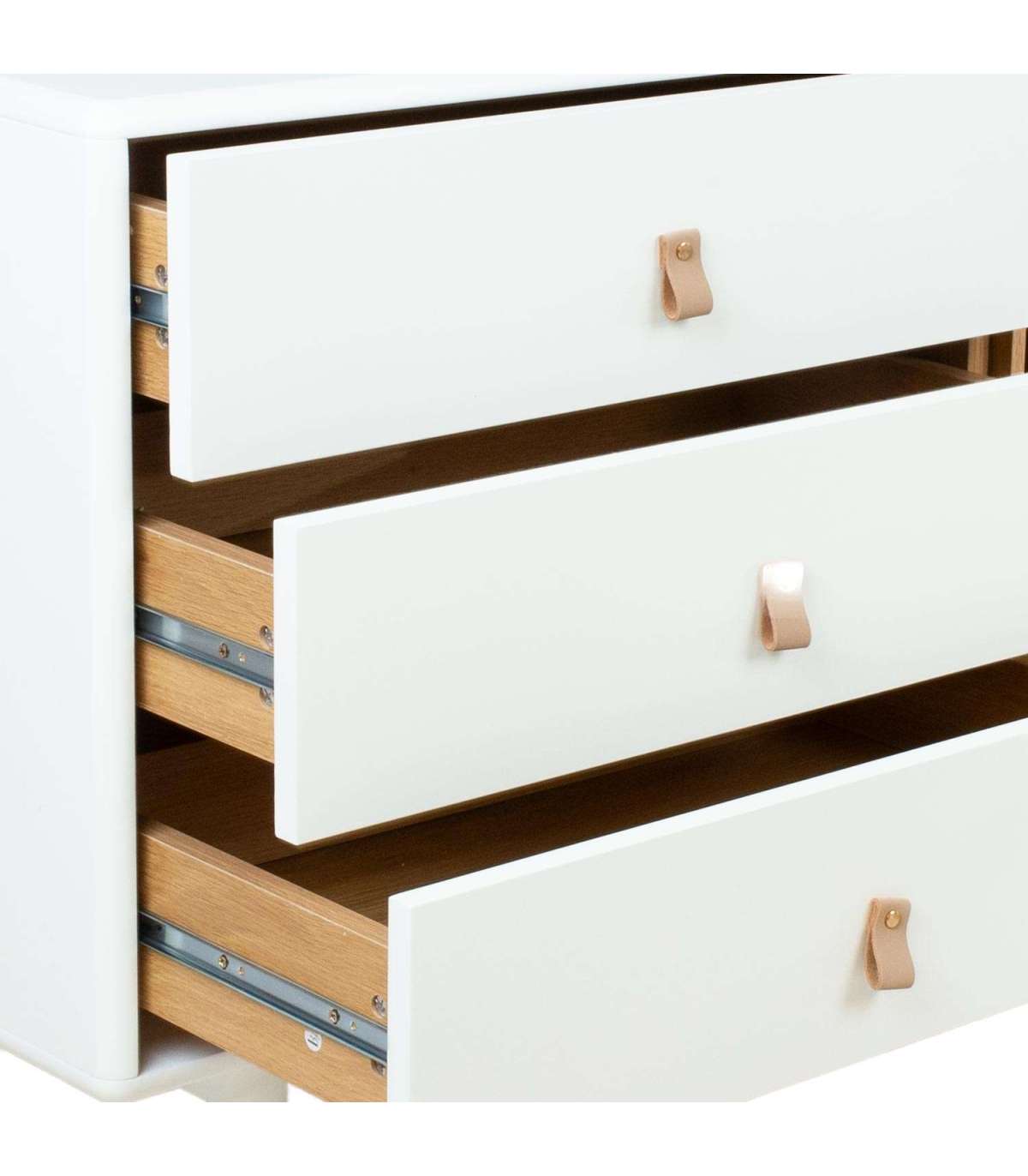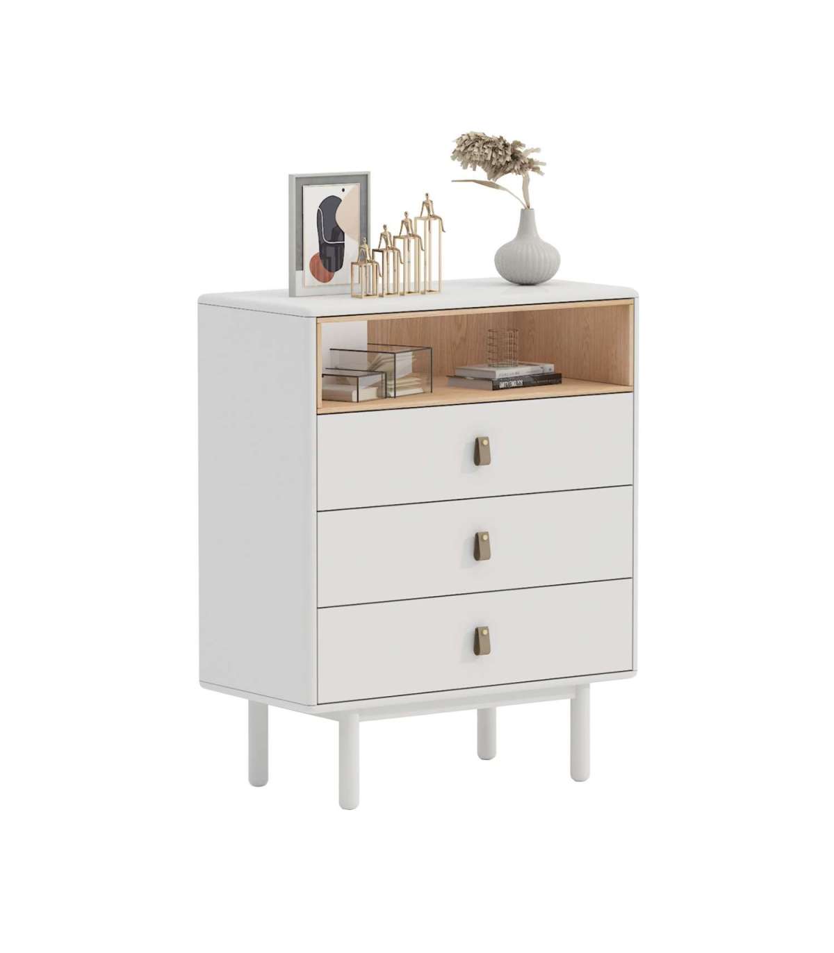 Kummut IRIS 3-sahtli ja riiuliga 80x40xH100cm, valge. Kummut on valmistatud 18mm MDF plaadist. Jalad ja alusraam on valmistatud täispuidust. Kummut on viimistletud vastupidava polüuretaanvärviga. Sahtlitel on nahast käepidemed. Avatud vaheriiul on vooderdatud heleda puiduvärvi plaadiga. Kummutil on ümarad välisservad.