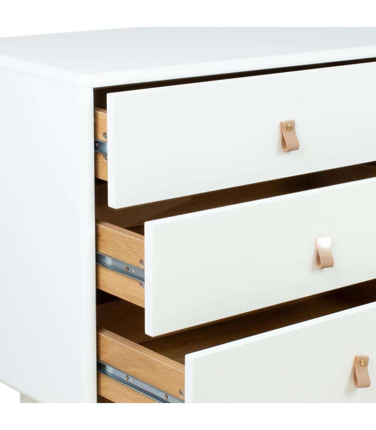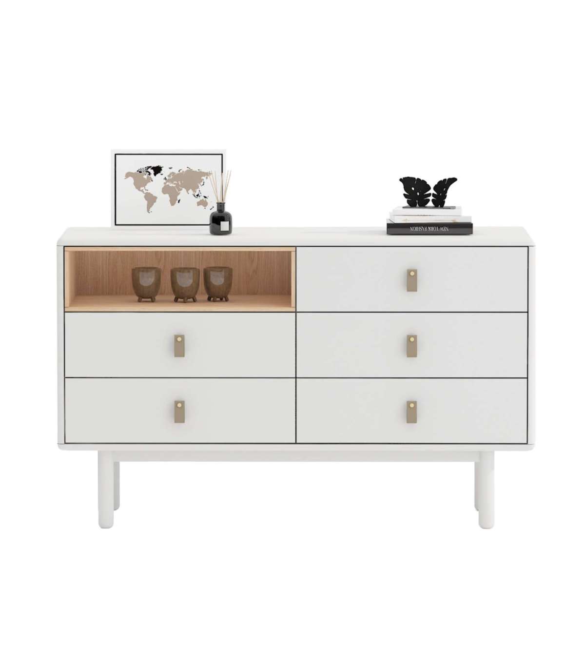Kummut IRIS 5-sahtli ja riiuliga 120x40xH75cm, valge. Kummut on valmistatud 18mm MDF plaadist. Jalad ja alusraam on valmistatud täispuidust. Kummut on viimistletud vastupidava polüuretaanvärviga. Sahtlitel on nahast käepidemed. Avatud vaheriiul on vooderdatud heleda puiduvärvi plaadiga. Kummutil on ümarad välisservad.