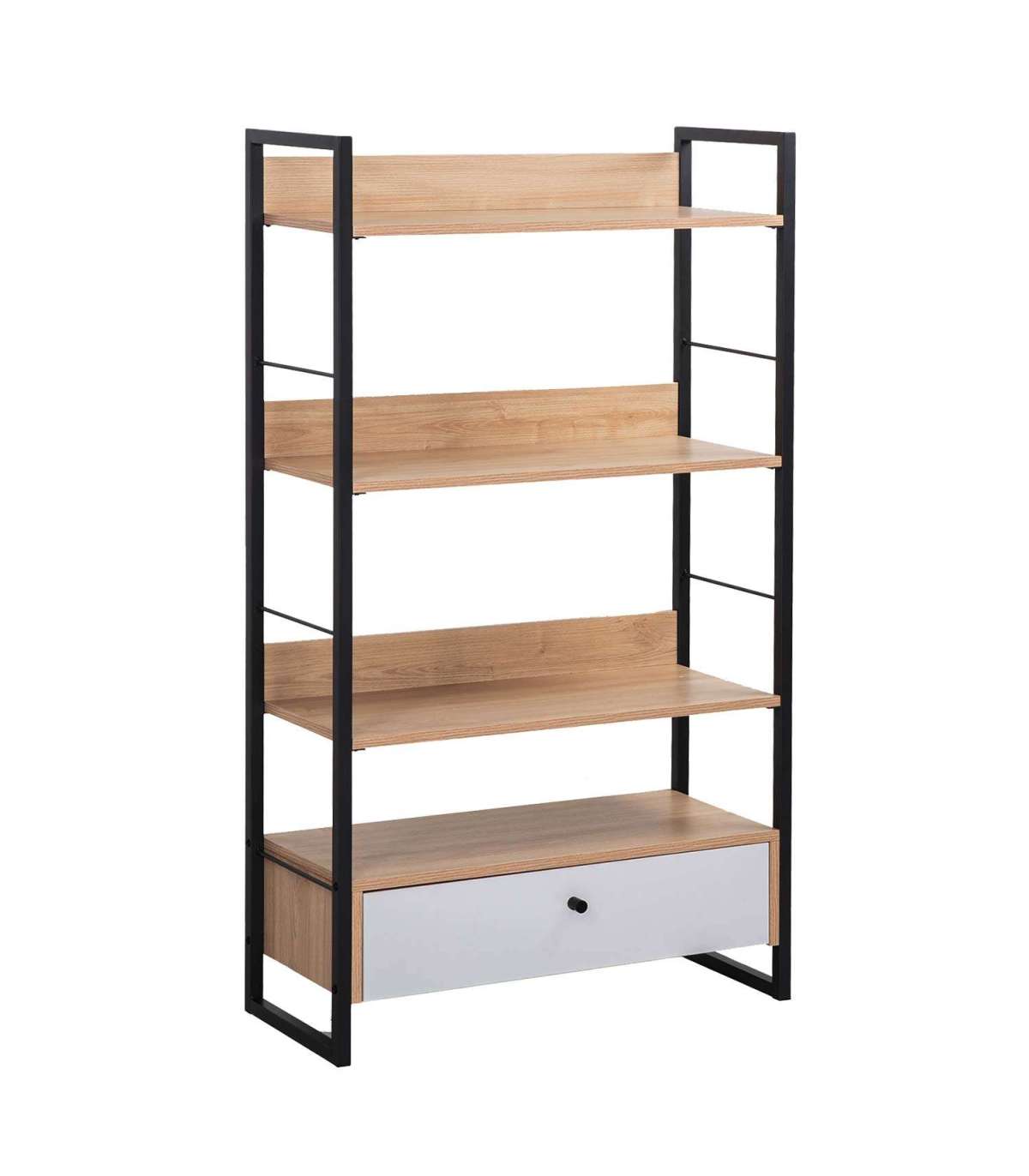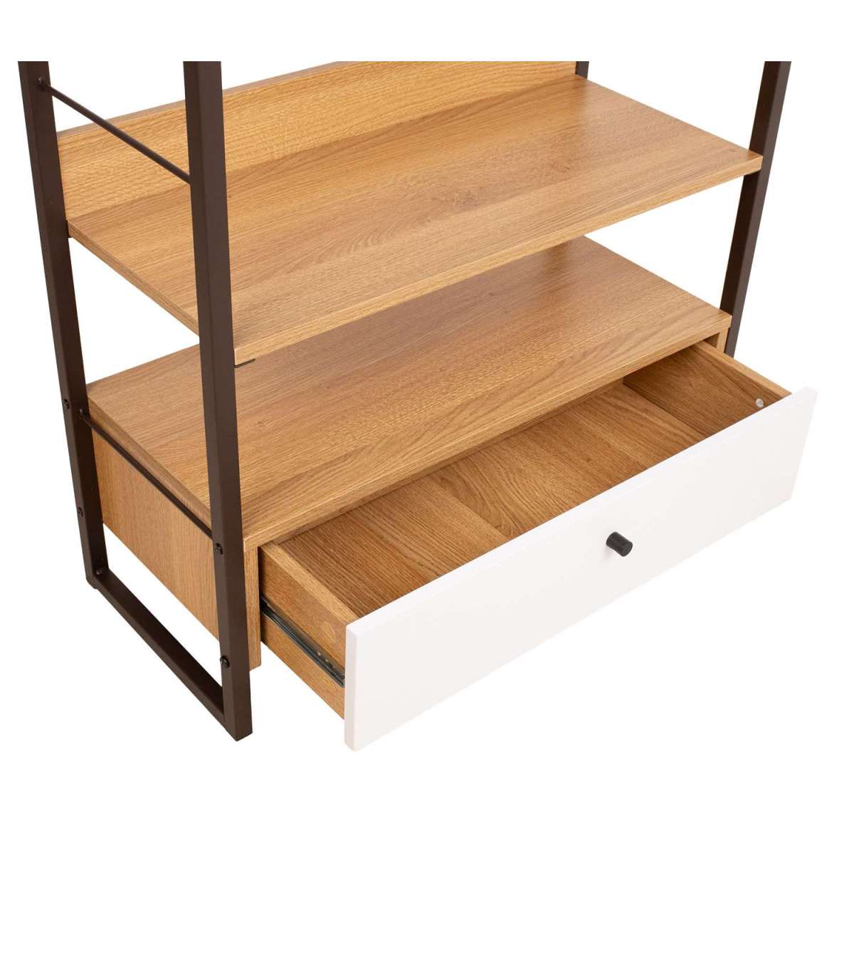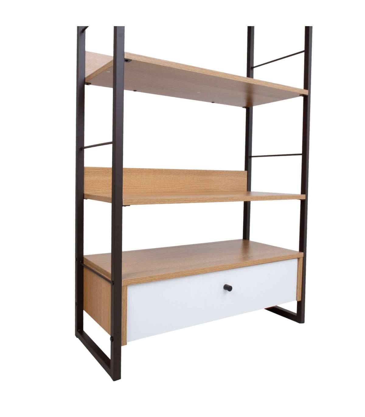 Riiul STUDY 70x30xH124,5cm, tamm/valge. Riiulid ja sahtli esipaneel: melamiinplaat. Riiuli raam on valmistatud metallist ja viimistletud pruuni pulbervärviga.