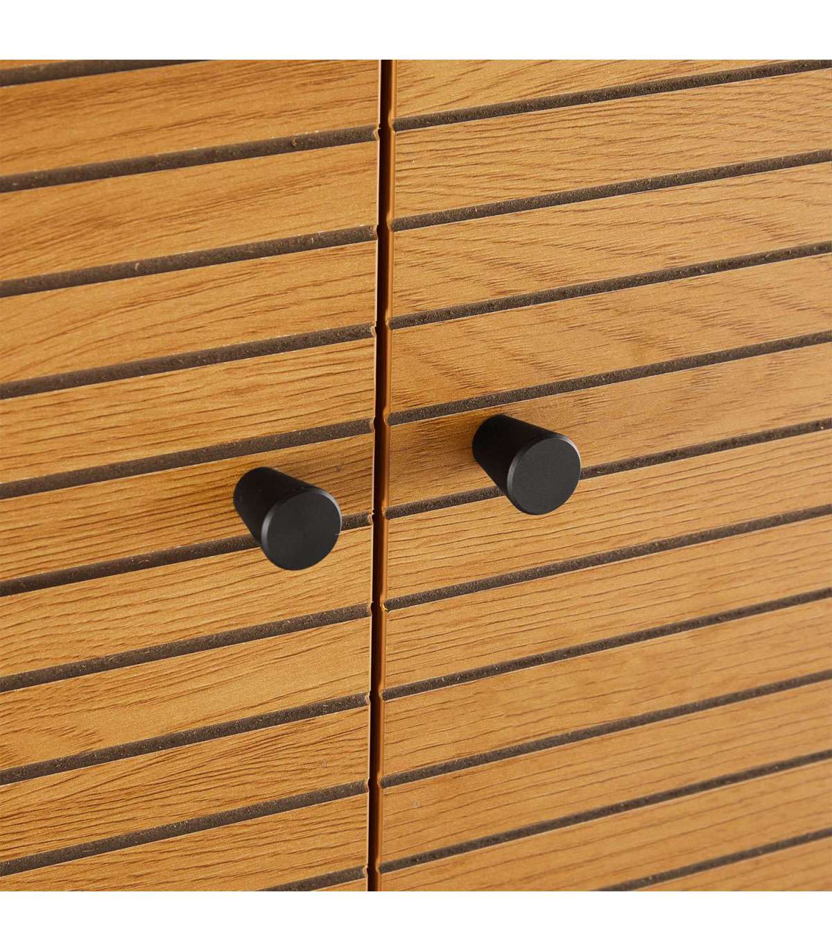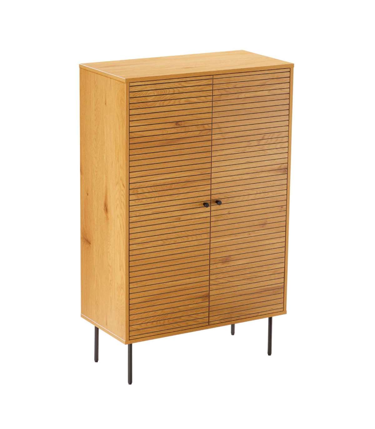 Kapp LINE 80x40xH130cm. Kapp on valmistatud tammedekooriga melamiinplaadist. Efektsed reljeefse pinnaga triibulised uksed on valmistatud mustast MDF plaadist, mida kaunistavad tammevärvi kitsad liistud. Kapi metallist jalad on viimistletud musta pulbervärviga.