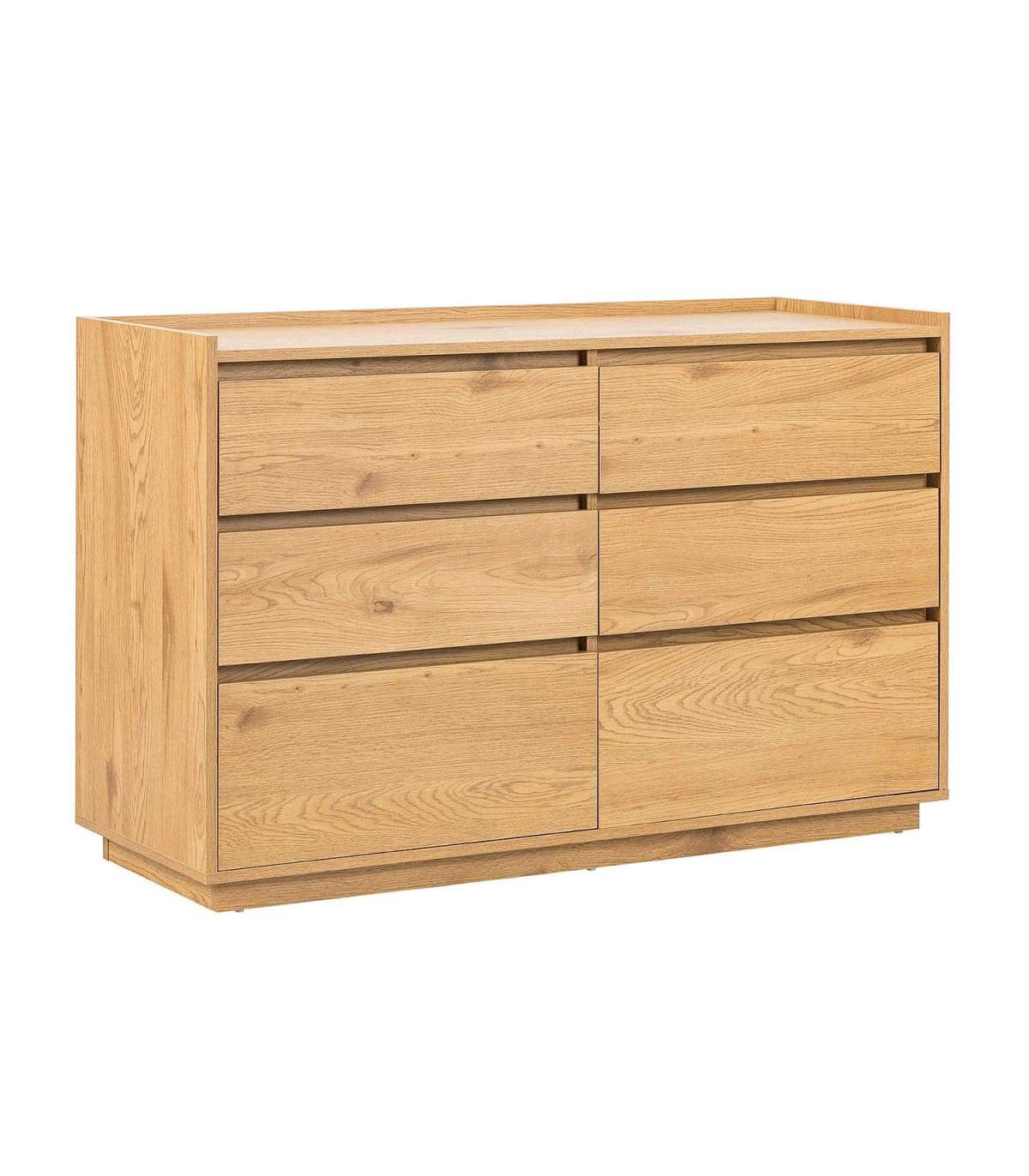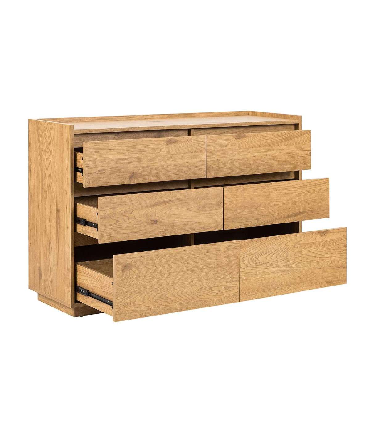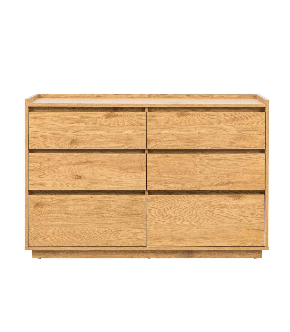 Kummut SACHA 6-sahtliga 120x40xH80cm, tammedekooriga melamiin. Kummut on valmistatud melamiinkattega mööbliplaadist. Sahtlid liiguvad metallsiinidel.