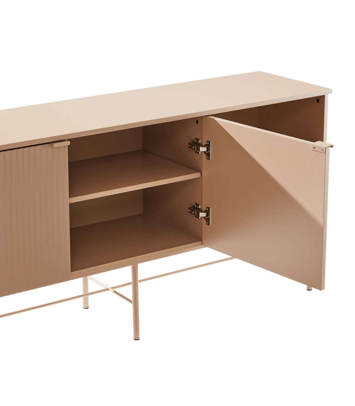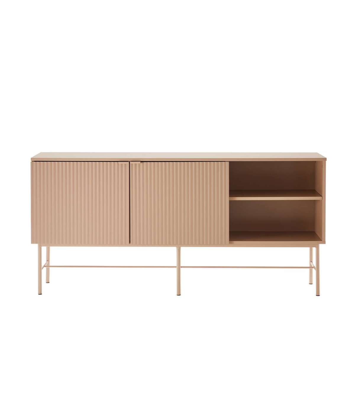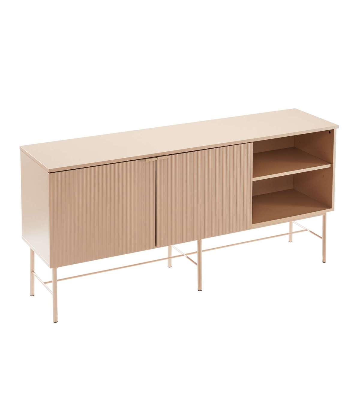 Kummut SEQUENCE 2-ukse ja avatud riiuliga 158x40xH75cm, cappuccino. Kummuti korpus on valmistatud MDF plaadist. Reljeefse pinnaga triibulised uksepaneelid annavad tootele omanäolise ja trendika välimuse. Kummut on viimistletud vastupidava polüuretaanvärviga. Metallist alusraam ja jalad on viimistletud pulbervärviga.