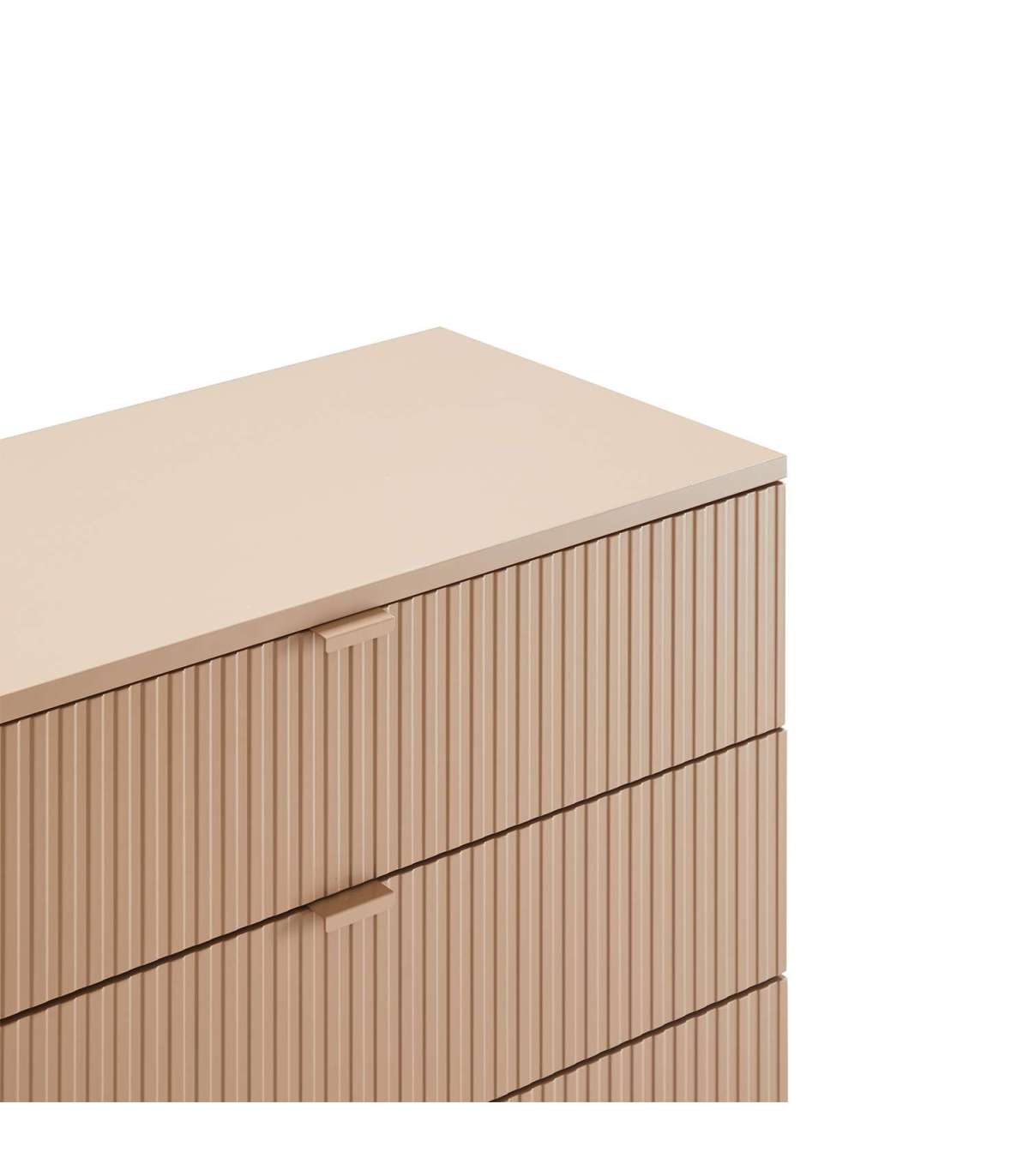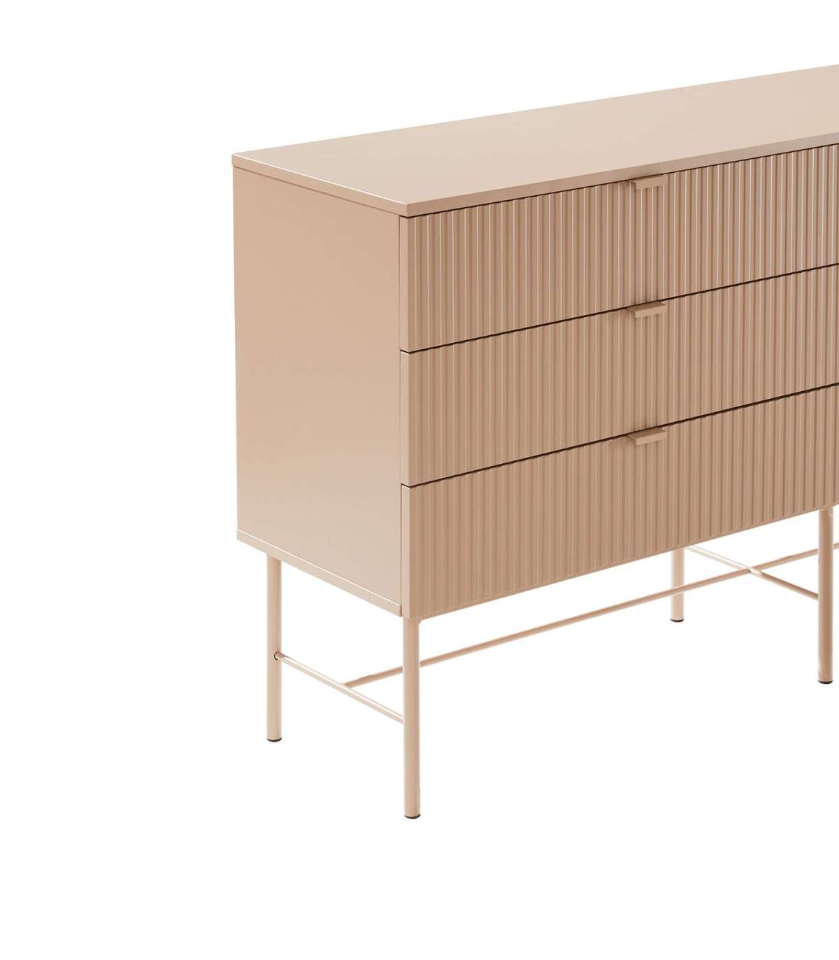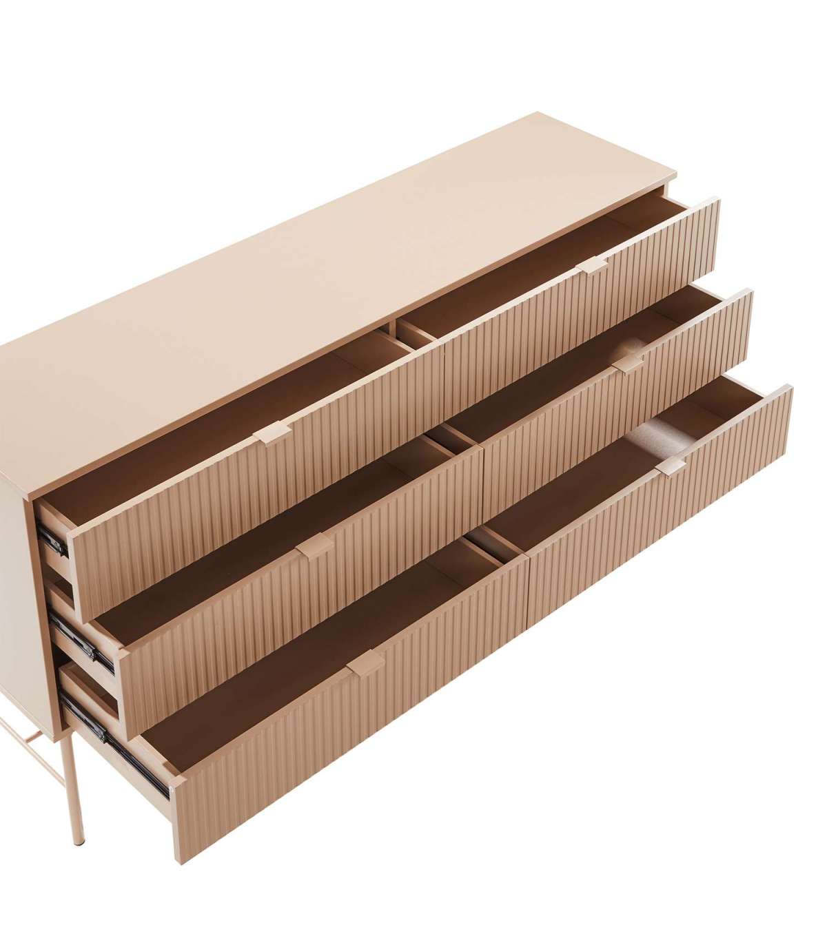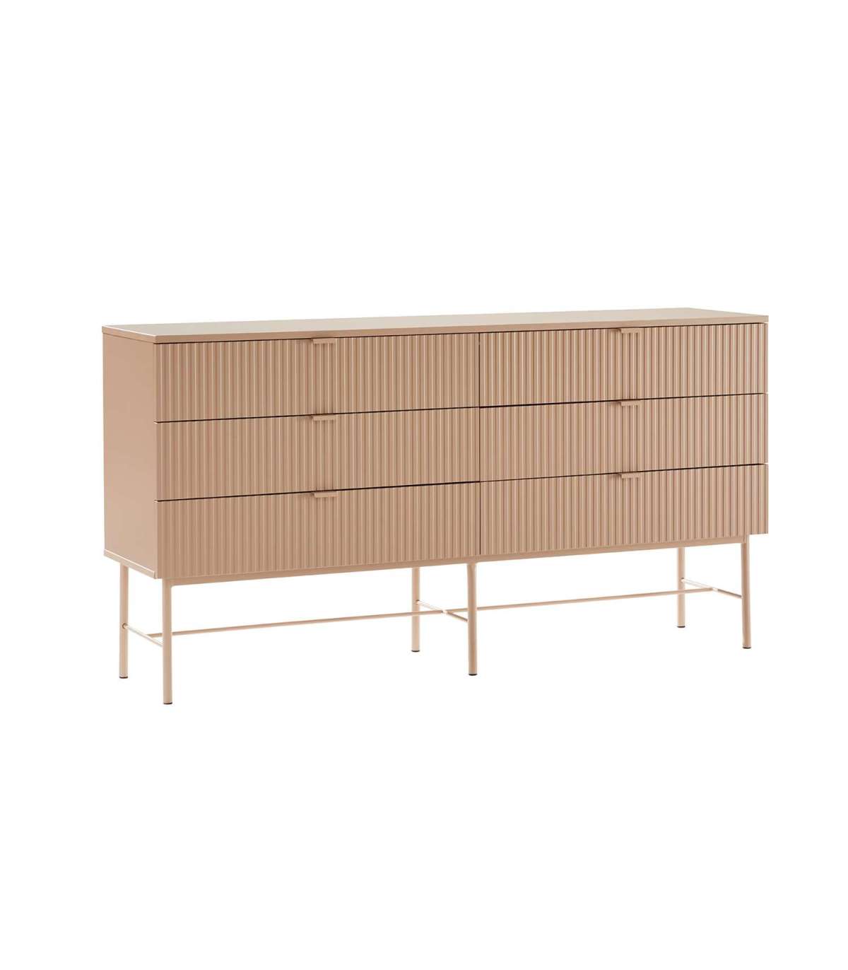 Kummut SEQUENCE 6-sahtliga 158x40xH83cm, cappuccino. Kummuti korpus on valmistatud MDF plaadist. Reljeefse pinnaga triibulised sahtlite esipaneelid annavad tootele omanäolise ja trendika välimuse. Sahtlid liiguvad metallsiinidel. Kummut on viimistletud vastupidava polüuretaanvärviga. Metallist alusraam ja jalad on viimistletud pulbervärviga.