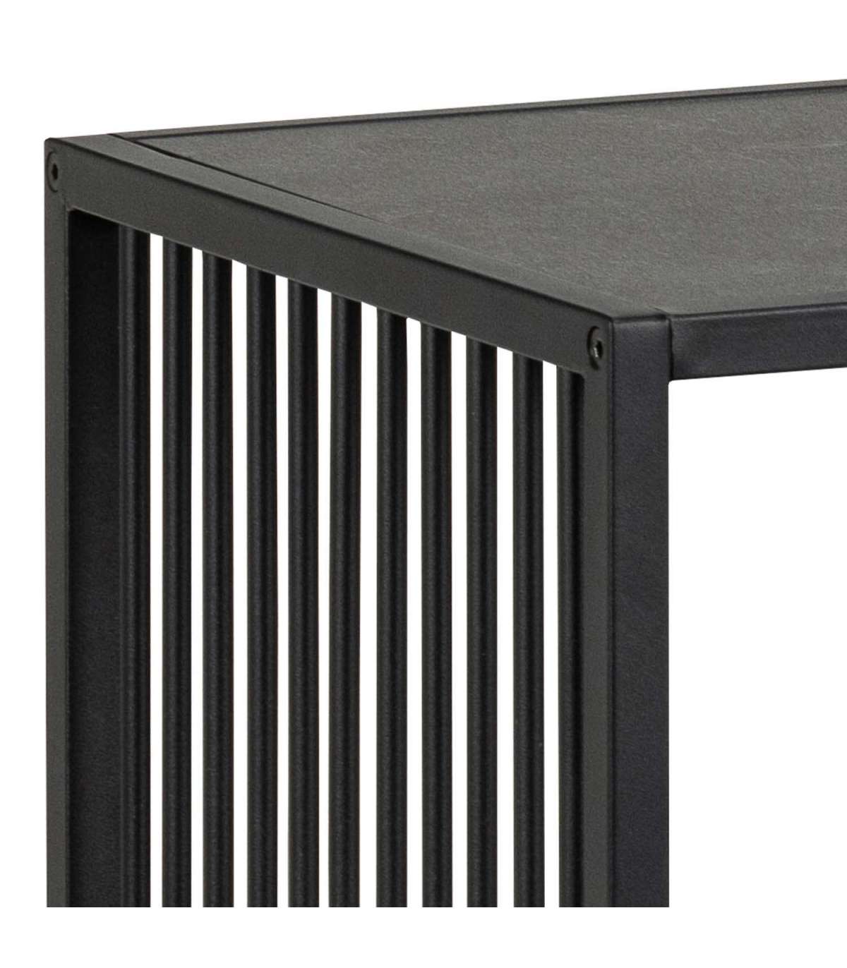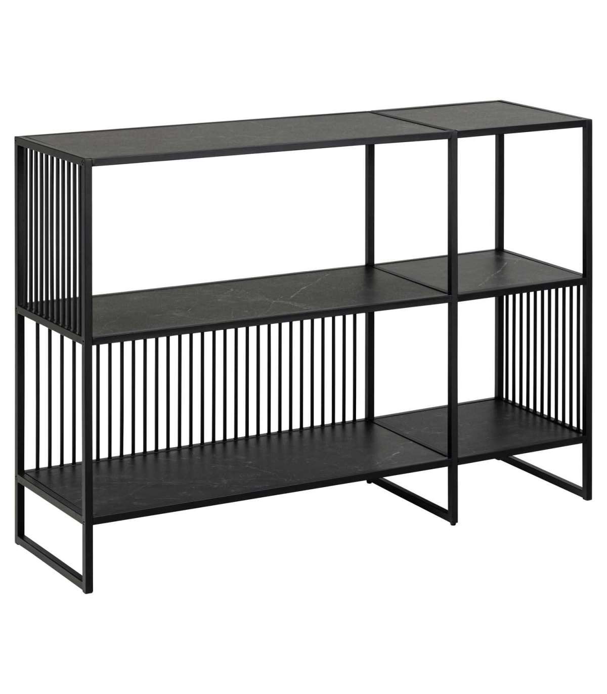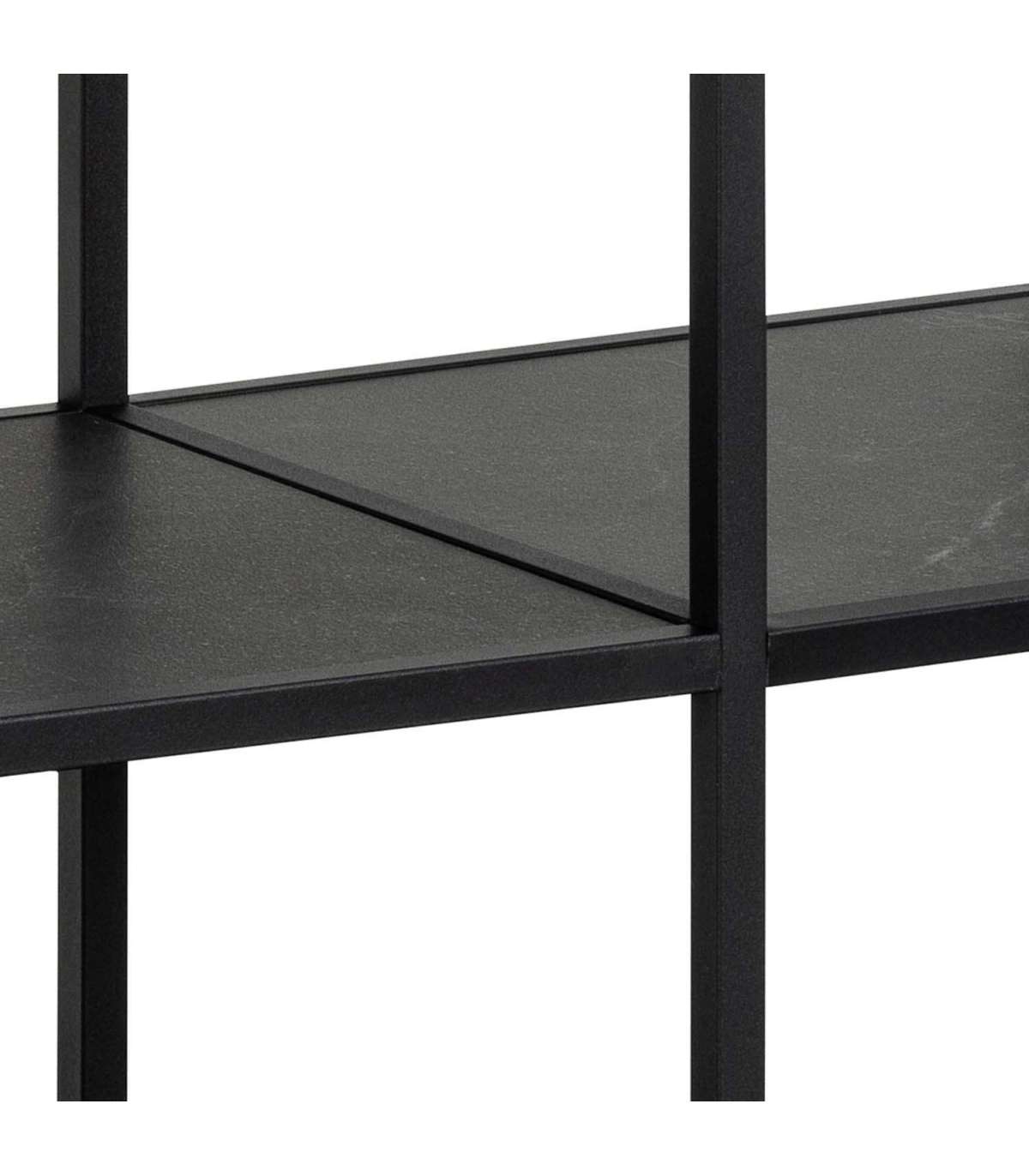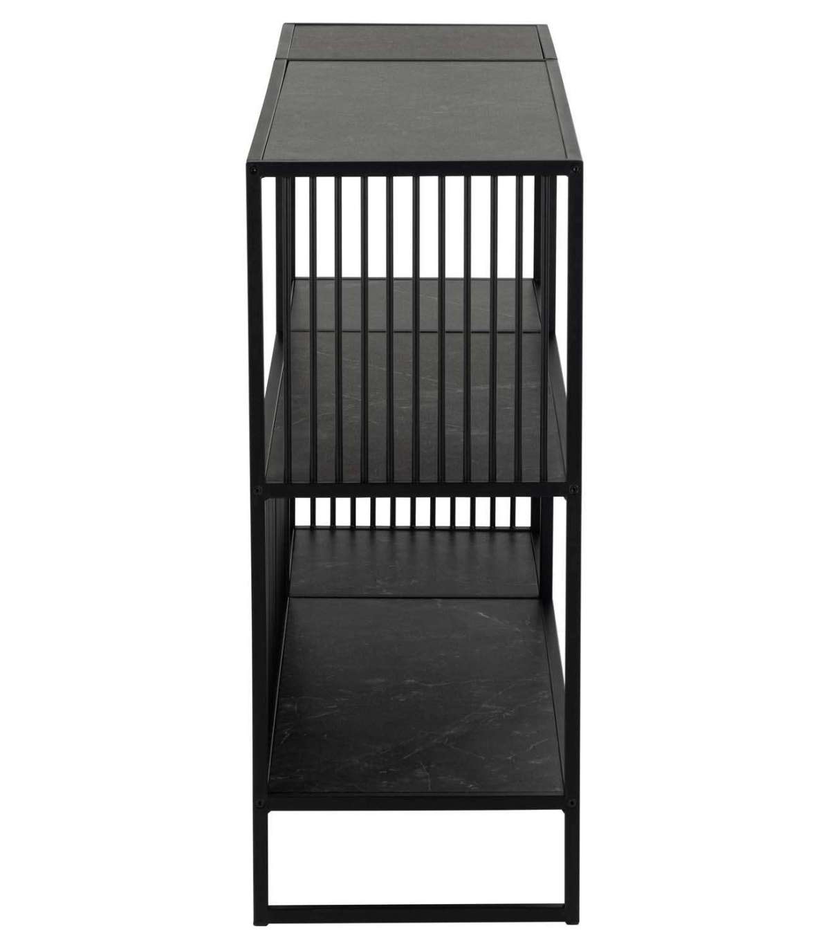 Riiul mõjub detailirohkuse tõttu visuaalselt põnevana. Musta terasraami ilmestavad vertikaalselt paigutatud traadid. Riiuliplaadid on musta marmori välimusega. Riiulitel saab eksponeerida väiksemaid dekoratiivobjekte ja sentimentaalselt olulisi esemeid. Materjal: MDF melamiin, pulbervärvitud teras. Toote mõõdud on 120x35xH83cm.
