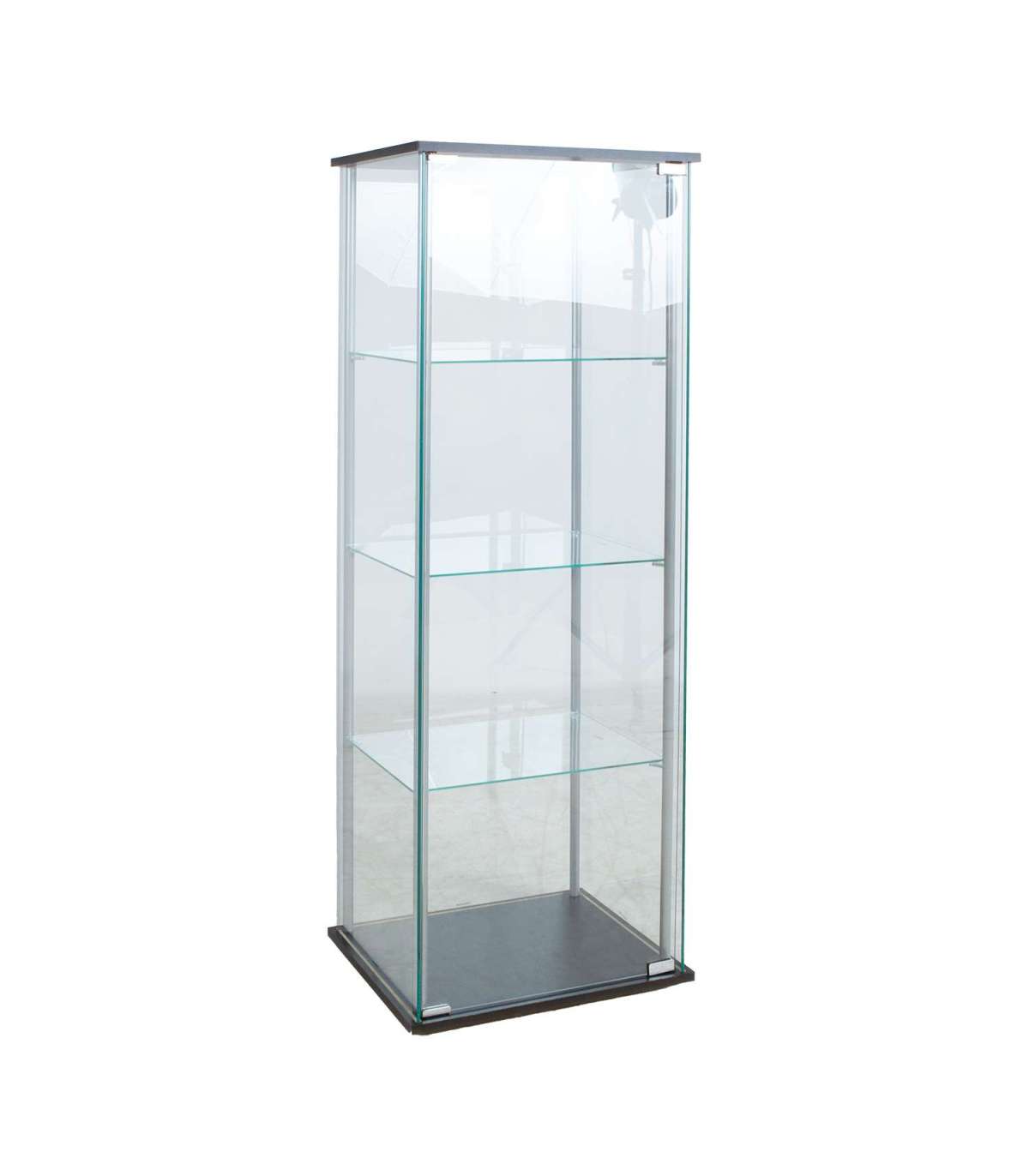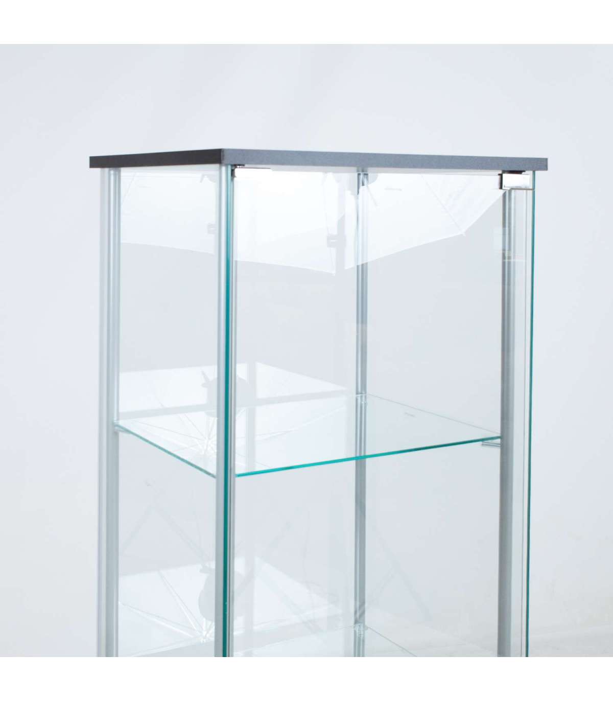 Õhulise klaasist vitriinkapi küljepostideks on hõbedased metalltorud. Vitriinkapi alus ja katus on valmistatud mustast lamineetplaadist. Kõik seinad, uks ja 3 vaheriiulit on tehtud 5mm karastatud klaasist.