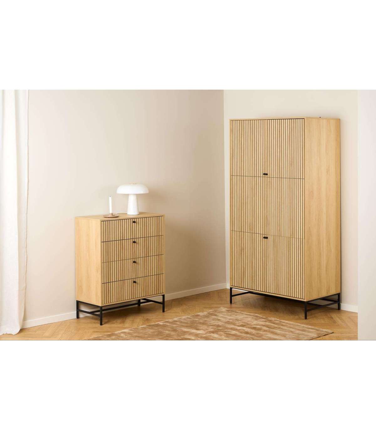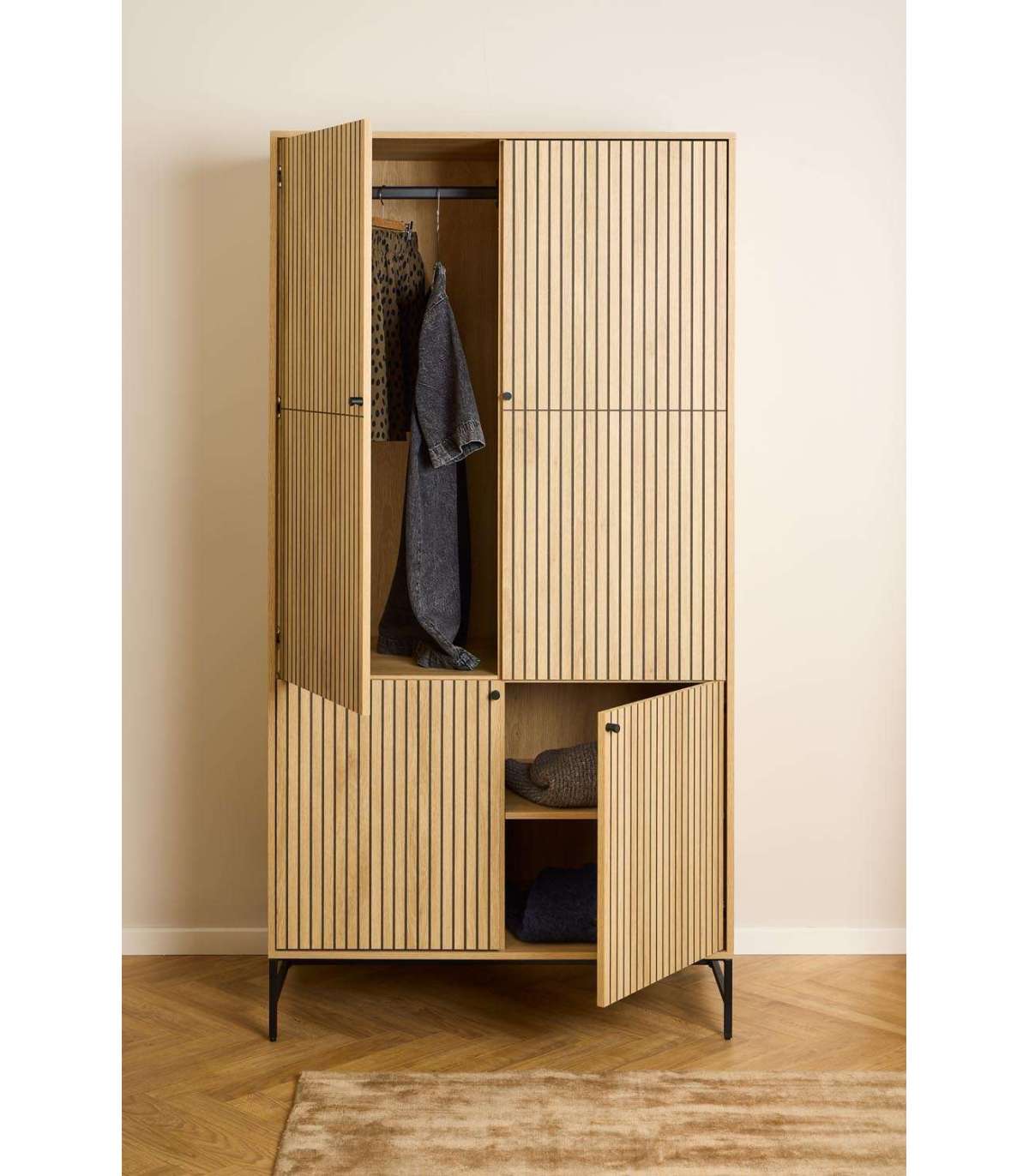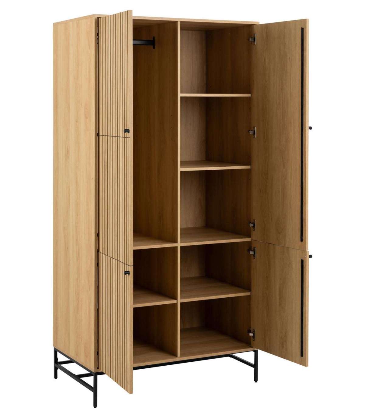 Kapp köidab tähelepanu tänu oma suurepärasele disainile. Kapis on piisavalt palju hoiuruumi. Kergesti hooldatav pind. Riidekapp on valmistatud tamme melamiinist. Alus on valmistatud mattmustast pulbervärvitud terasest. Mõõdud 99x60xH200cm.