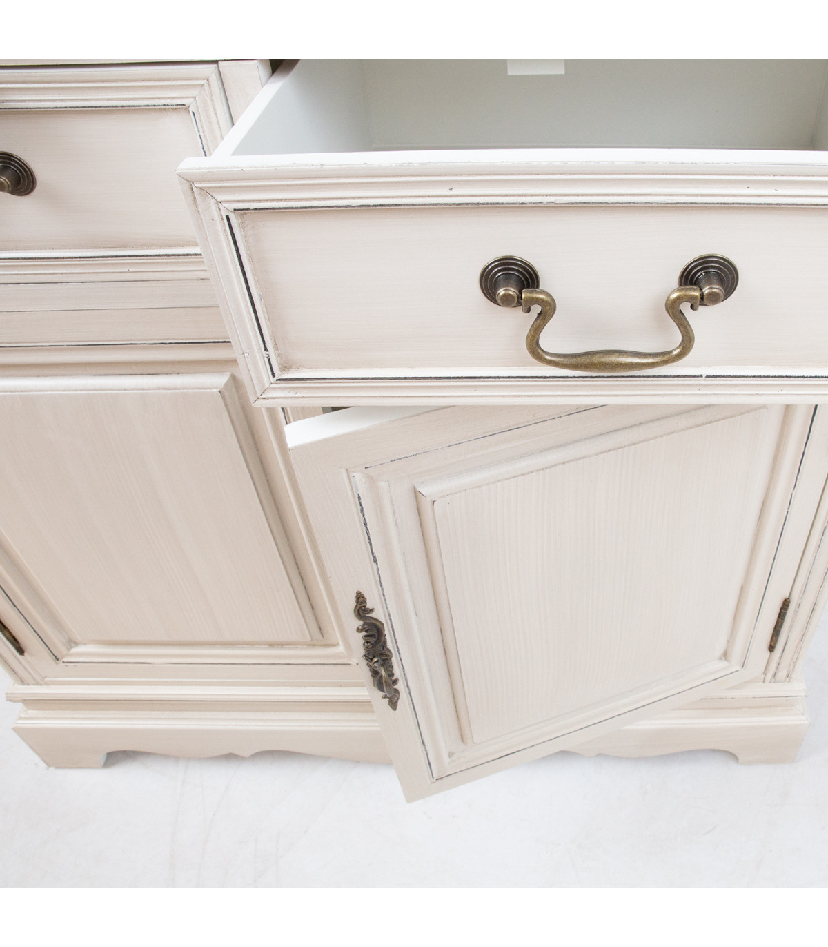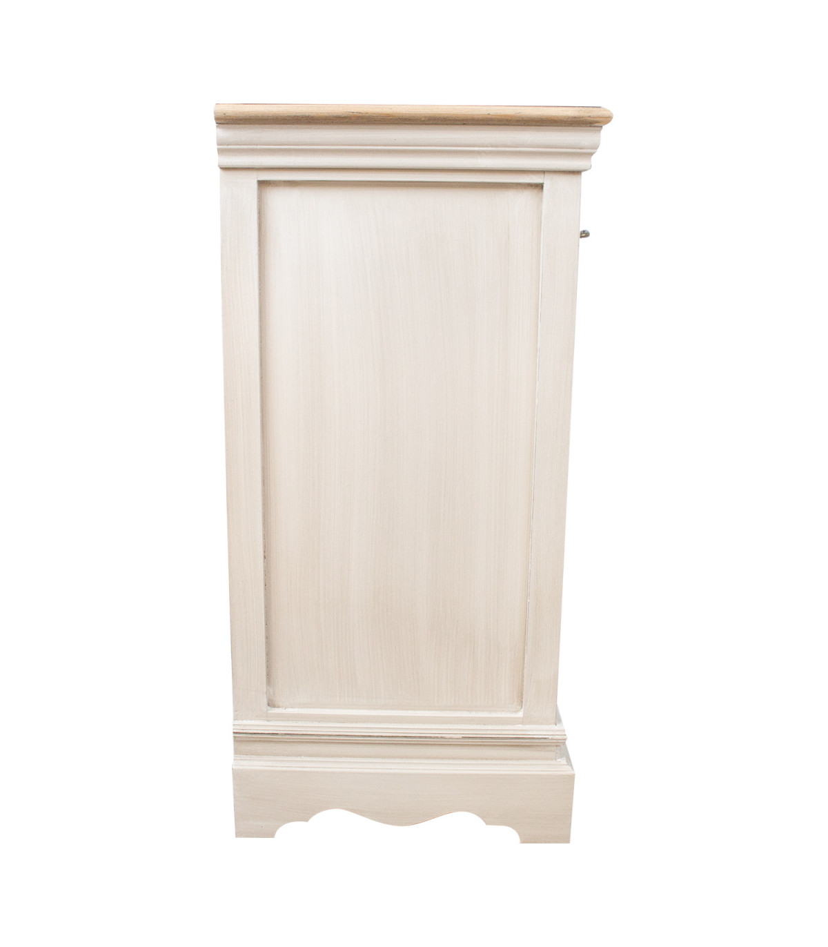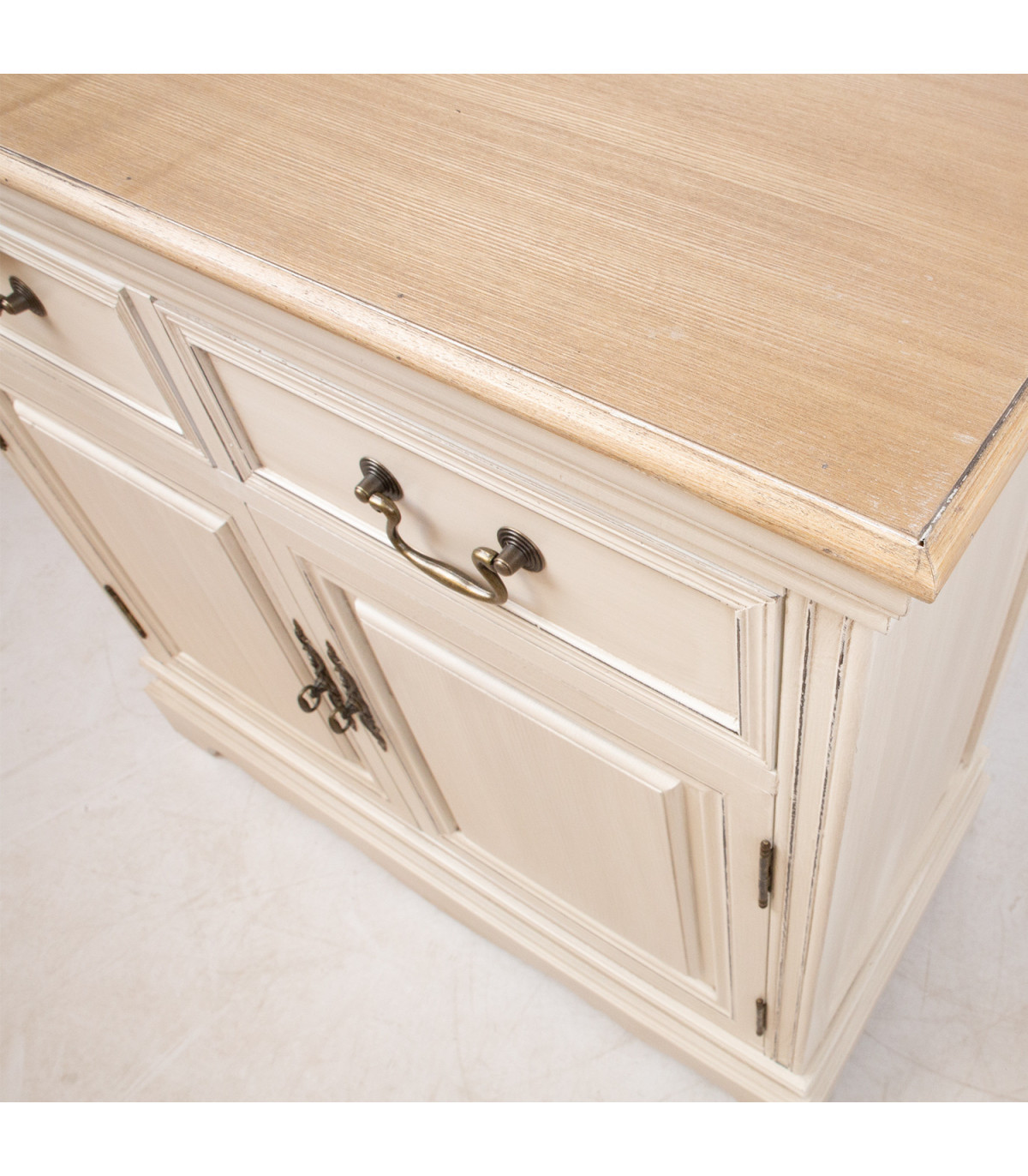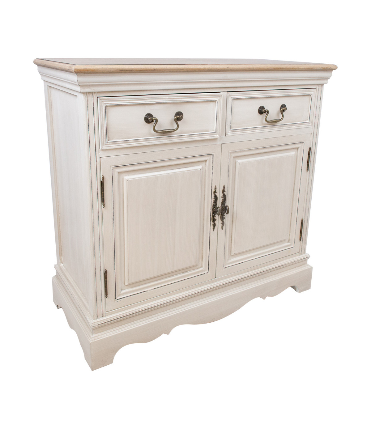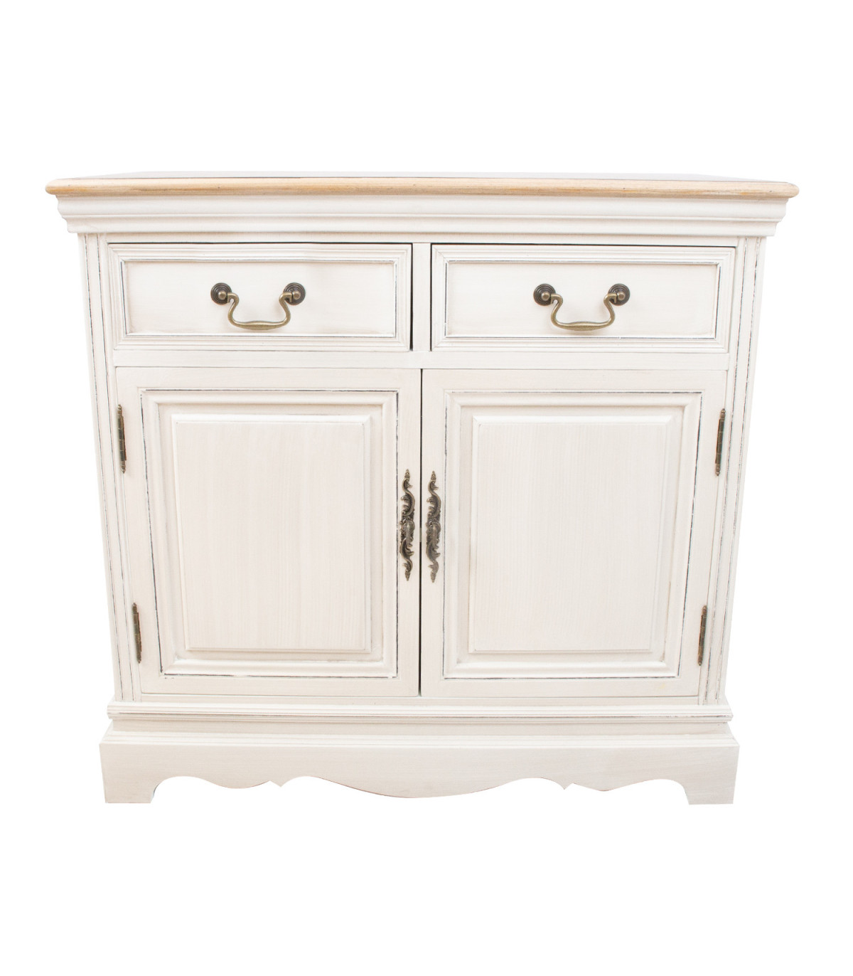 Kummut SAMIRA 2-ukse ja 2-sahtliga, 85x39xH82cm. Pealmine plaat: antiikpruun, raam/sahtlid: antiikvalge. 2 sahtlit ja 2 kapiust metallist käepidemetega. Sahtlid ilma siinideta. 2 ukse taga on kapis 1 riiul. Laineline sokliäär. Puit: saar, paulownia, viimistlus: värvitud.