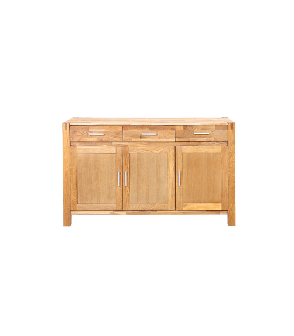 Kummut CHICAGO NEW 140x44xH86cm, tamm. Kummuti karkass on valmistatud täispuidust. Pealmine plaat: 19mm MDF, küljepaneelid ja sahtlite esipaneelid: mööbliplaat. Kummut on kaetud naturaalse tammespooniga. Kummutil on kolm sahtlit ja 3 ust. Kappide sees on üks vaheriiul. Uste ja sahtlitel on alumiiniumist hõbedased käepidemed.