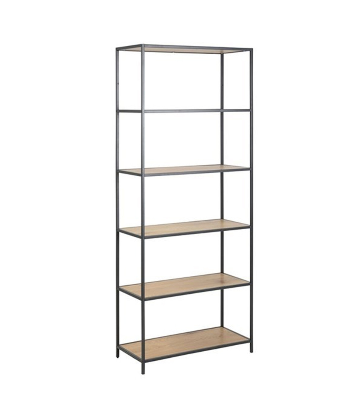Riiul SEAFORD 77x35xH185cm, metsik tamm. Maitsekat ja praktilist riiulit on võimalik kasutada erinevates ruumides asjade mugavaks hoiustamiseks. Riiulid on valmistatud lamineeritud kattega mööbliplaadist. Värvus on metsik tamm. Raam on valmistatud musta värvi metallist. Toote mõõdud on 77x35xH185cm.