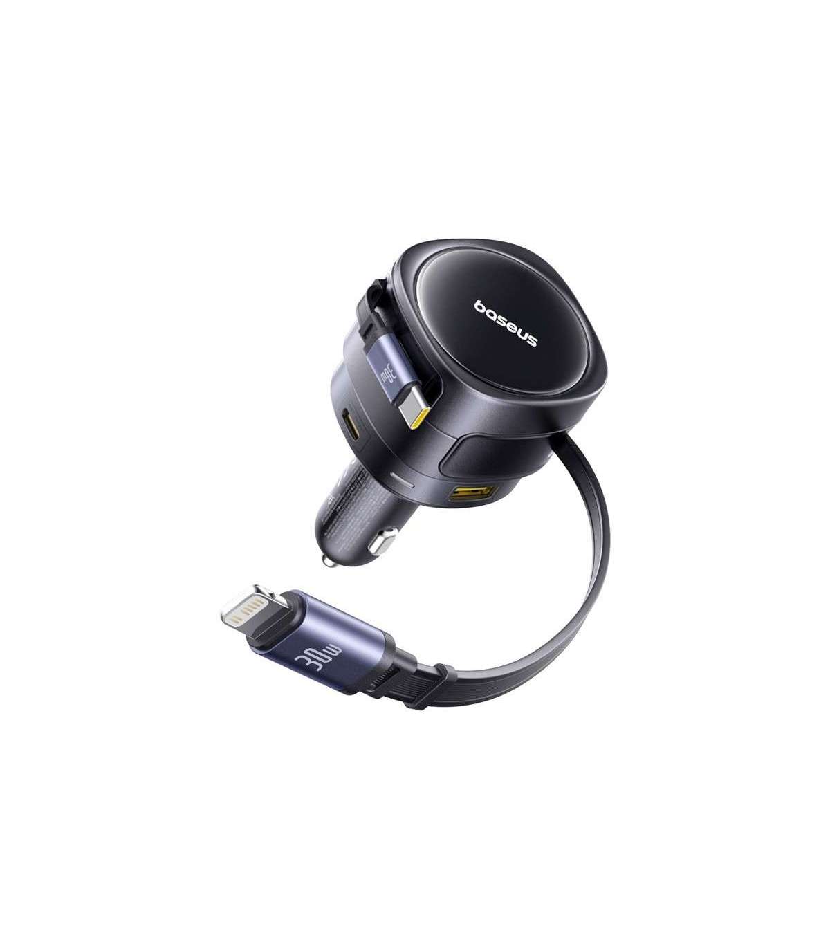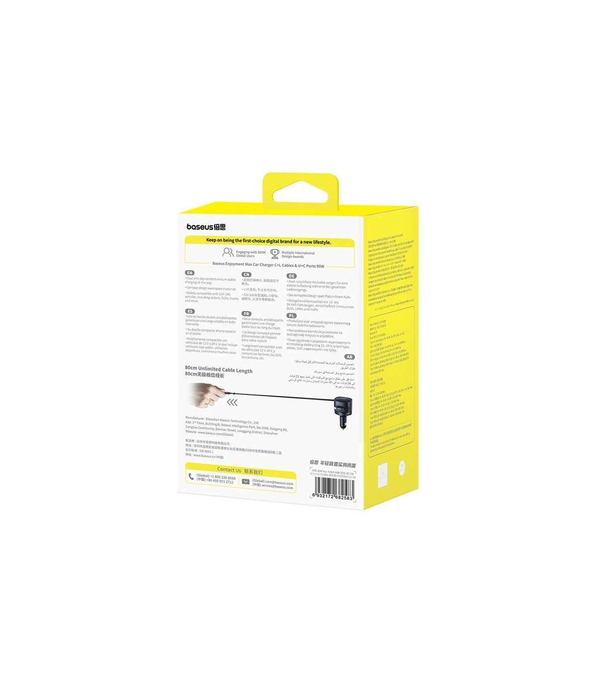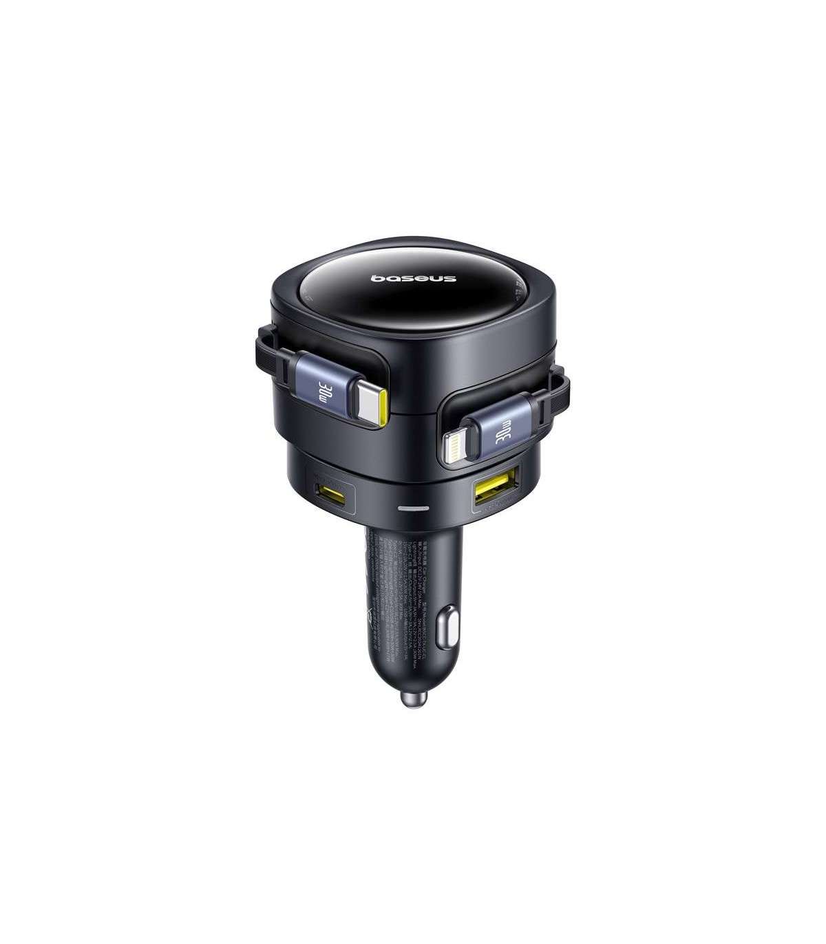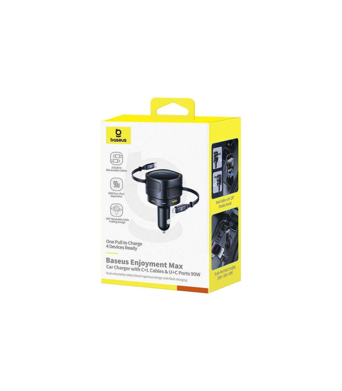 The Baseus car charger with two built-in cables (USB-C and Lightning) and two additional ports (USB-C and USB-A) allows you to charge up to four devices simultaneously with a total power of up to 90 watts. The integrated safety system, swivel design and 12-24 volt compatibility ensure reliability in any vehicle.