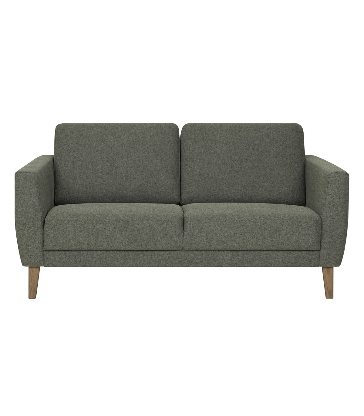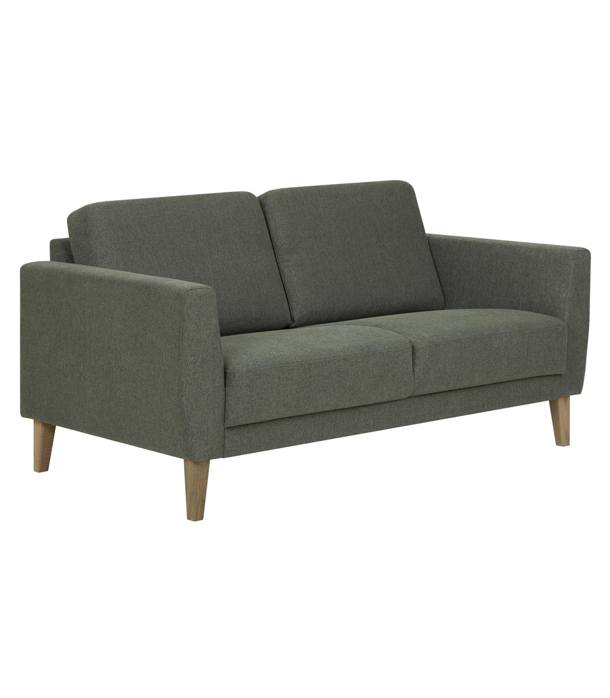 Диван LANDO 2-местный, зеленый. Неподвижные подушки сидений покрыты полиэстеровой тканью плотностью 130 г/м2. Чехол не съемный. Подушки сиденья изготовлены из пены 20 мм 35 кг/м3 и 80 мм 35 кг/м3. Подушки спинки двусторонние, чехлы съемные. Подушки спинки обтянуты тканью из полиэстера плотностью 300 г/м2. Подушки спинки изготовлены из пеноматериала толщиной 125 мм плотностью 15 кг/м3. Каркас изготавливается из массива дерева, фанеры, ДВП и ДСП. Каркас покрыт пенопластом 6мм 20кг/м3. Верхняя часть подлокотников покрыта пеной толщиной 30 мм плотностью 35 кг/м3 и тканью из полиэстера плотностью 130 г/м2. У дивана четыре квадратных ножки из дерева. Цвет ножек дымчатый дуб. Размеры ножек 5,5x3,5xH16см. Размеры изделия 158x89xH80см.