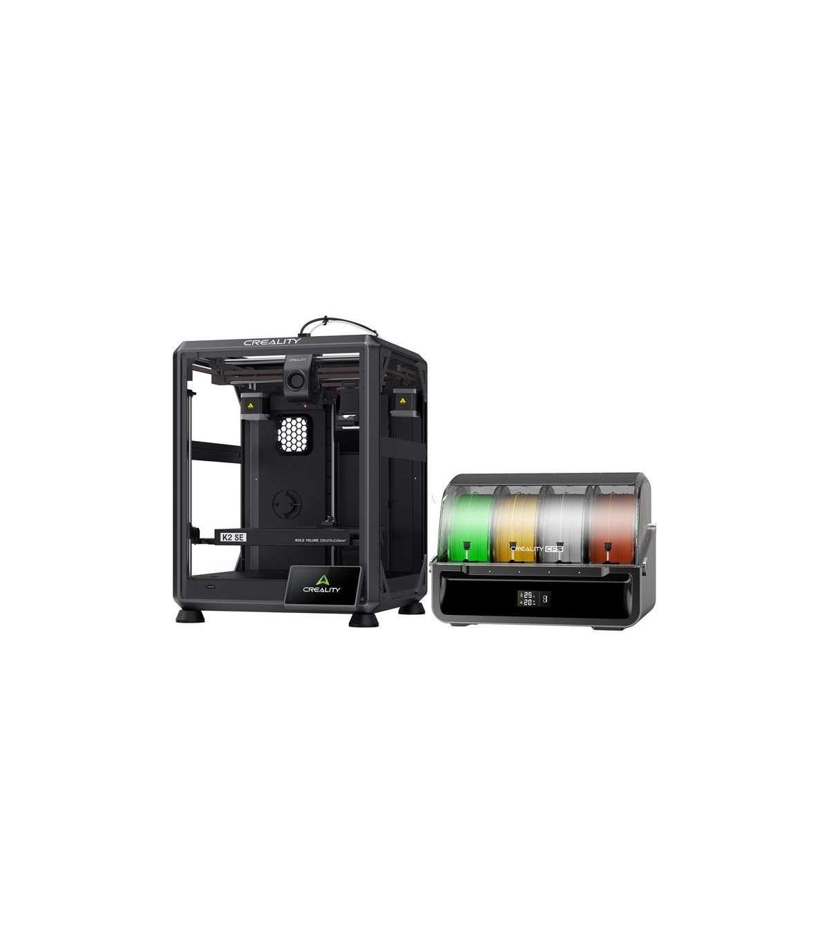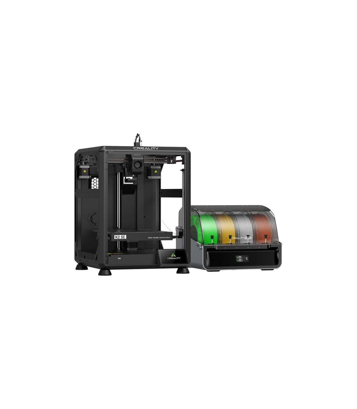 In the Creality K2 SE Combo version, the printer comes with a CFS (Creality Filament System) module, which expands the device’s capabilities with convenient multi-filament management. The system allows for the simultaneous installation of four spools of material, enabling the printer to automatically switch filaments during operation. This solution is ideal for printing multicolored models or when one material runs out—the device automatically begins feeding the next spool.