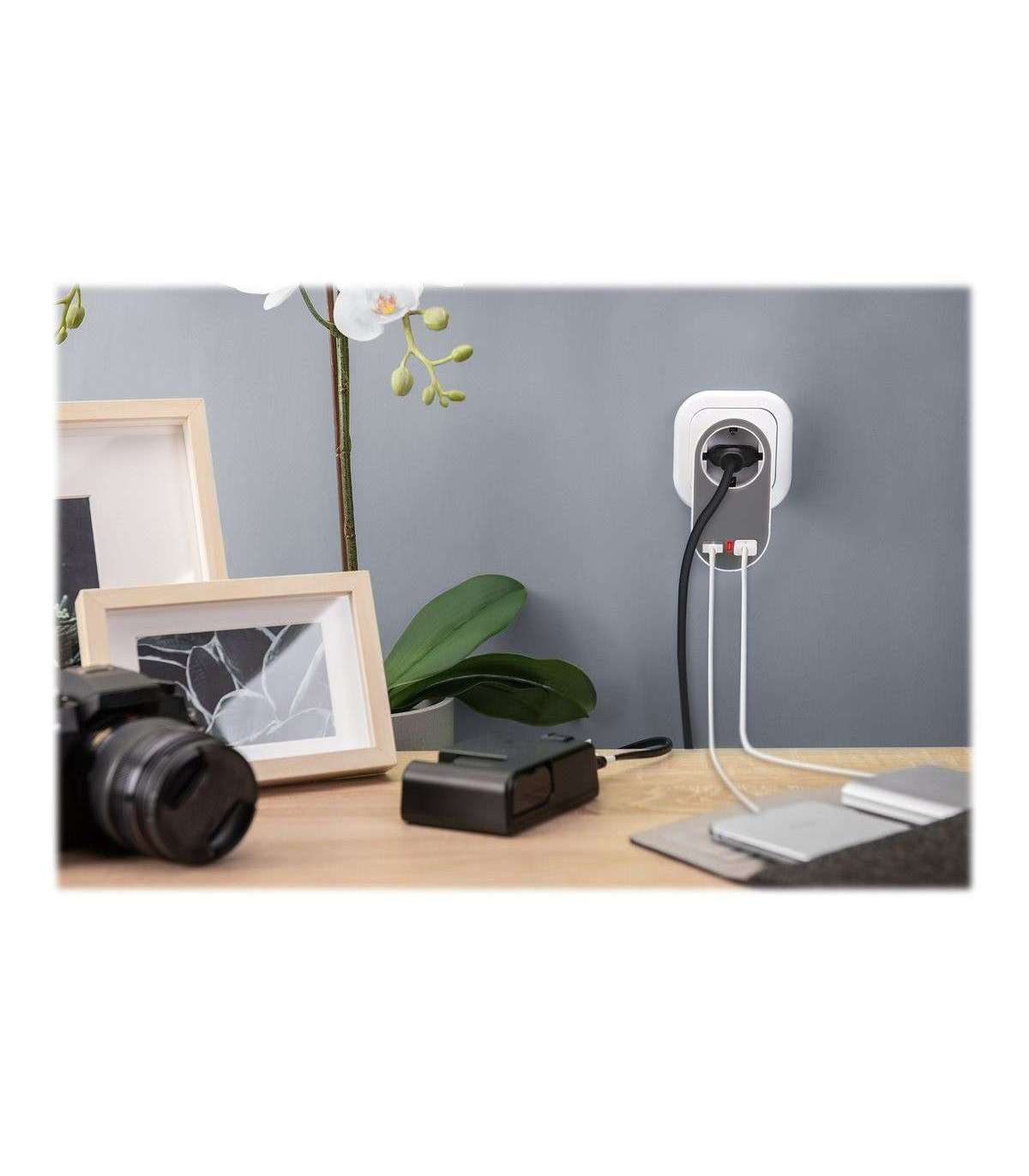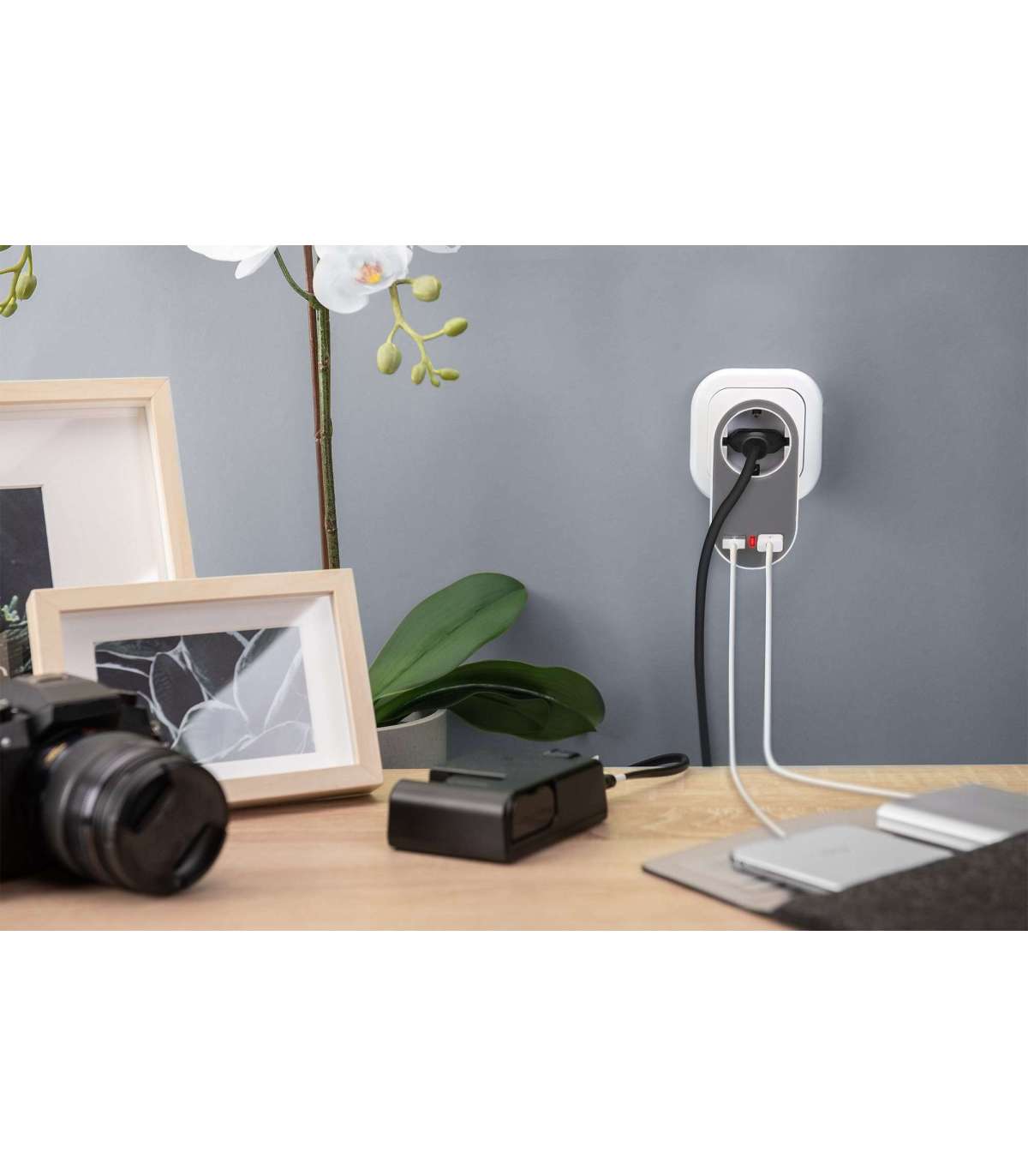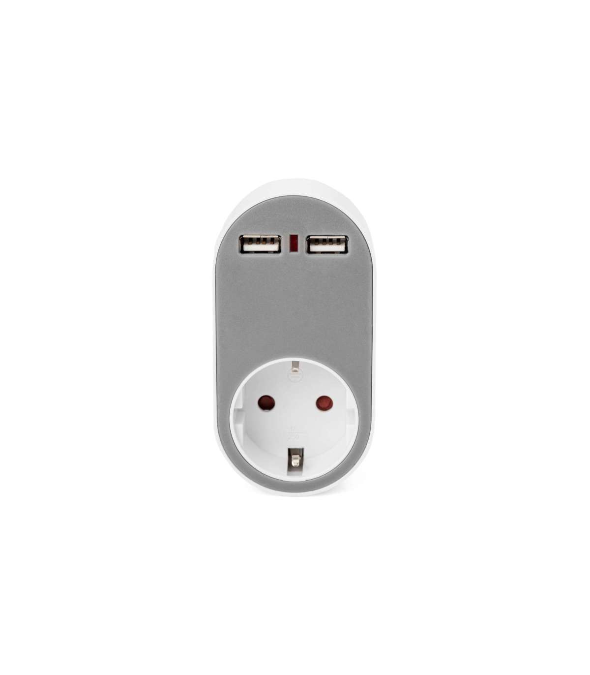 - Universal USB Plug-in Charger with 2 x USB-A Sockets and Integrated Socket