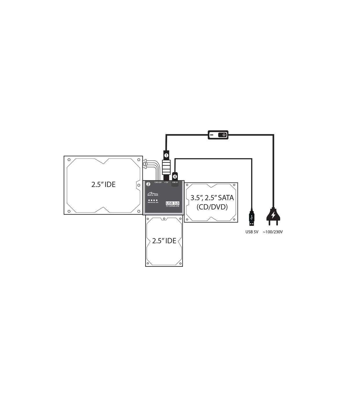 MT5100 on multi-adapter igat tüüpi IDE (2,5" ja 3,5") ja SATA I-III liidestega kõvaketaste ja optiliste draivide lihtsaks ühendamiseks arvuti USB 3.0 porti. Saate korraga ühendada kuni kolm seadet ja kopeerida andmeid nende vahel. Toitekaabli käsitsi lüliti tagab seadmete ohutu ühendamise ja lahtiühendamise.