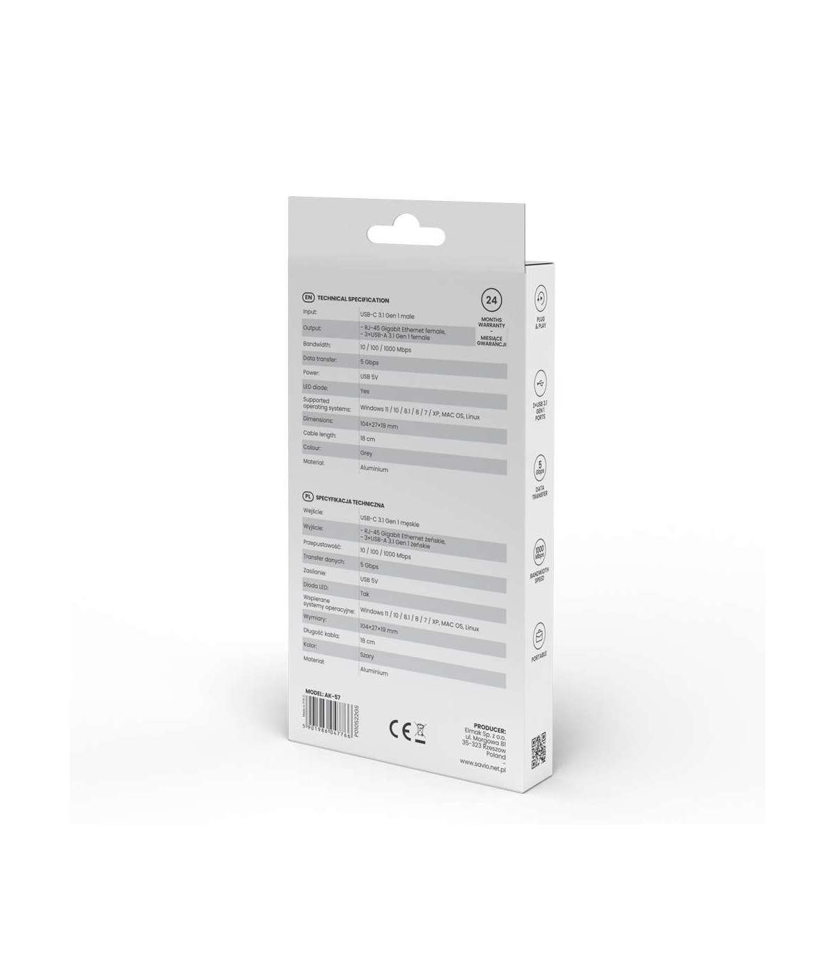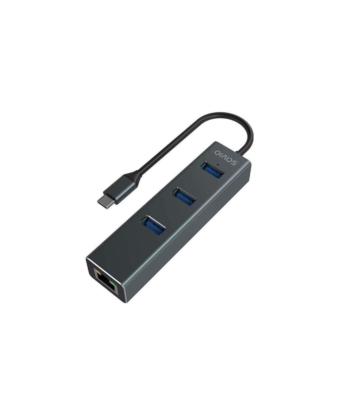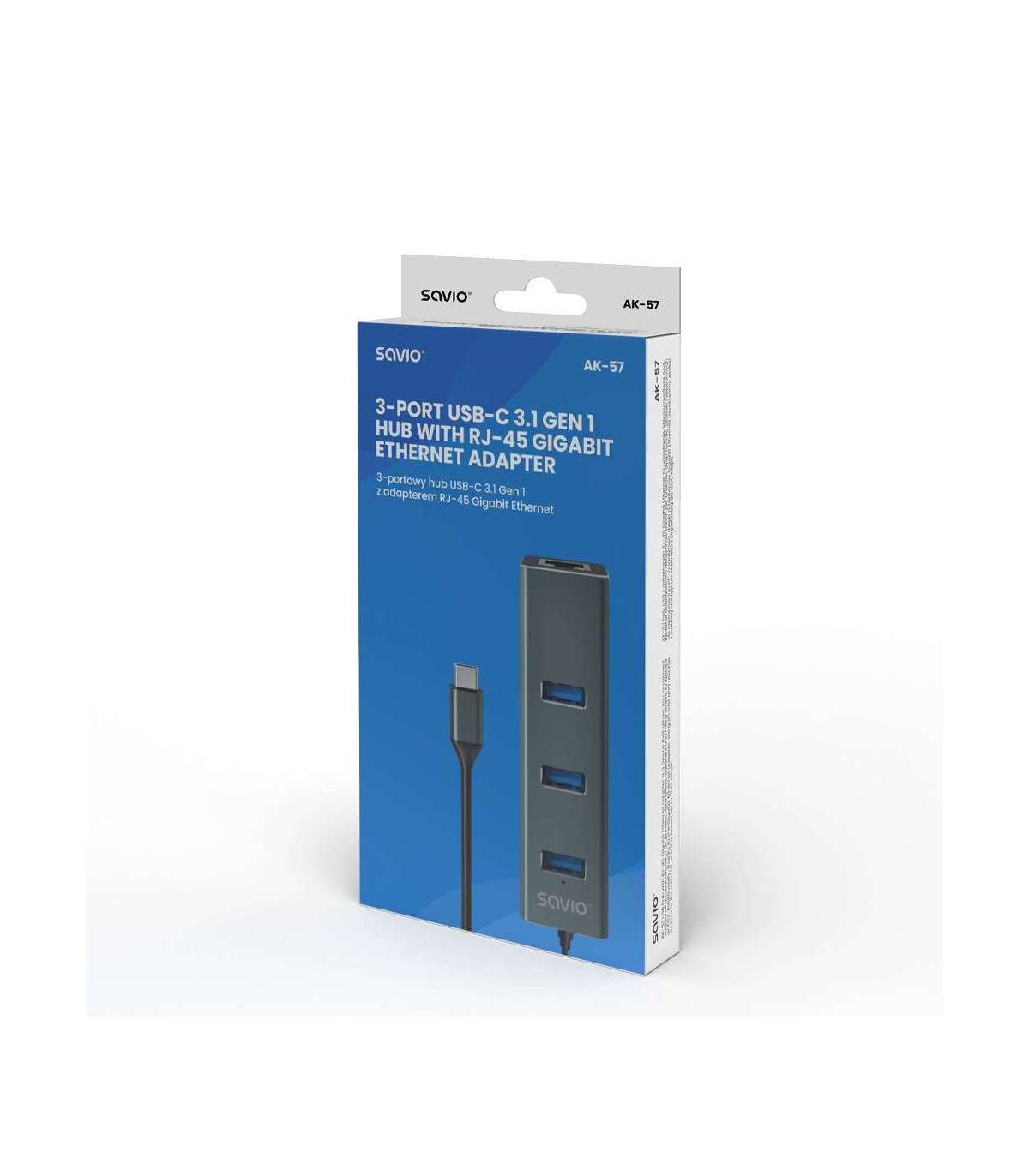 Savio AK-57 USB-C - 3 x USB-A HUB with RJ-45 Gigabit Ethernet adapter, 5000 Mbit/s, grey