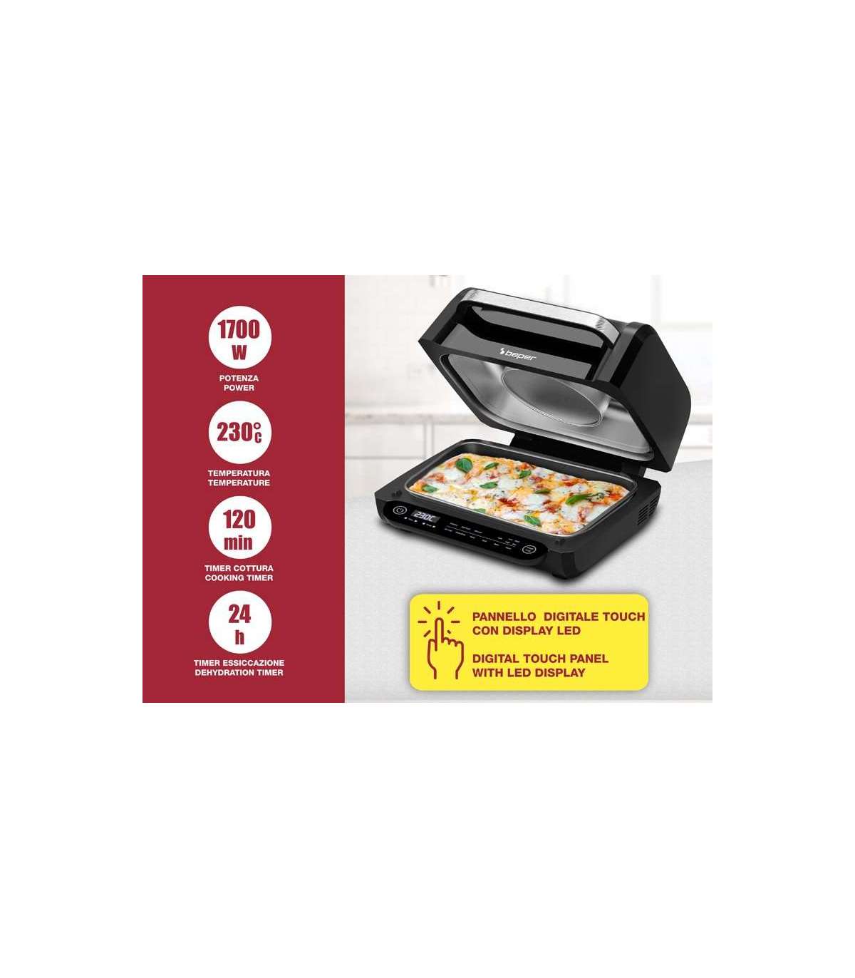 Reguleeritavad seadistused: Temperatuur kuni 230°C; taimer kuni 120 minutit (küpsetamine) ja 24 tundi (kuivatamine).