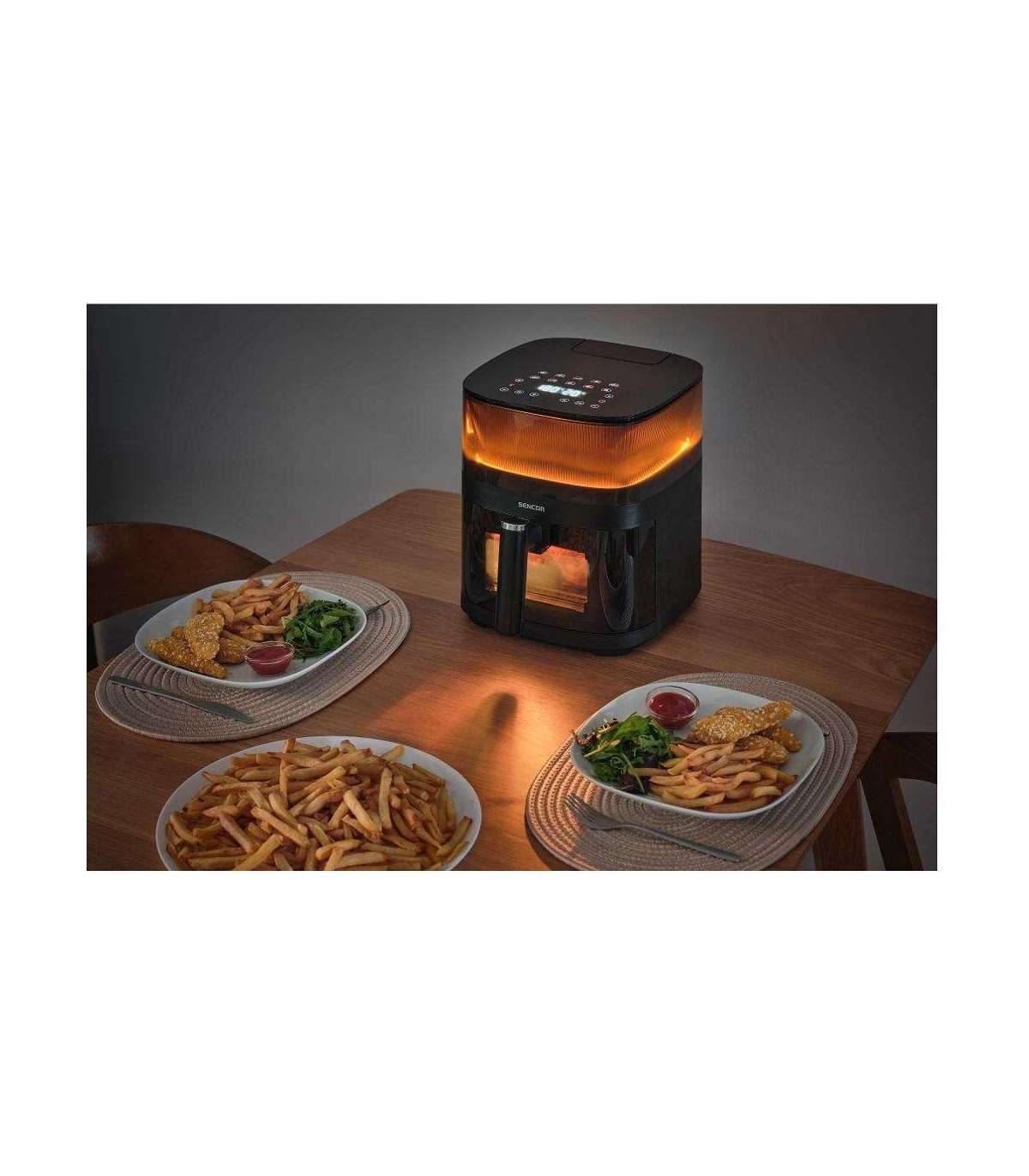 The Sencor hot air fryer SFR5050BK with water spraying function and stylish decorative lighting!