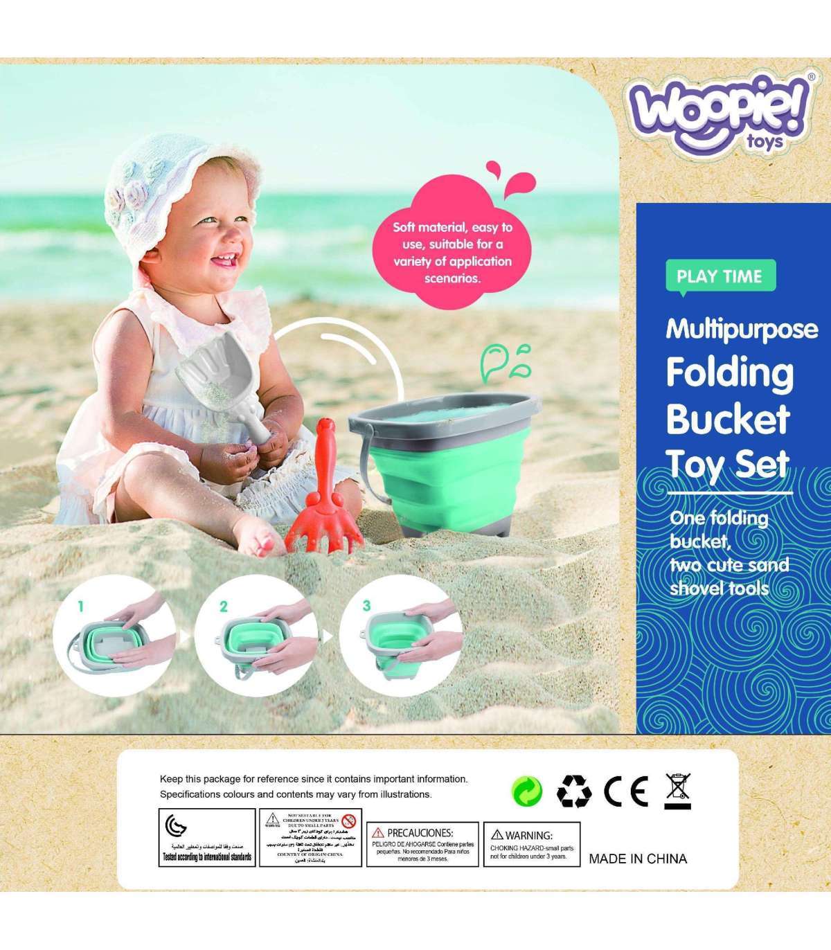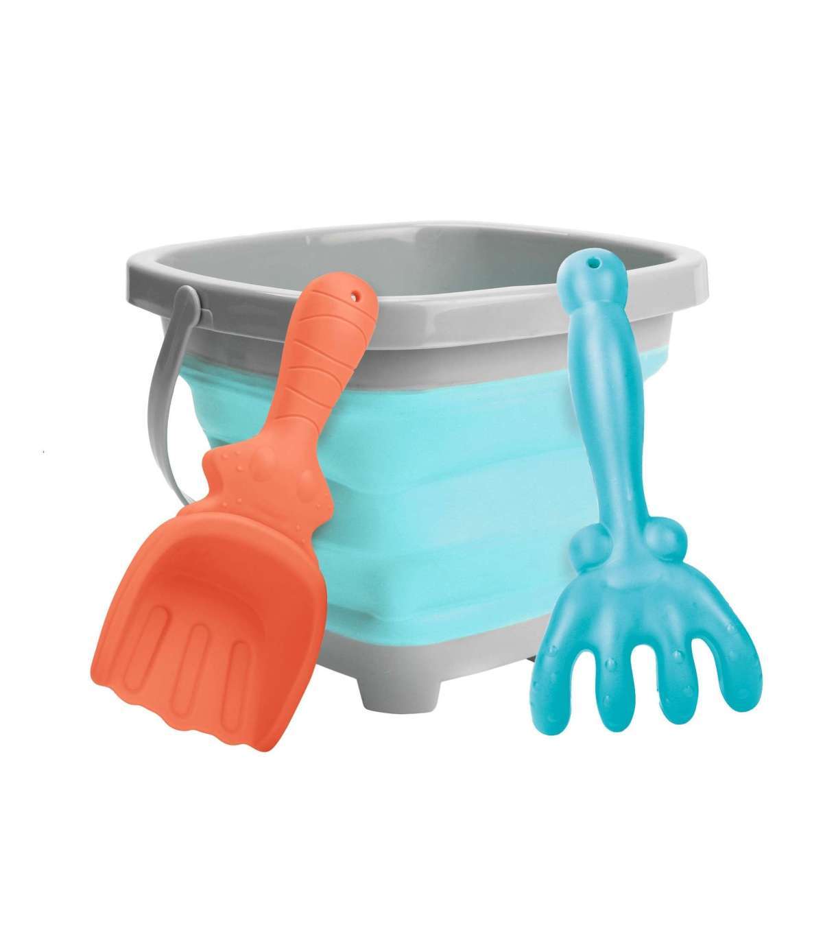 Силиконовое ведерко с граблями и лопаткой от бренда WOOPIE. Фантастическое ведерко для песочницы, пляжа или сада, благодаря которому дети приятно проведут время на свежем воздухе. Ведро, благодаря складной конструкции, занимает мало места, его легко транспортировать и удобно хранить. Набор поместится в детский рюкзачок, коляску или пляжную сумку. Верхняя часть, дно и ручка ведерка пластиковые, а стенки выполнены из толстого силикона, сложенного гармошкой. Грабли и лопатка также пластиковые.