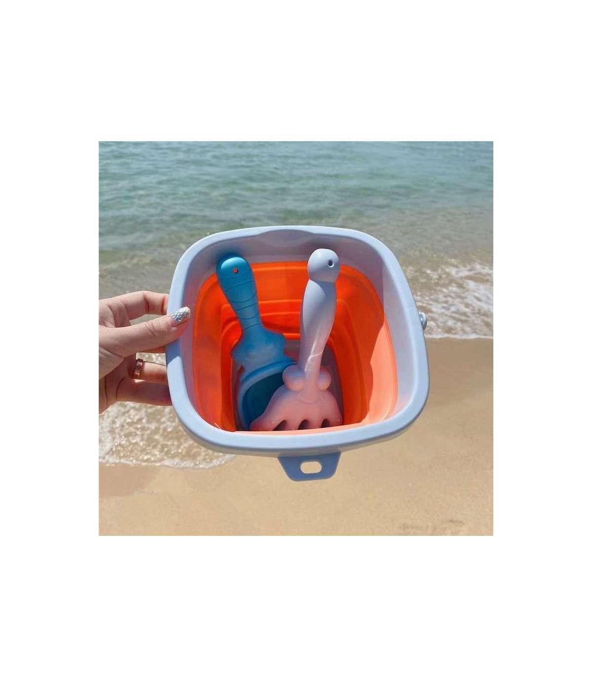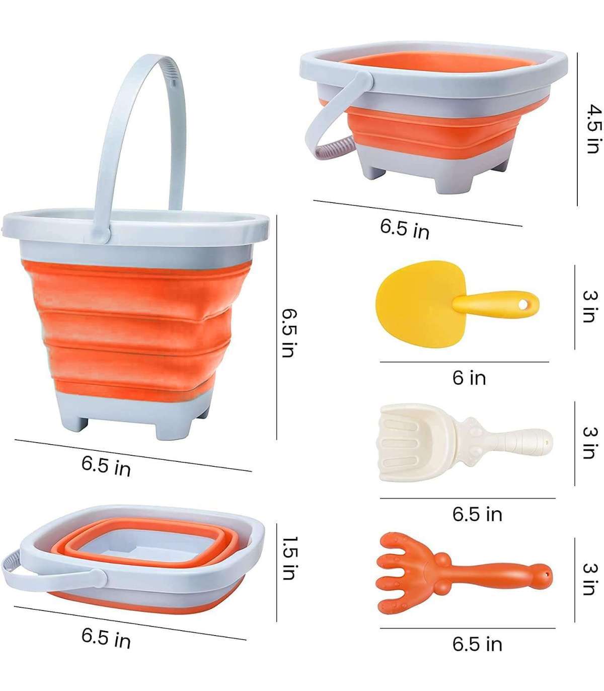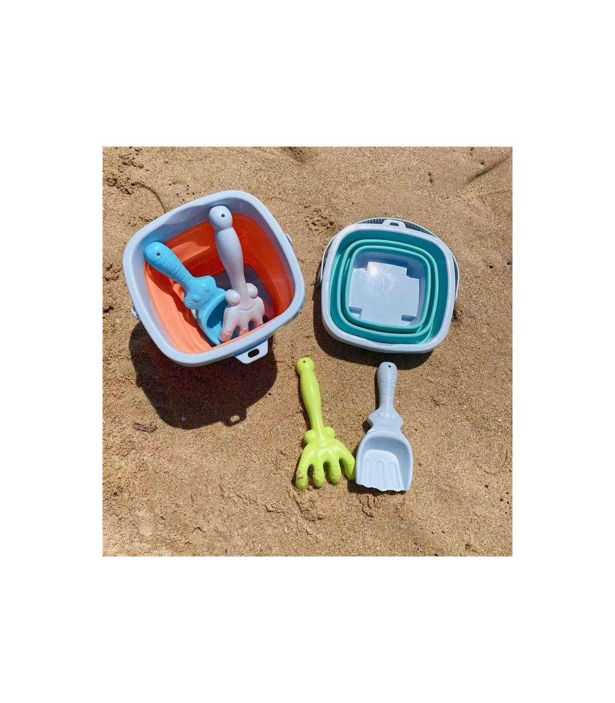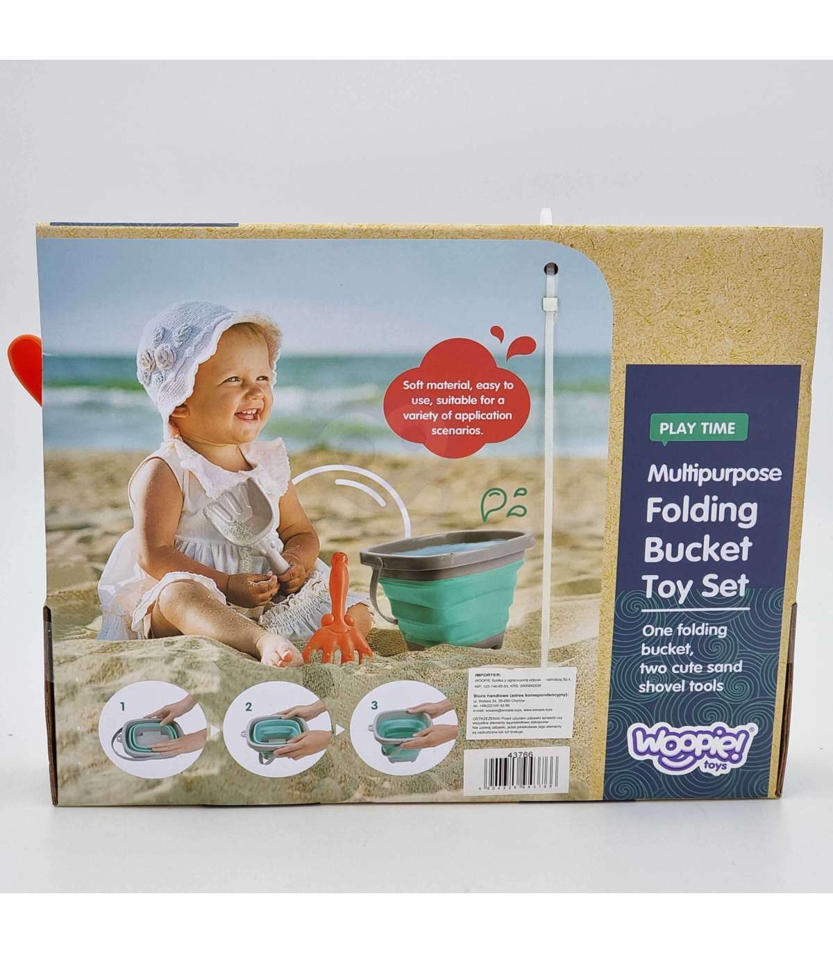 Силиконовое ведерко с граблями и лопаткой от бренда WOOPIE. Фантастическое ведерко для песочницы, пляжа или сада, благодаря которому дети приятно проведут время на свежем воздухе. Ведерко, благодаря складной конструкции, занимает мало места, легко транспортируется и удобно для хранения. Набор помещается в детский рюкзак, коляску или пляжную сумку. Верх, дно и ручка ведерка пластиковые, а стенки выполнены из толстого силикона, складывающегося гармошкой. Грабли и лопатка также пластиковые.