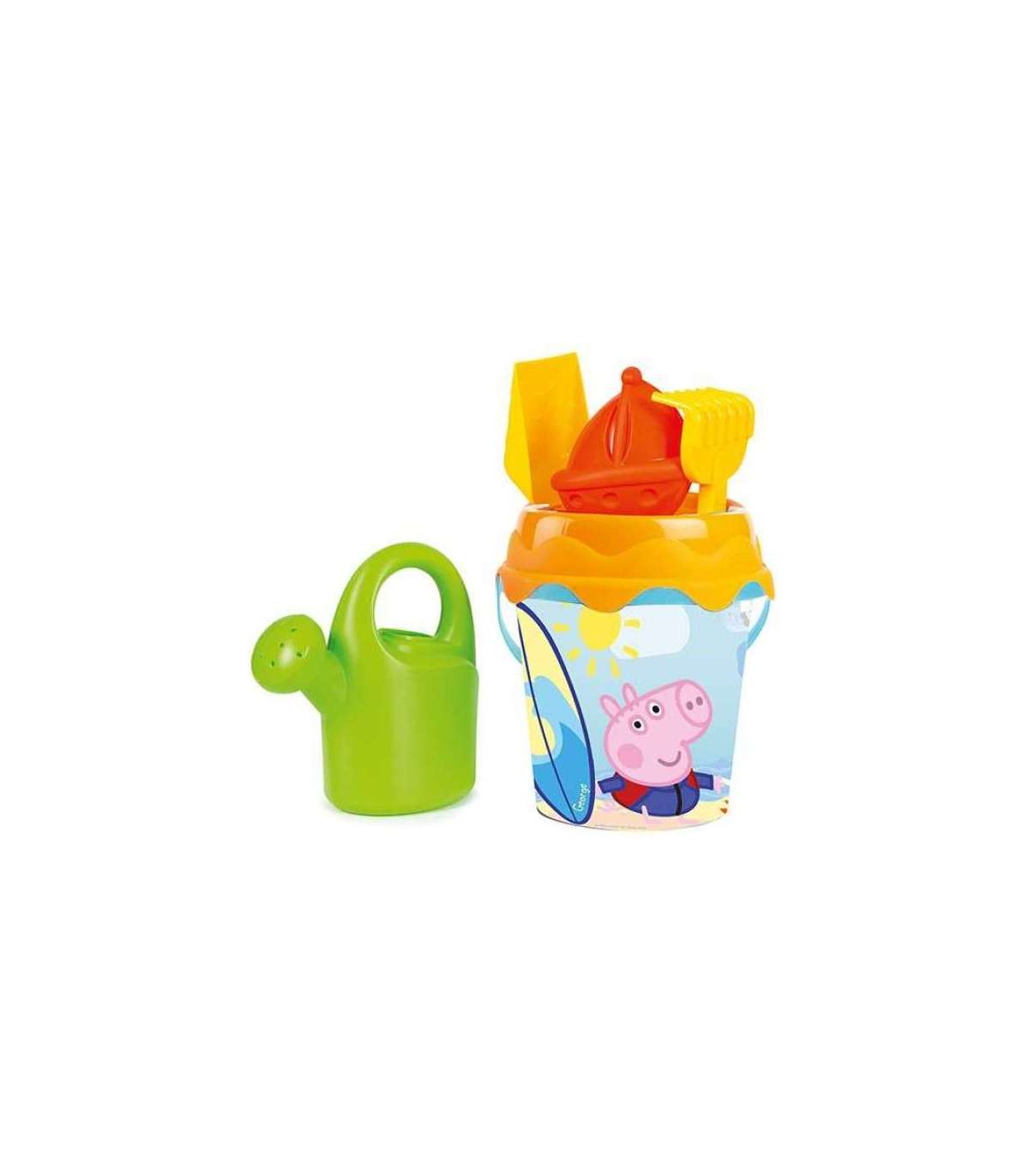 Набор для песка с мотивом Свинка Пеппа бренда Smoby — отличное дополнение к любой песочнице. В комплект входит ведерко, украшенное изображением персонажа Джорджа, сито, которое также выполняет функцию крышки, лопатка, лейка, грабли и красная лодка. Крышка ведерка имеет специальные отверстия, в которые можно вставить грабли и лопатку.