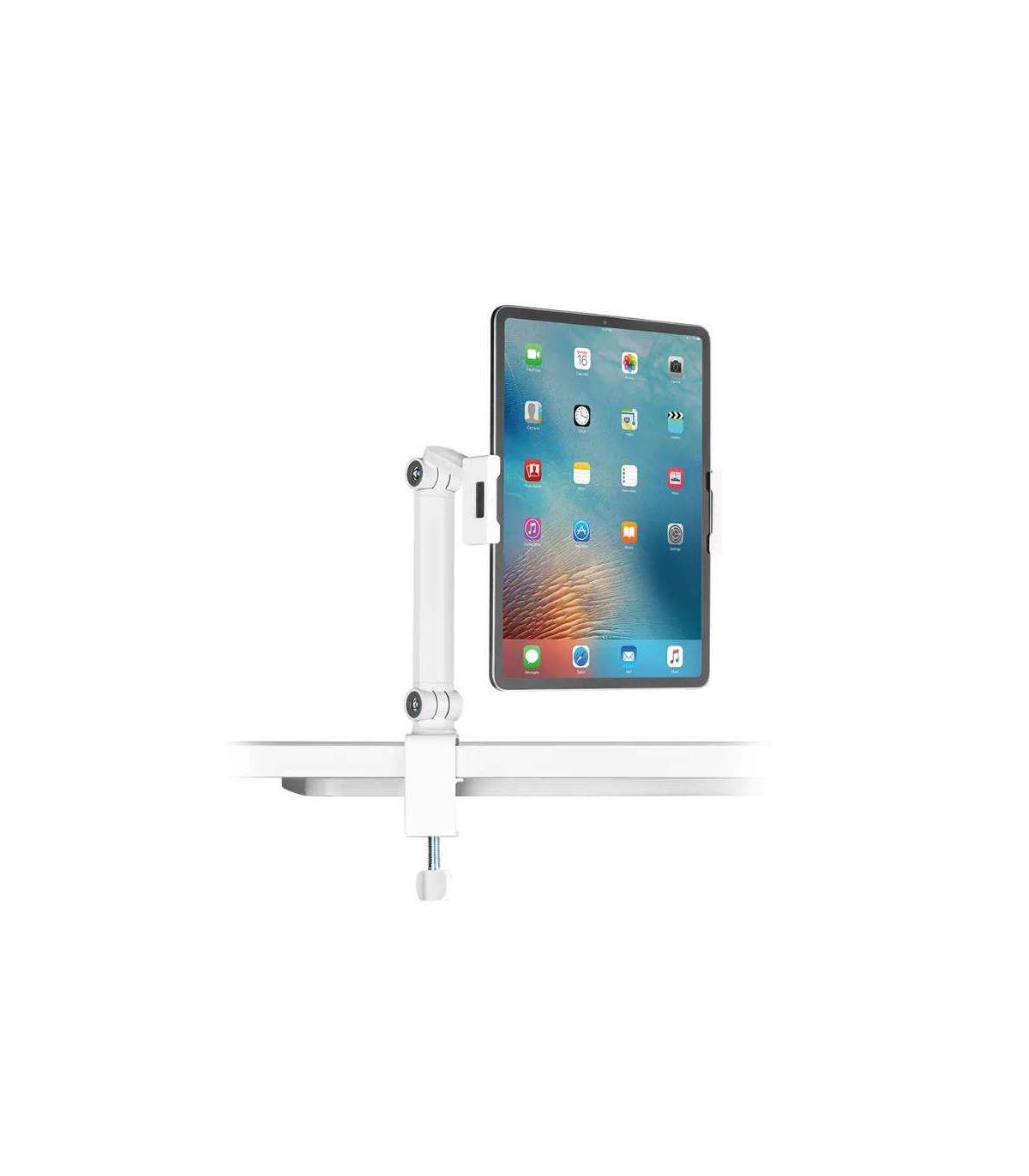 The Neomounts DS15-545WH1 is an universal tablet mount for tablets from 4,7" up to 12,9" with a weight capacity of 1 kg. The tablet mount has 3 pivoting points and is ideal for hands-free video calling, watching a movie, playing a game or to use a tablet as a second screen.  The integrated ball joint allows the mount to rotate 360° so you can switch between portrait and landscape position. Additionally, the clever tilt (270°) and swivel (104°) options allow the stand to further change to the ideal viewing angle. Soft rubber pads protect your device from any scratches and the solid base with anti-skid silicon pads ensure solid positioning of your device