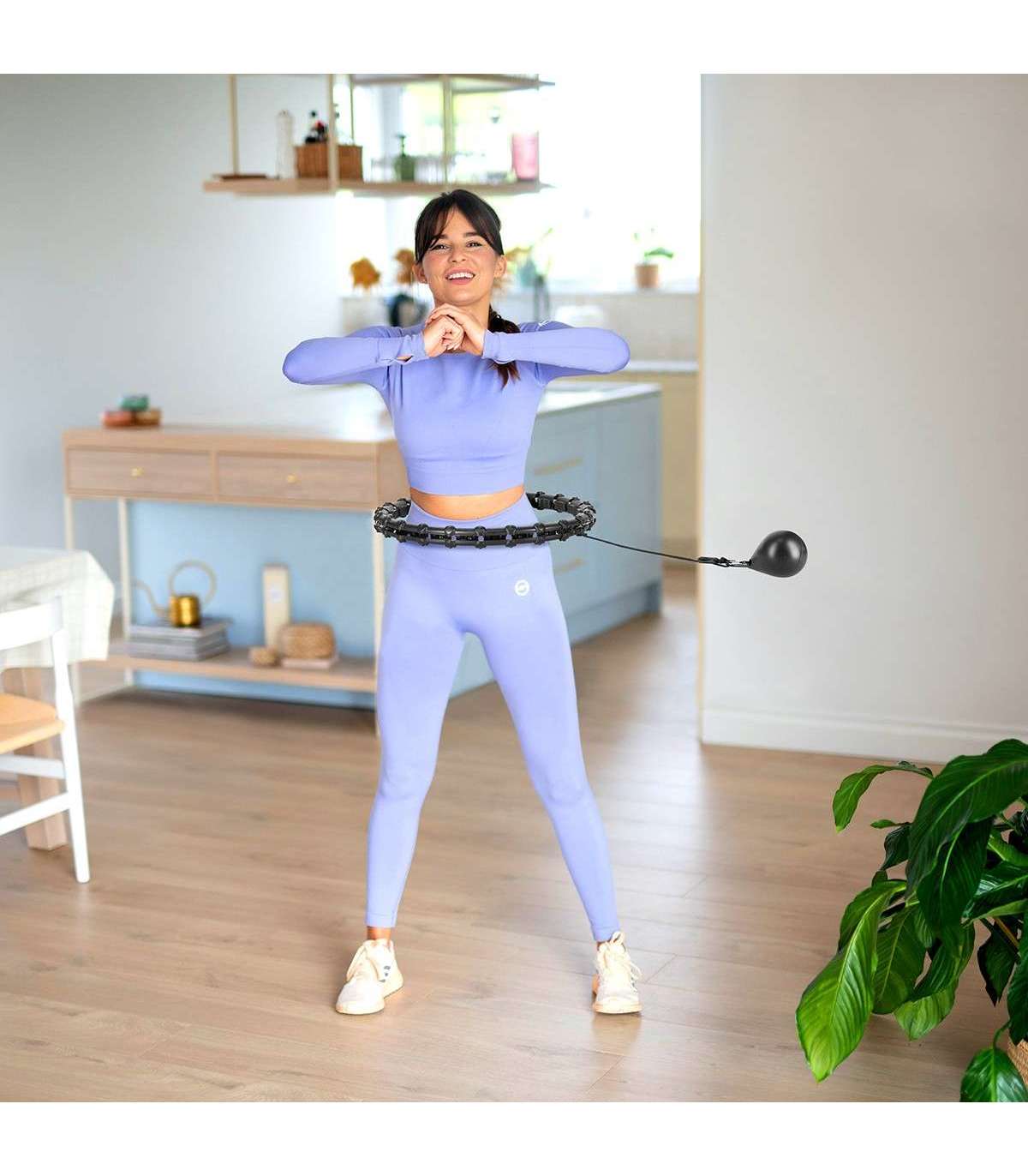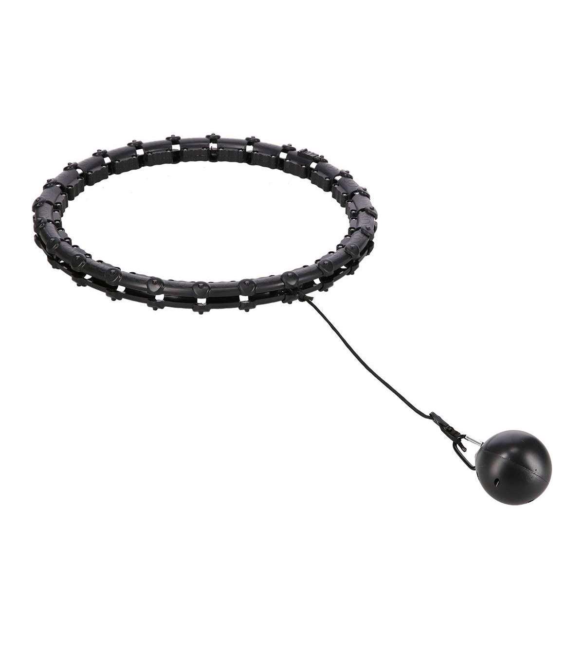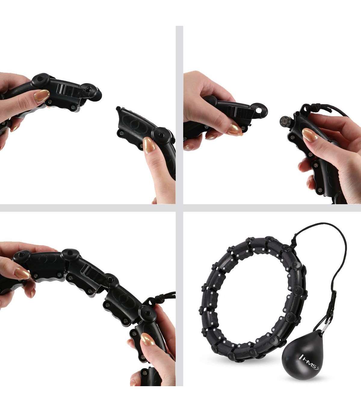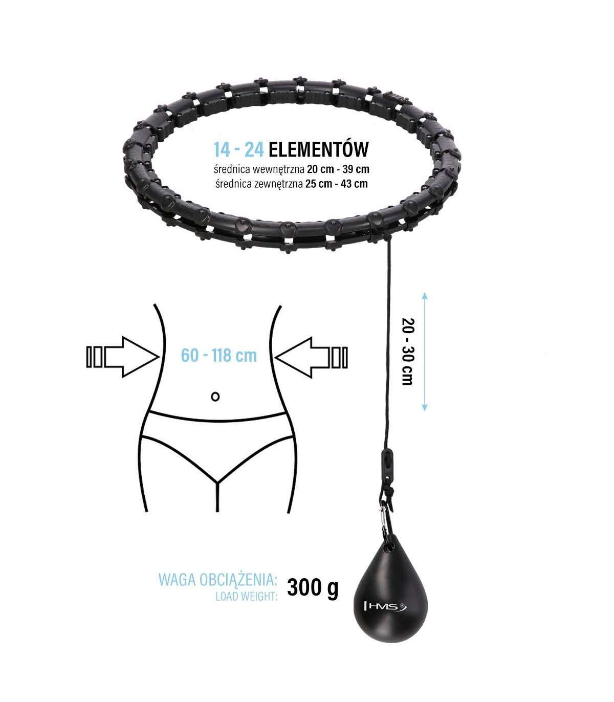 HHW02 HULA HOP BLACK WITH WEIGHT HMSHHW02 HMS is an adjustable hula hoop with a gravity ball for fitness. It allows for simultaneous training and 360-degree waist massage. It is perfect for strengthening and firming the muscle corset, among other things. Thanks to the adjustable circumference, the HHW02 will never fall off during exercise, so home cardio training can be long and enjoyable. The device is dedicated to children and adults.How does HHW02 work?The operation of HHW02 is very simple and intuitive. It is a closed loop that has a rail with an attached gravity ball (weight). During circular movements of the hips, centrifugal force begins to act, which moves the gravity ball along the circle, putting the abdominal muscles and torso in a state of tension.Training and massage in oneDuring a 360-degree movement, the heads located in each segment of the hula hoop alternately press on the body, causing an additional massage effect, providing a pleasant feeling. The three-dimensional massage technique quickly stimulates the muscles, and the built-in protrusions enhance the massage effect. You can adjust the intensity of the massage by rotating speed.Circumference adjustmentQuickly and easily reduce or increase the size of the circle by inserting or removing as many elements as you need. HHW02 has a total of 24 elements. The size can be set in the range of 14 to 24 elements, i.e. waist circumference from 60 to 118 cm. Thanks to this, the device will never fall off during training. Beginners can also use it.User comfortThe device has a high-quality construction made of ABS and PP materials. The rail is mounted on ball bearings made of stainless steel. All this together makes the rotation flexible and undisturbed, which further enhances the feeling of satisfaction during training. The gravity ball is filled with sand, which increases safety.Compact size and easy assemblyWe open the loop using clips. Then, to connect subsequent elements, insert one element into another so that the protrusions fit into the appropriate holes. When reducing elements, grab one element with one hand and squeeze it in such a way as to pull out protrusions from holes. Then insert the rail with a gravity ball into the loop and close the clips. Thanks to its compact size, HHW02 is easy to carry.With a belt, results will come fasterYour training will be more effective if you use our slimming belt BR163 during it. Such a combination will sculpt your figure even faster. Using a belt increases sweating during training, so we not only get rid of water from our body but also toxins, salts or some metals. BR163 also provides greater comfort.Benefits of training with hula hoopFirst of all, training with HHW02 will slim down your stomach and slim your waist. It will also contribute to reducing fat tissue from around your thighs and buttocks. Additionally, it will help strengthen your shoulder girdle and arms. Another advantage through strengthening abdominal muscles and torso will be a clear improvement in posture.Exercise effectsSlim waistFlat stomachCellulite reductionShapely armsFirm thighs and buttocksBetter blood flowImproved postureSpecification:Material: ABS + PPColor: BlackCircumference adjustment: 14 - 24 elementsWaist: 60 - 118 cmInner diameter: 20 cm - 39 cmOuter diameter: 25 cm - 43 cmWeight of the load: approx. 190 gLength of the strap with the load: 20 - 30 cmBall bearings, stainless steelConvenient fasteningBox size: length 25 cm x width 20.5 cm x height 9.2 cmRemarks:Not for commercial use24 months warrantyBelt BR163 not includedImporter: Abisal Ltd. | Poland | 41-807 Zabrze | Pyskowicka Street 17 | e-mail: abisal@abisal.plAbisal Ltd.. declares that the products sold by the company are safe and meet the requirements contained in the Act on General Product Safety of December 12, 2003. (Journal of Laws of December 31, 2003)